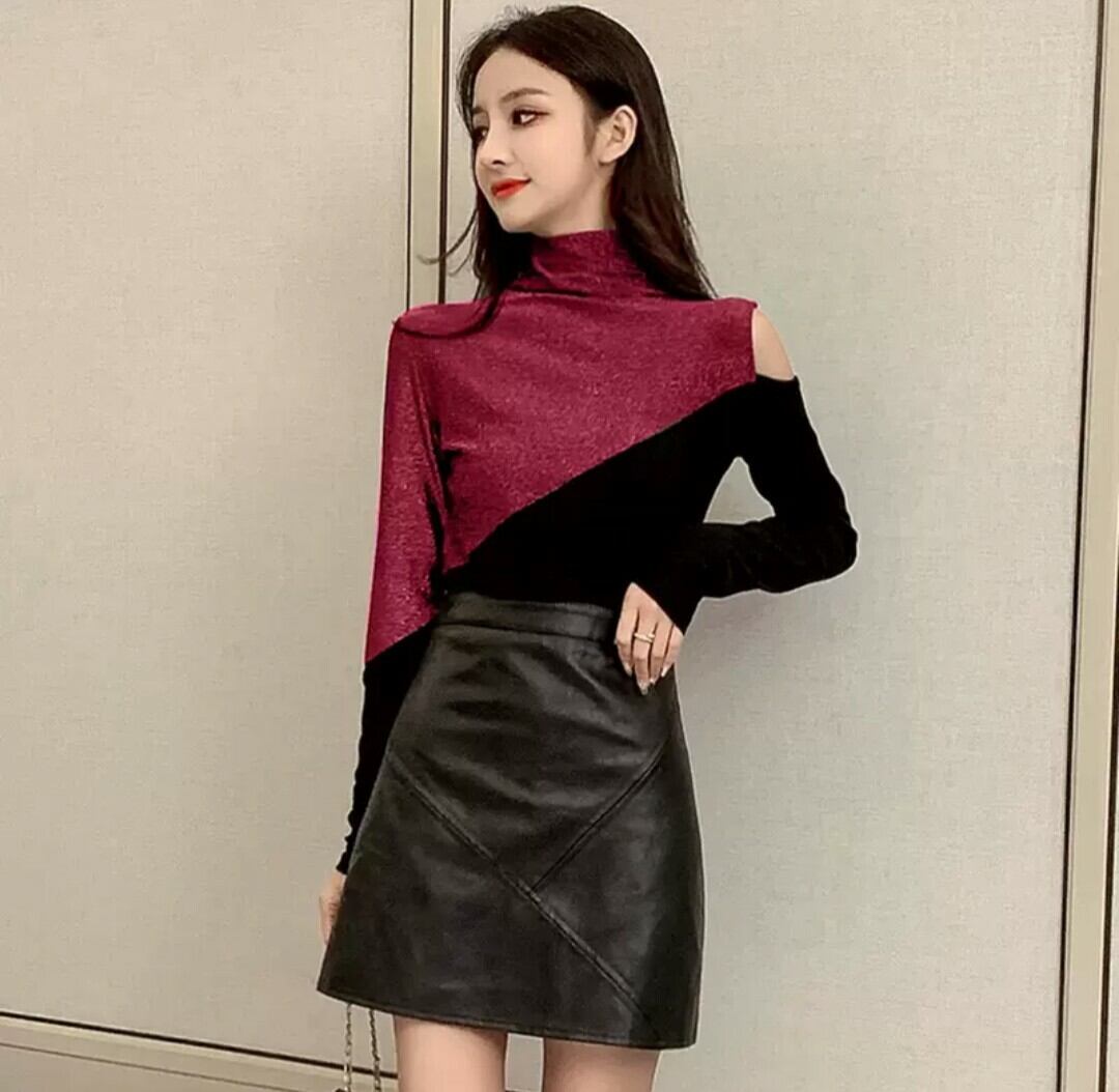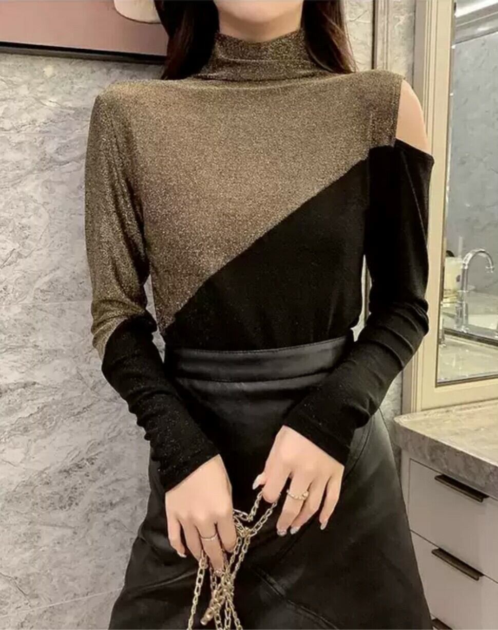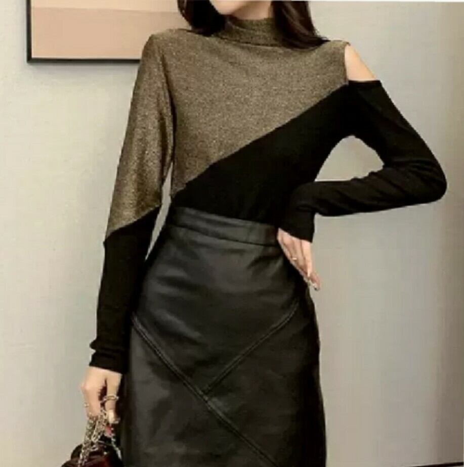 全2色 トップス オフショル バイカラー 秋冬 ゴールド レッド 片側 チラ見せ