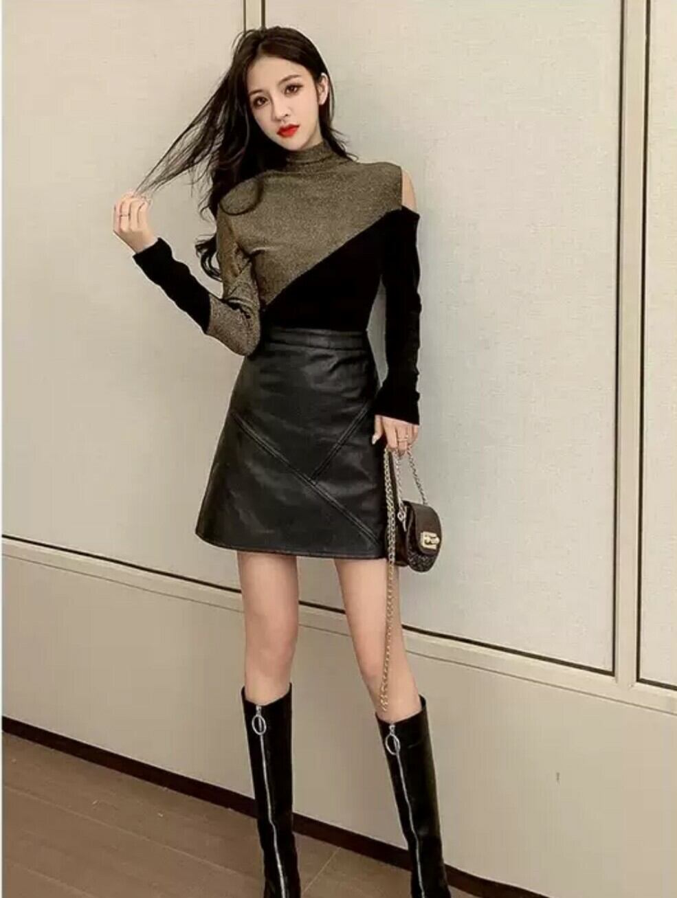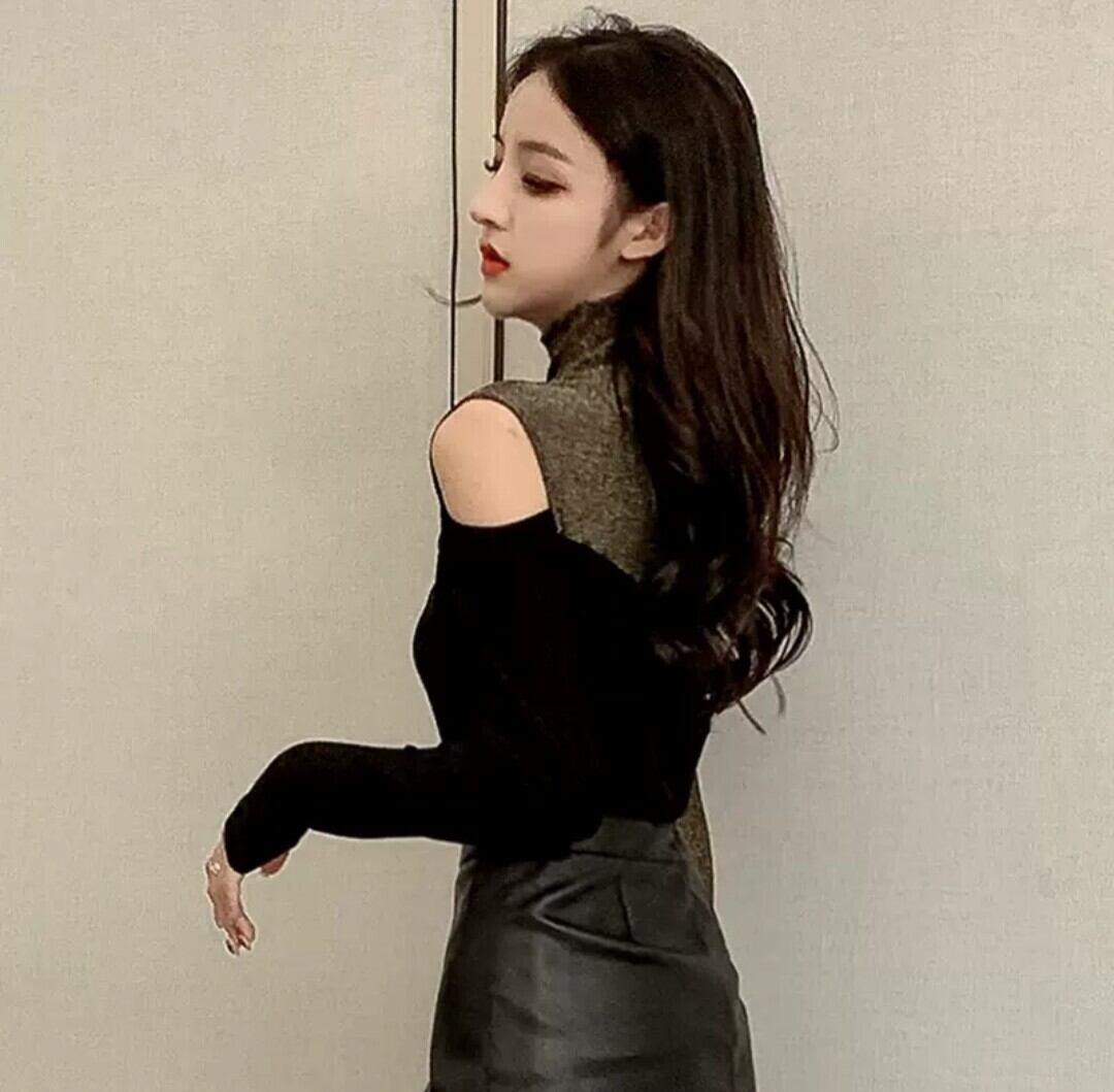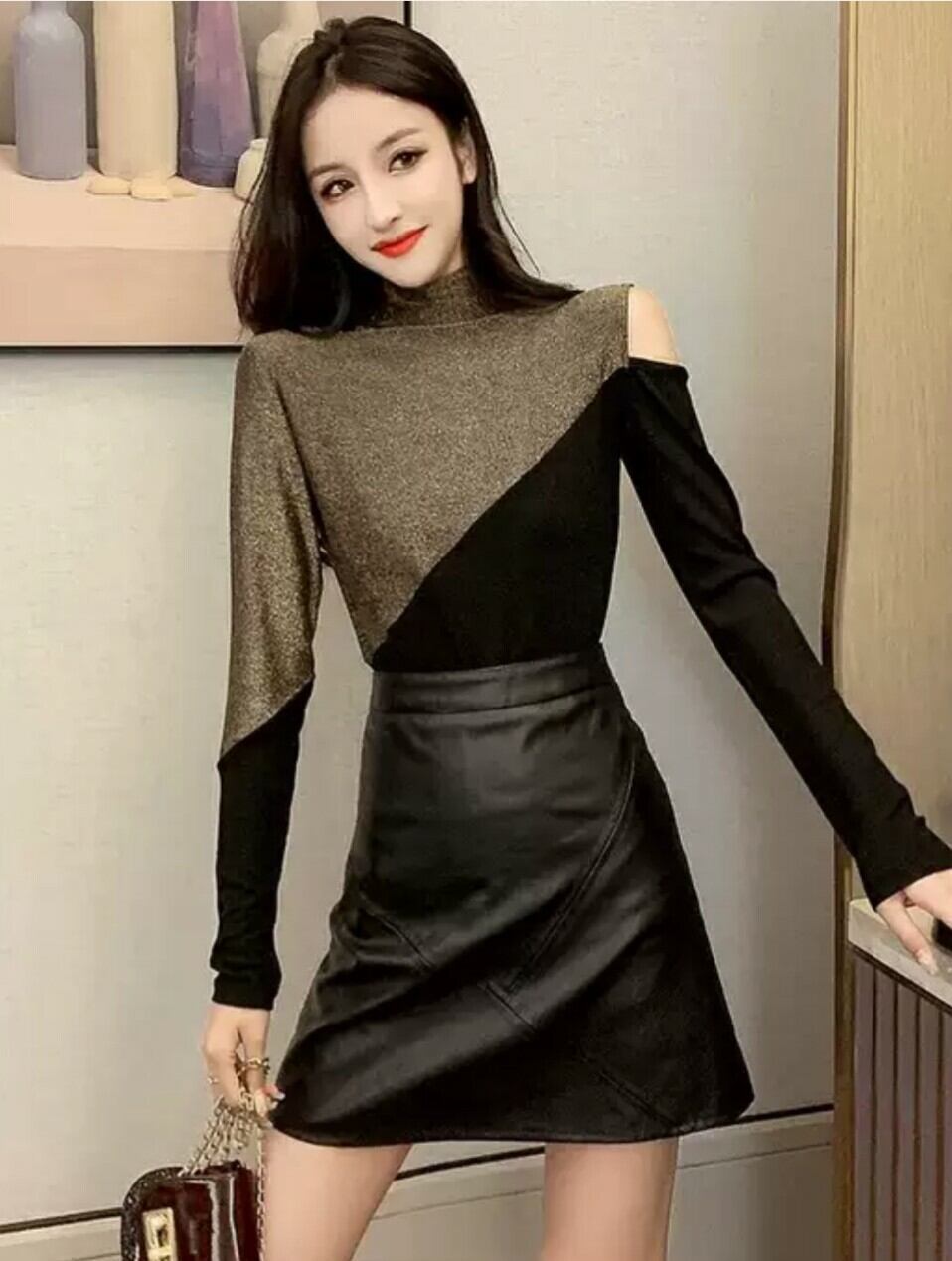 全2色 トップス オフショル バイカラー 秋冬 ゴールド レッド 片側 チラ見せ