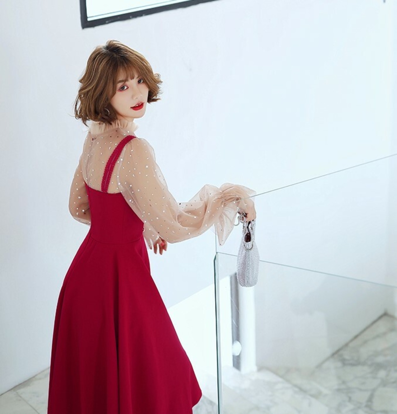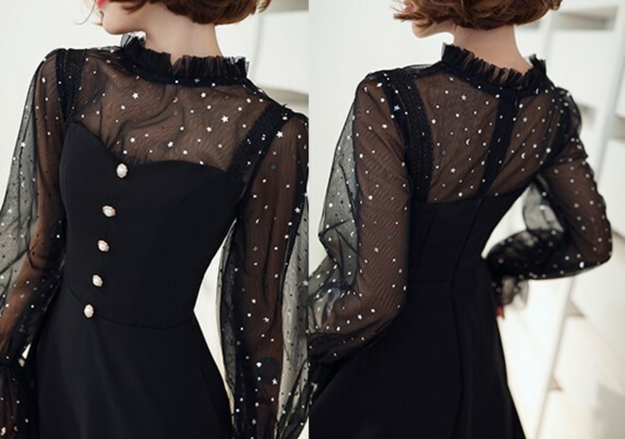 全2色 ドッキングワンピース ブラウス ジャンパースカート ドレス チュール フロントボタン ラメ ドット 水玉 ビスチェ 秋 冬 長袖 ハイネック フリル 大人可愛い 韓国 オルチャン