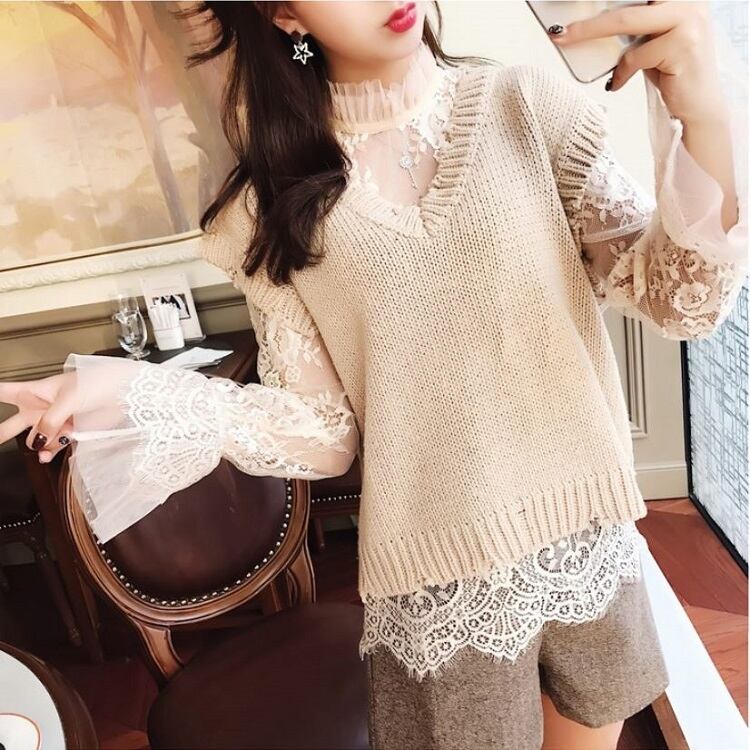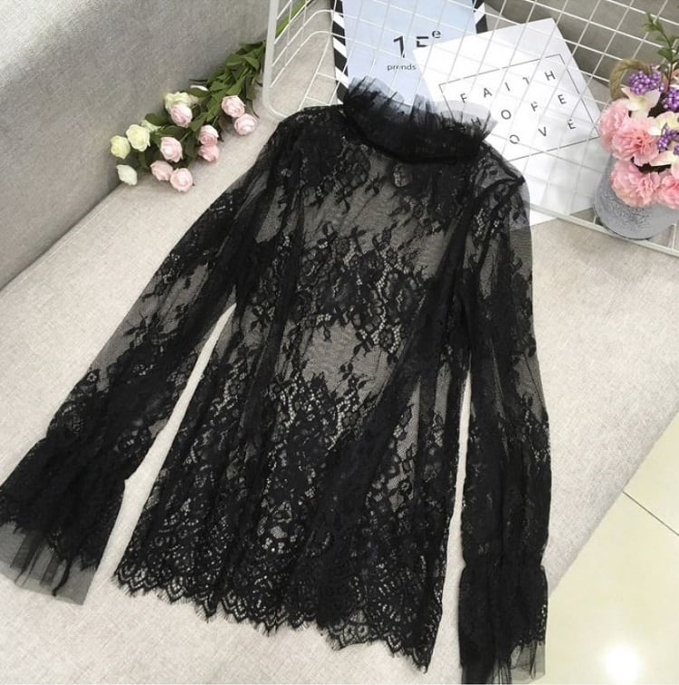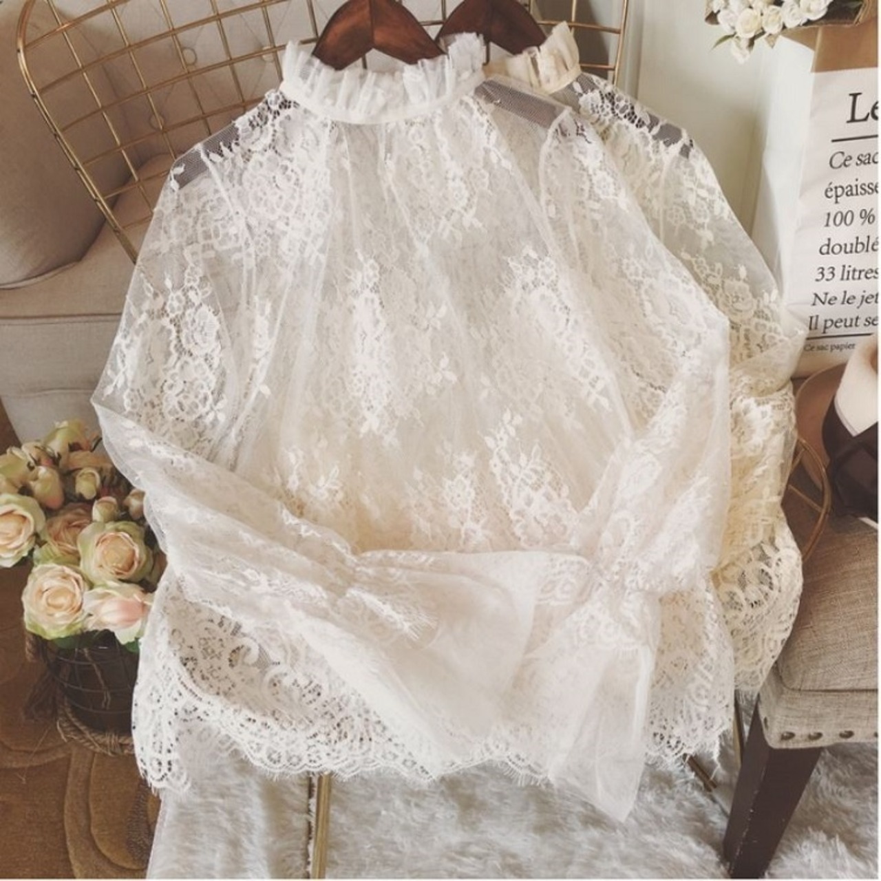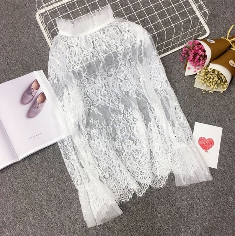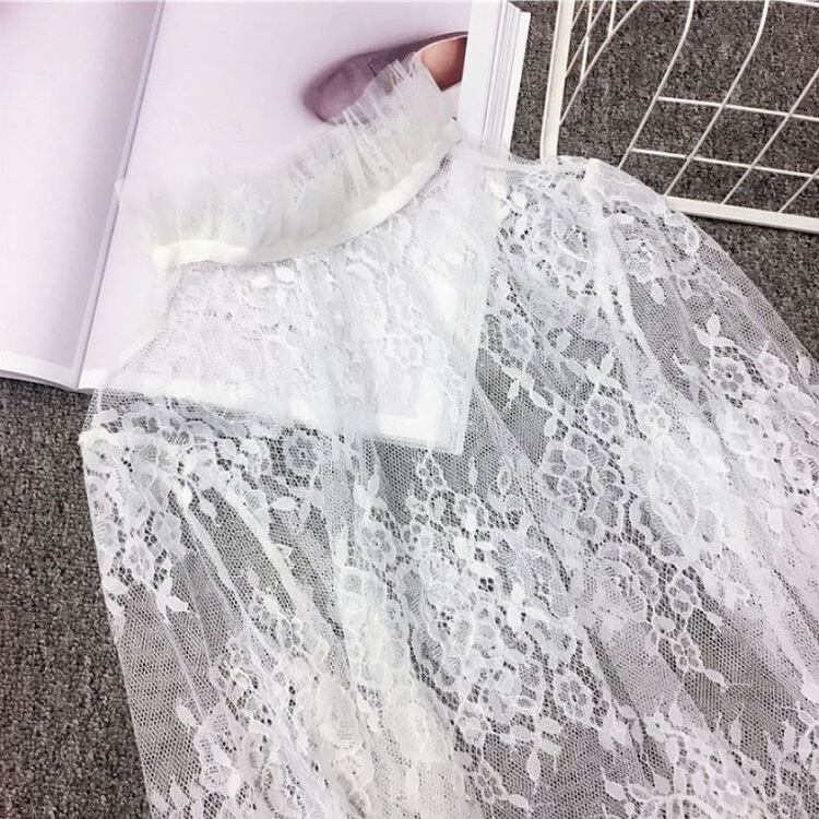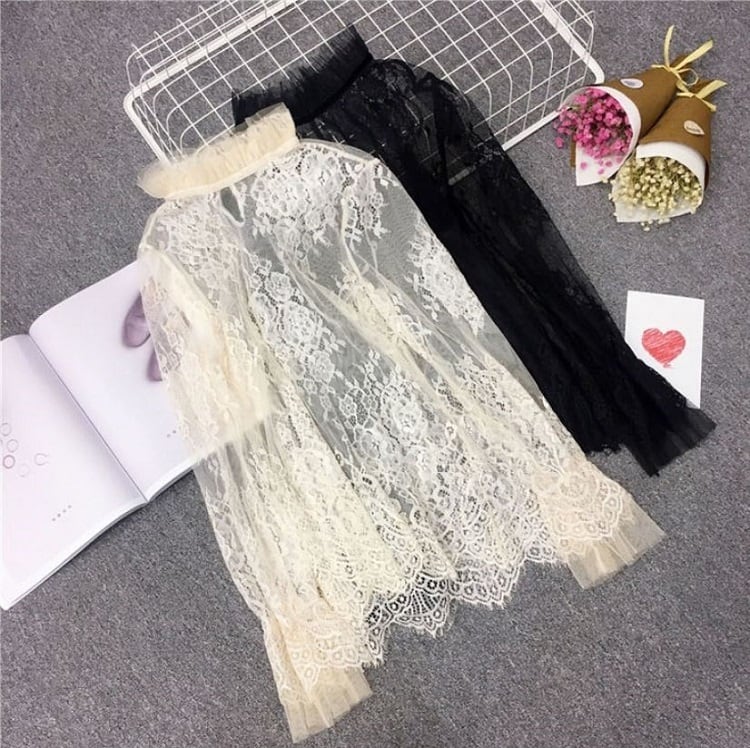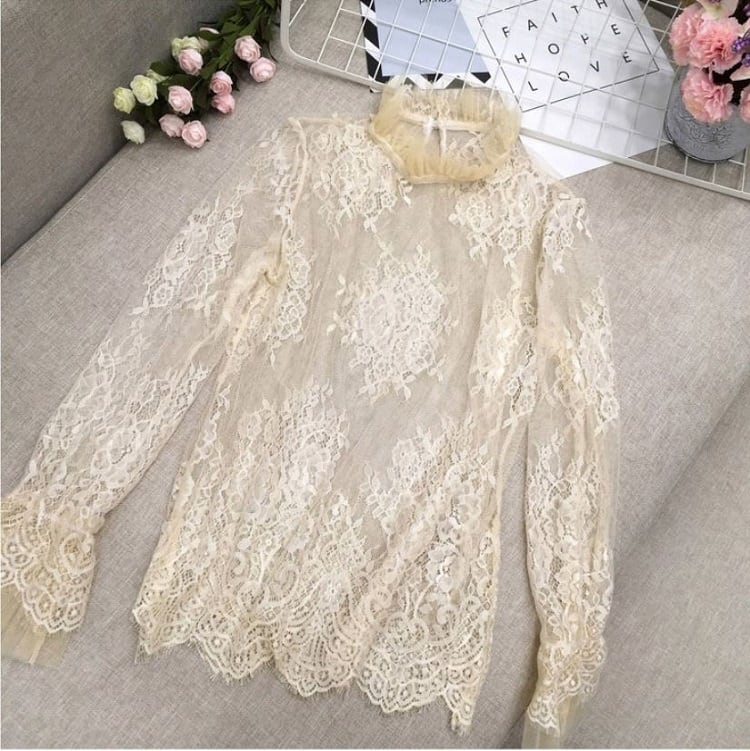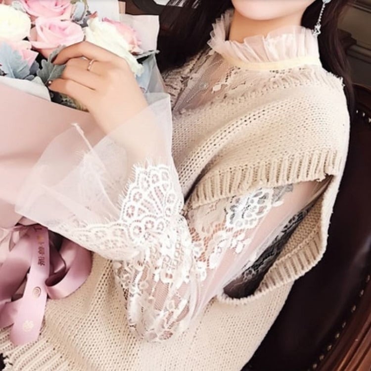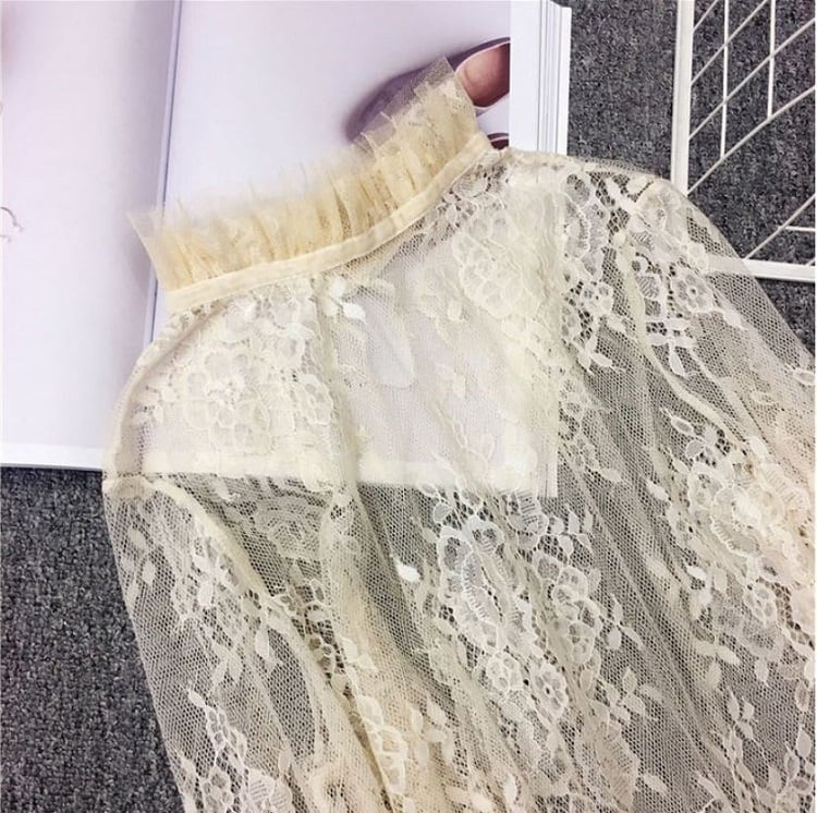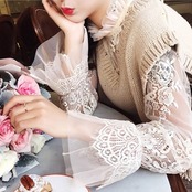 襟と袖に付いたレースが可愛い透け感のあるブラウスです。