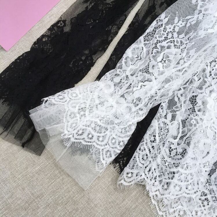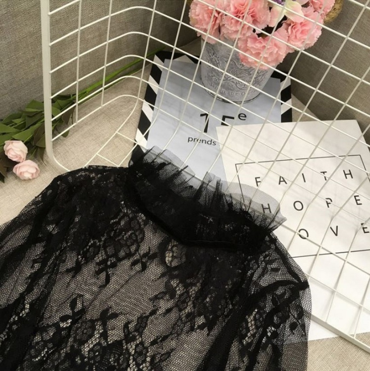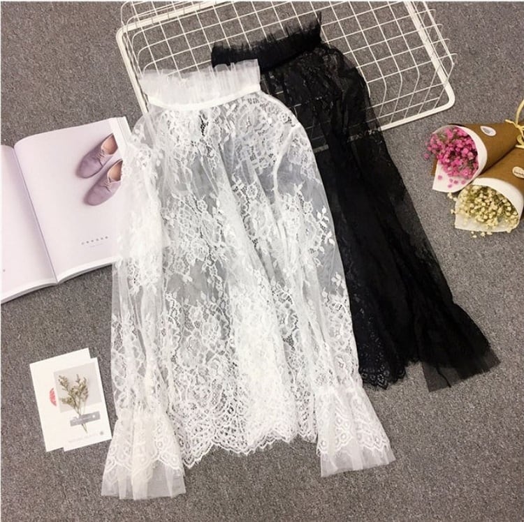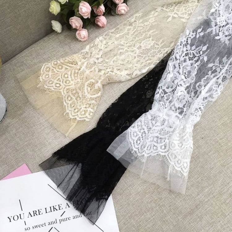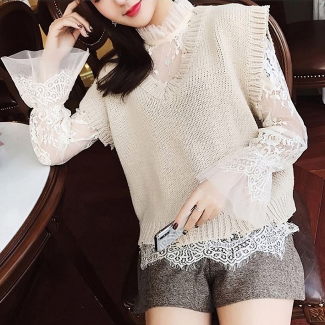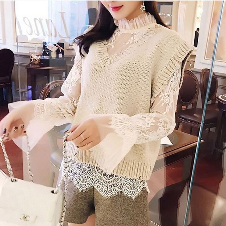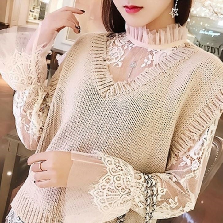 襟と袖に付いたレースが可愛い透け感のあるブラウスです。