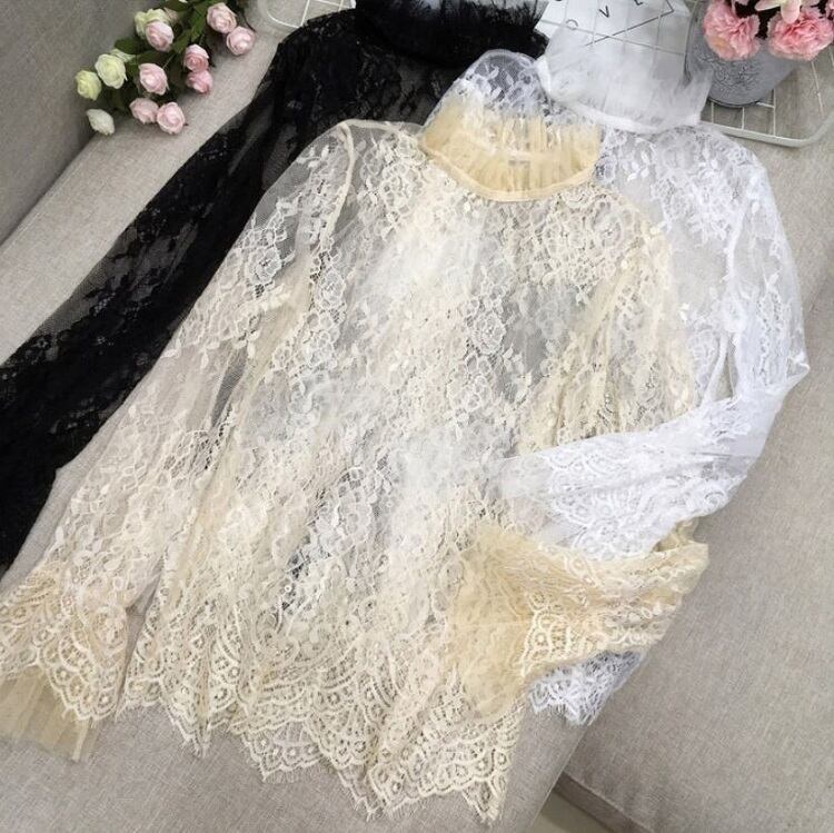 全3色 ブラウス 総レース プルオーバー スタンドカラー ベルスリーブ 長袖 リボン 透け感 きれいめ ガーリー フェミニン お出かけ 可愛い ホワイト アプリコット ブラック