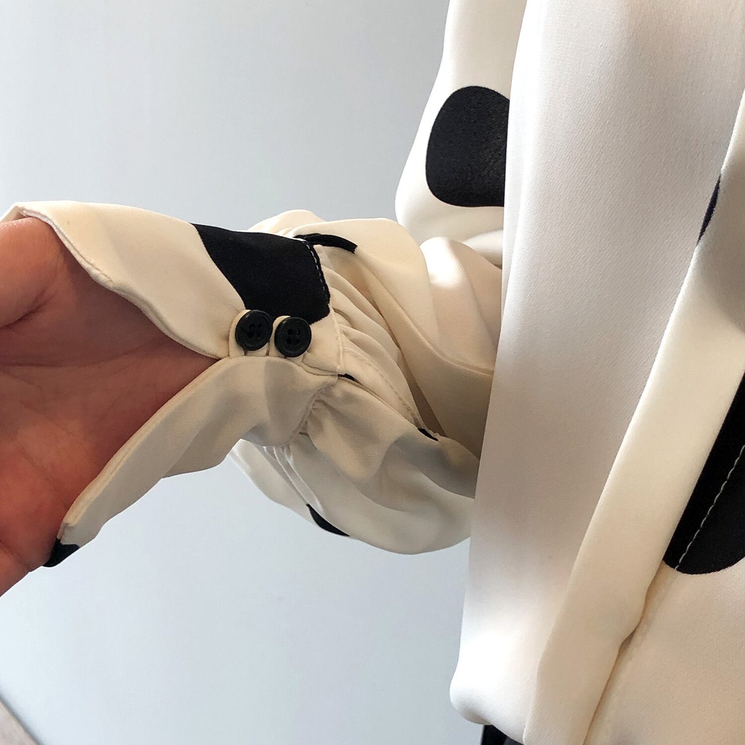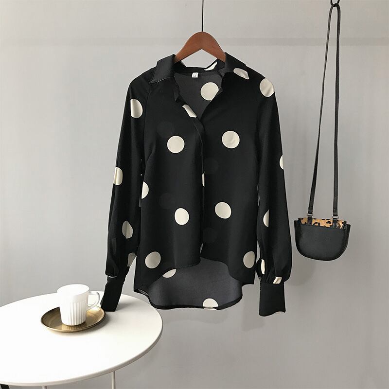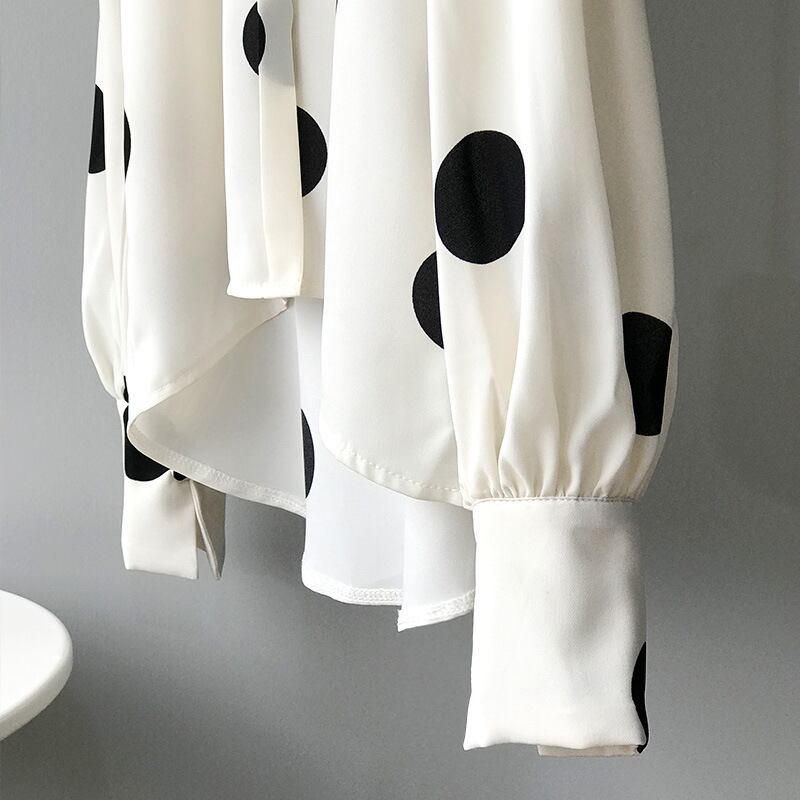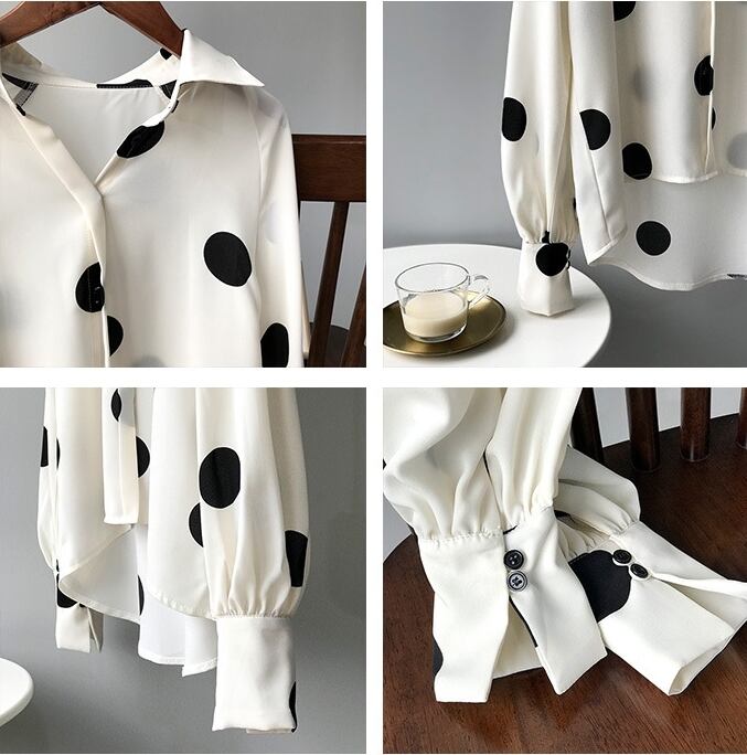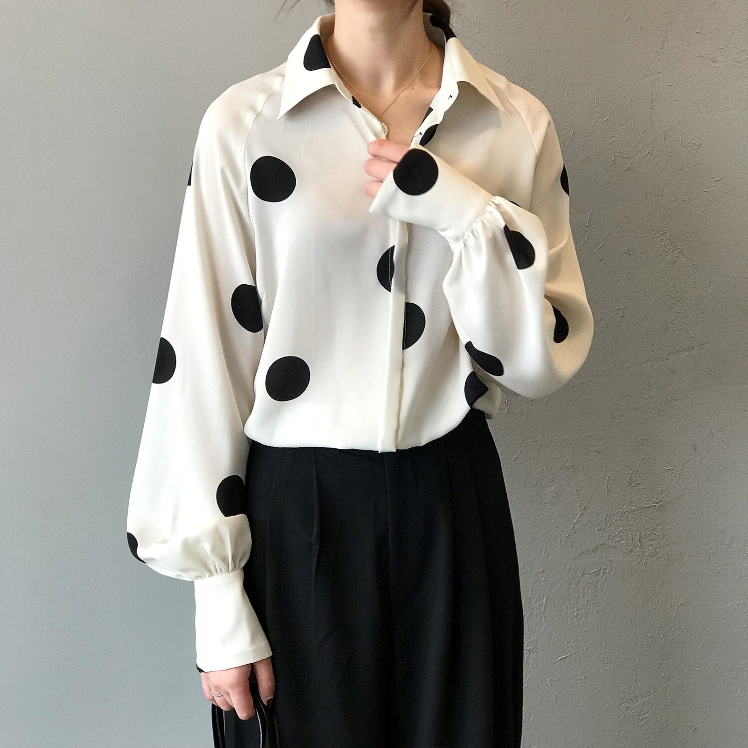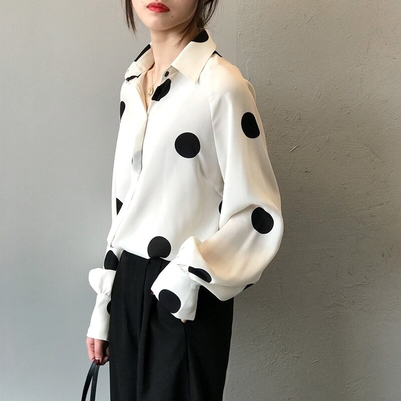 全2色 ブラウス シャツ 水玉 ドット柄 きれいめ 上品 カジュアル トレンド レトロ 前ボタン ゆったり パフスリーブ 長袖