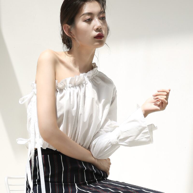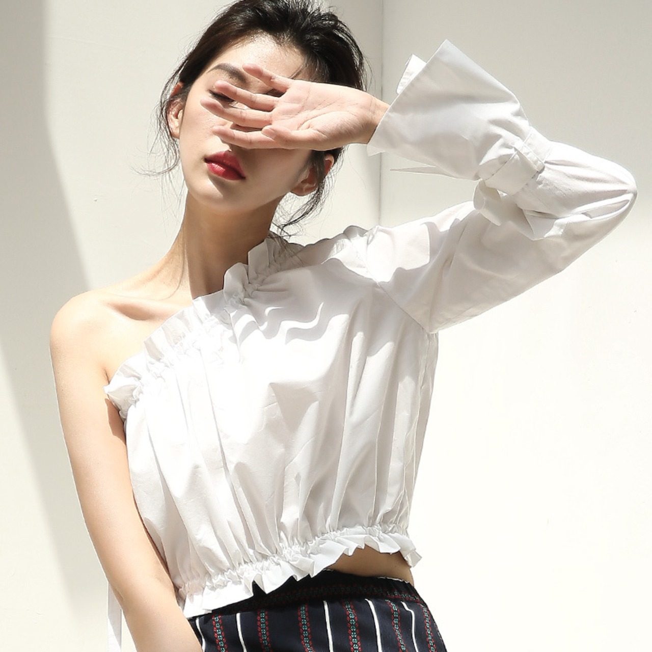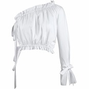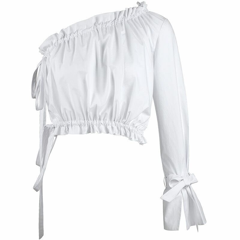 トップス ブラウス フリル ワンショルダー 袖コンシャス ショート丈 リボン フレアスリーブ フロントシャーリング ゴム 無地