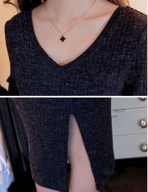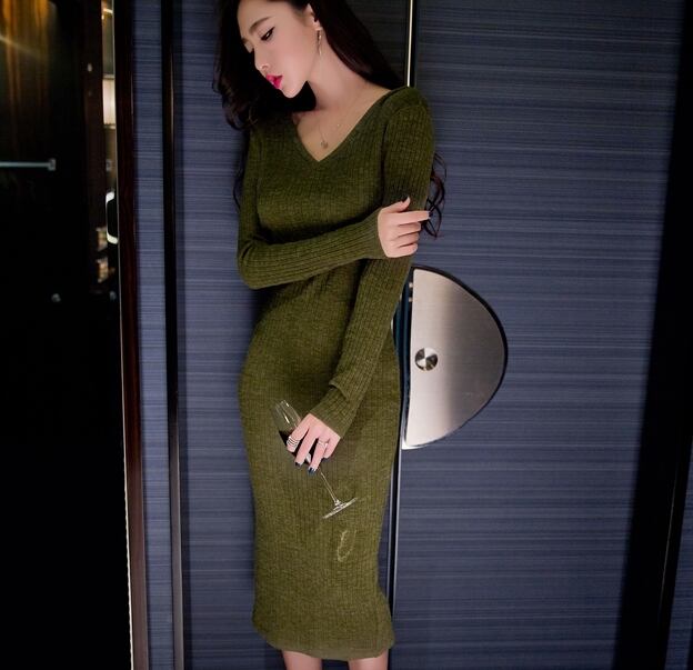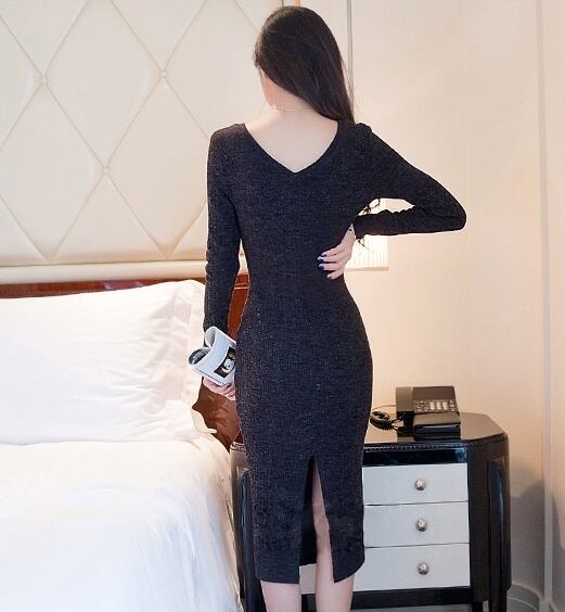 全2色 ワンピース タイト スリット 長袖 ニットワンピース Vネック ミモレ丈 ロング丈 あったか 上品 きれいめ セクシー リブニット