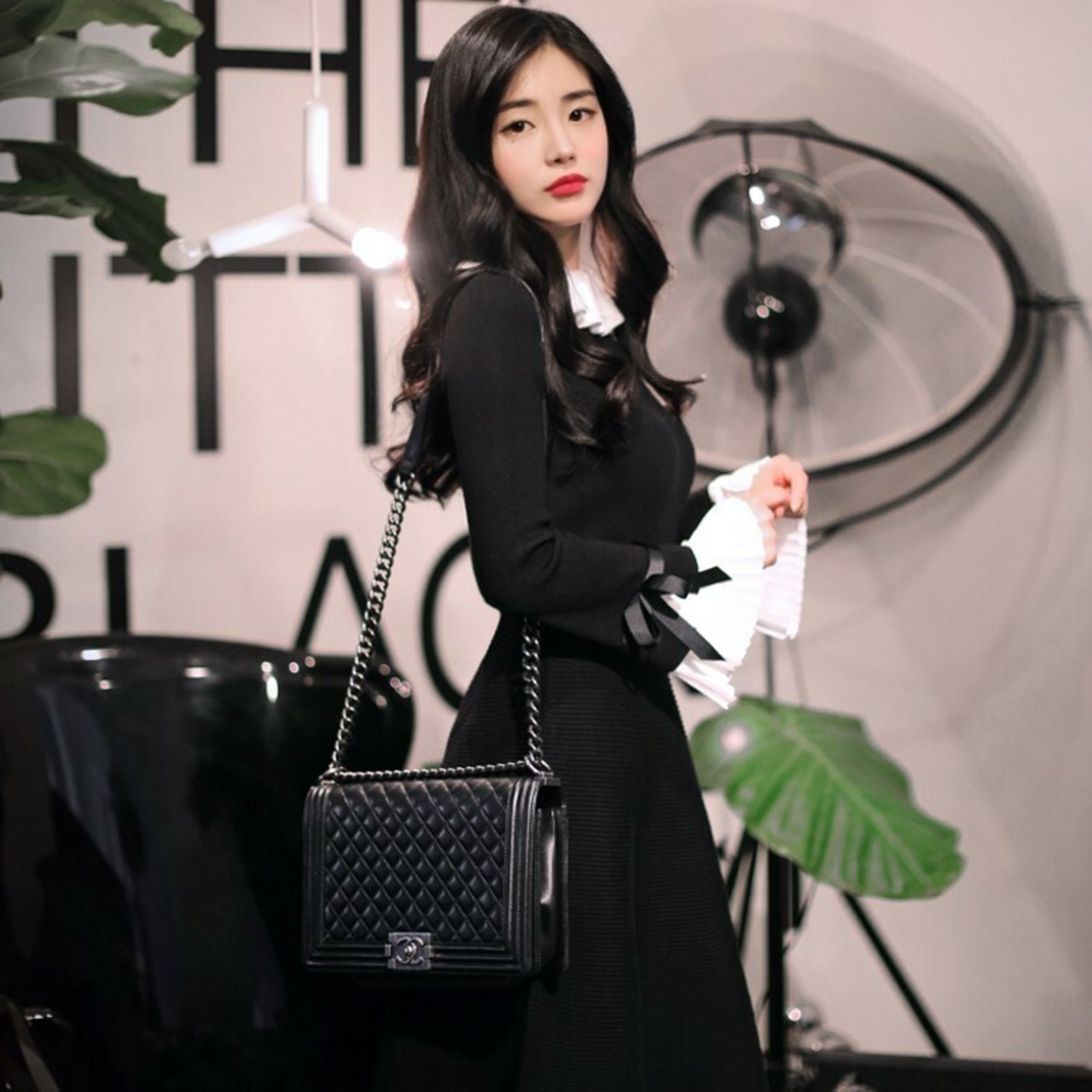 襟と袖でホワイトブラウス素材を使って上品な印象に。