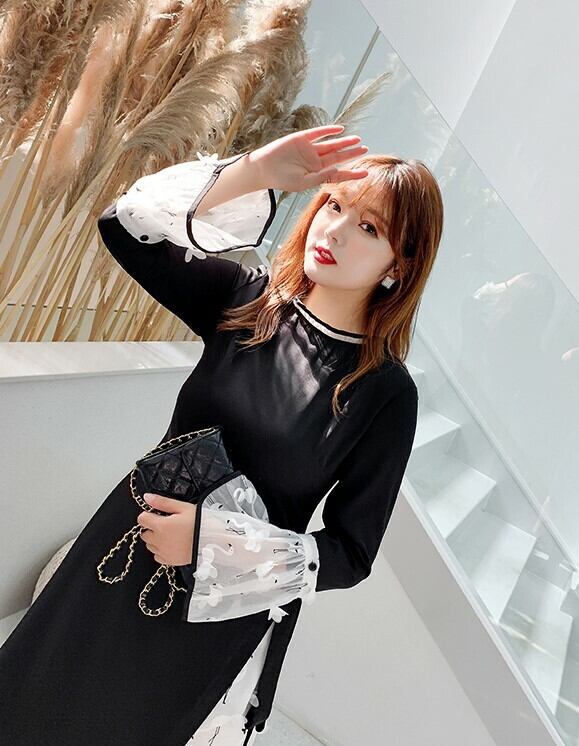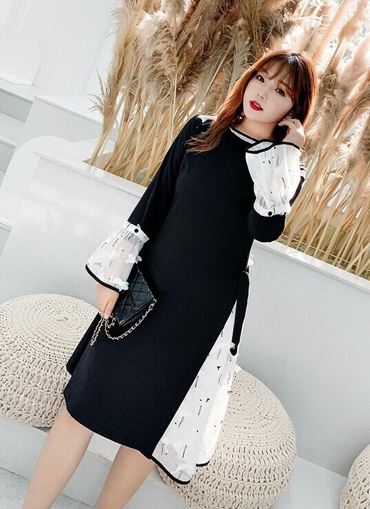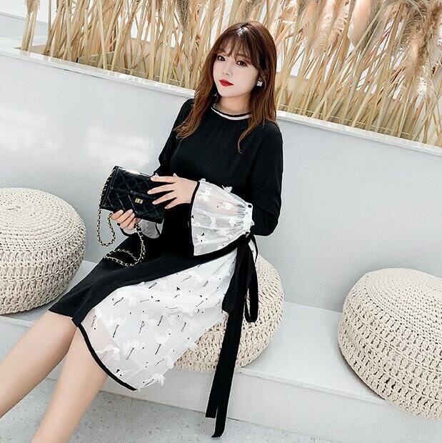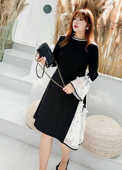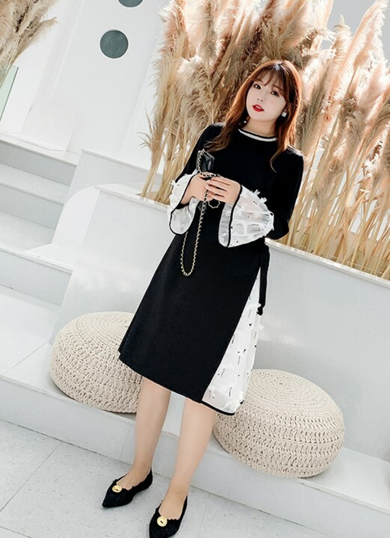 大きいサイズ ワンピース ドレス ウエストリボン 長袖 フレアスリーブ 異素材ミックス ラウンドネック 白鳥 お呼ばれ デート カジュアルパーティ