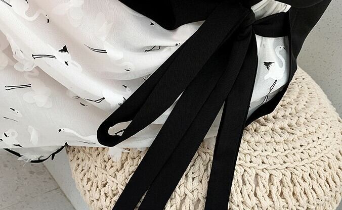ウエスト位置から裾に向かって白鳥柄の生地が組み込まれ