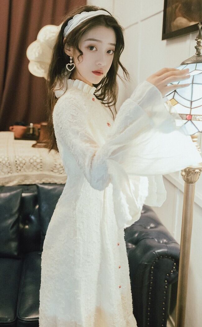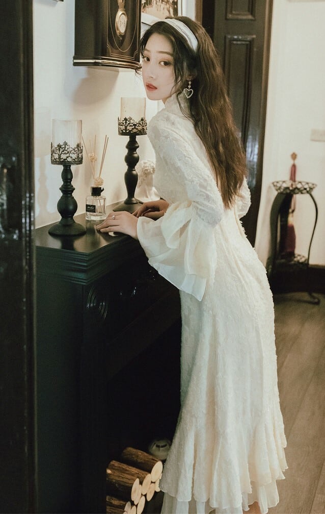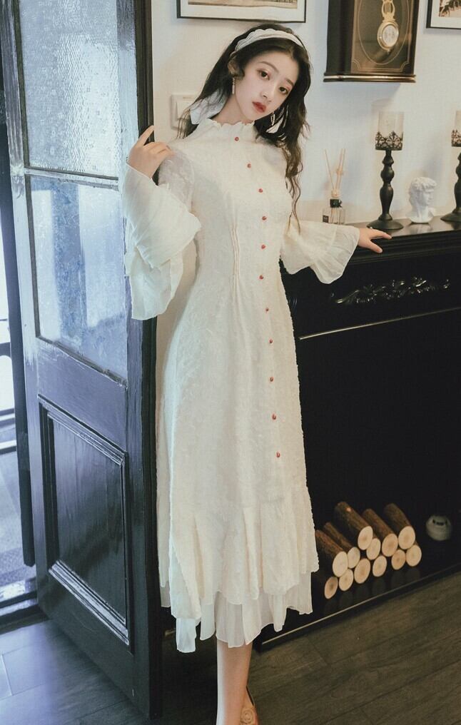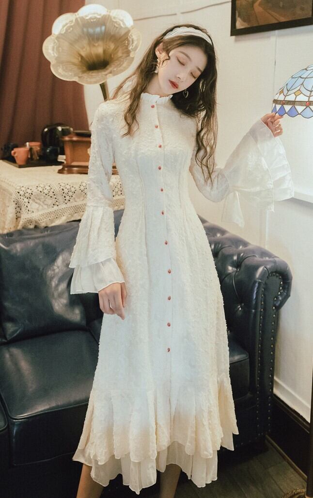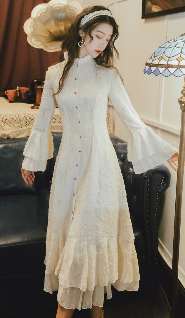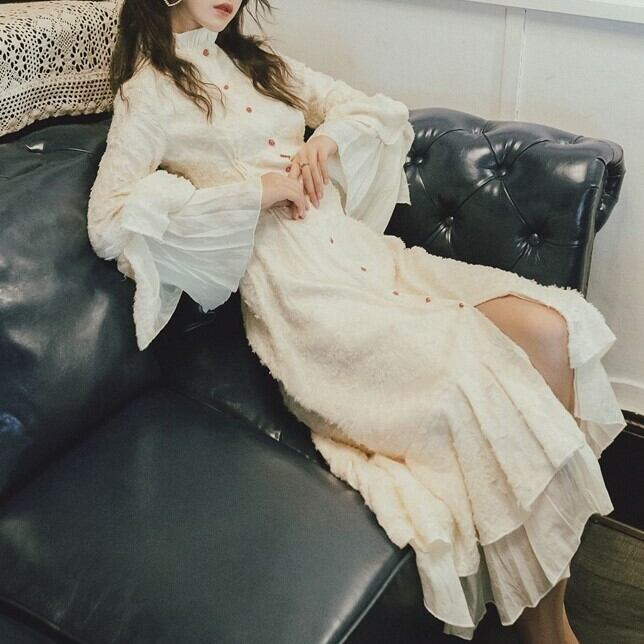 エレガントワンピース ドレス フリルワンピース ハイネック ロングドレス ホワイト 長袖 フレアスリーブ 上品 パーティ お呼ばれ 大人可愛い 二次会 同窓会 韓国 オルチャン