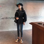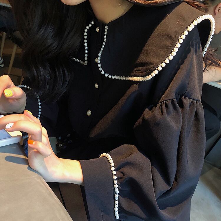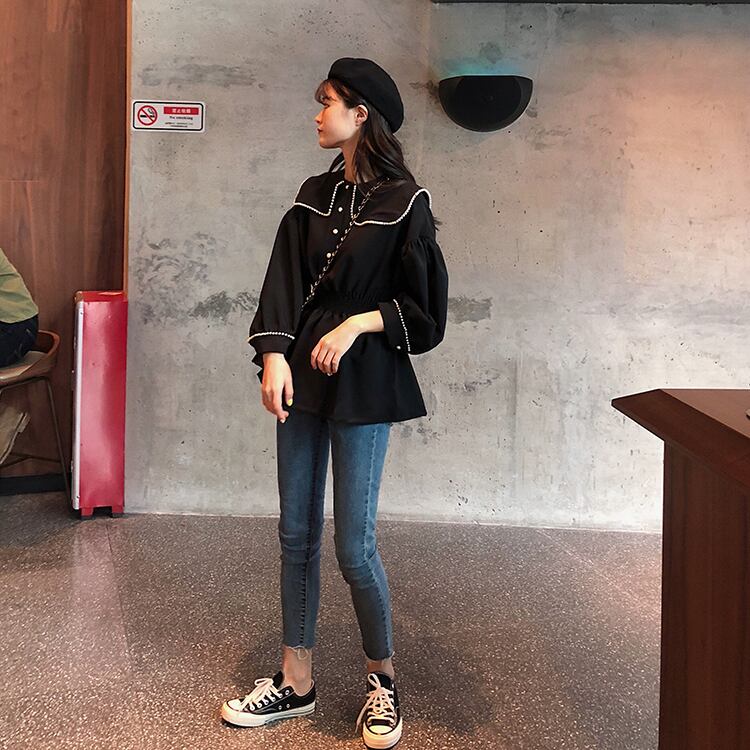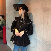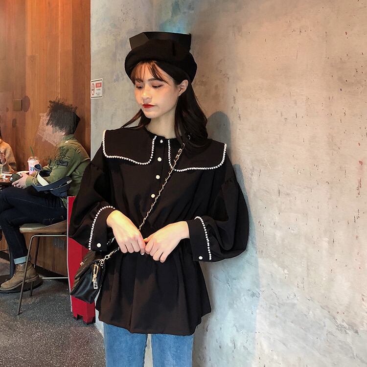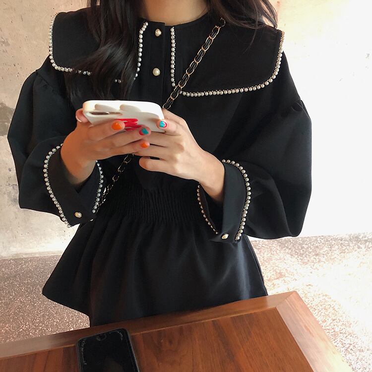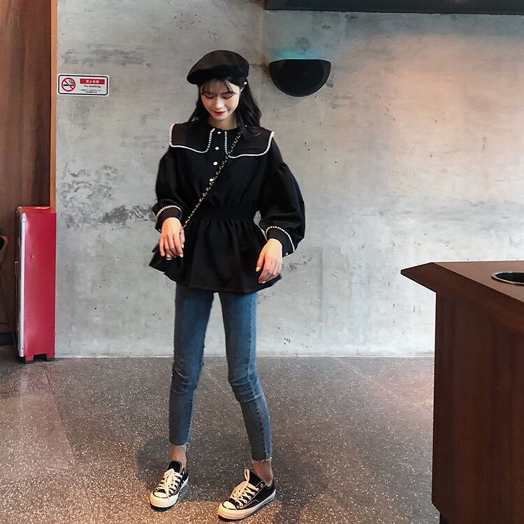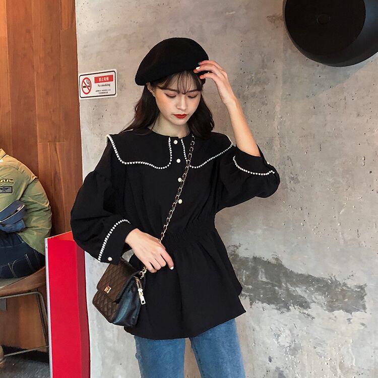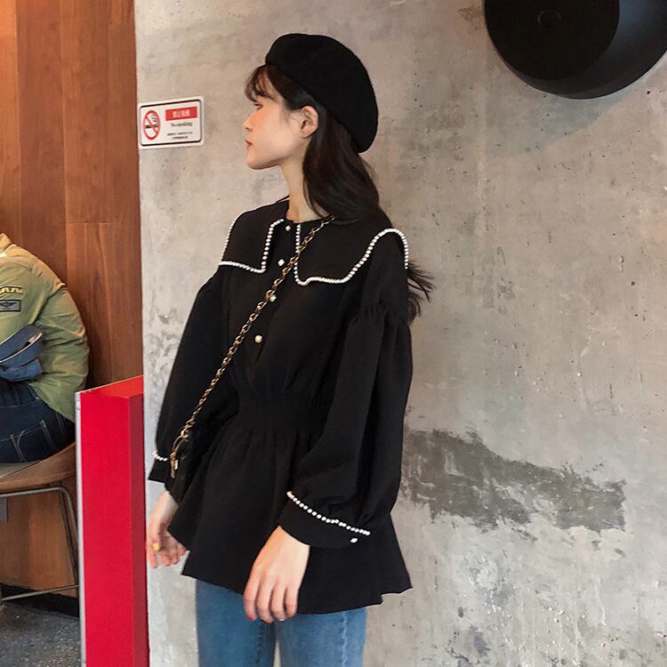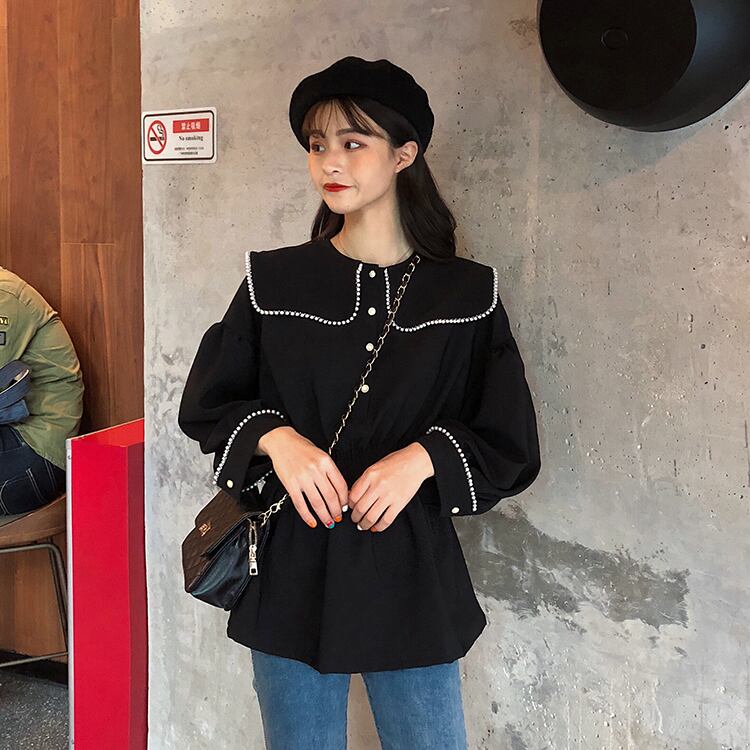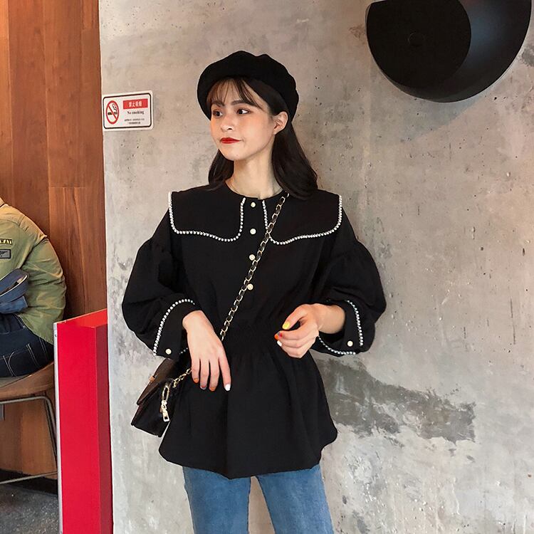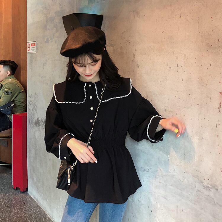 ブラウス シャツ セーラーカラー 長袖 パイピング ドロップショルダー ウエストゴム 学生 通学 可愛い レトロ フェミニン 韓国 オルチャン