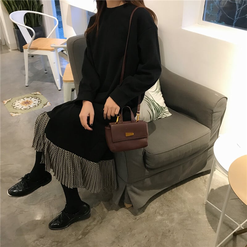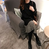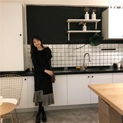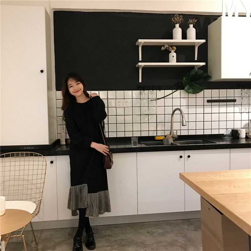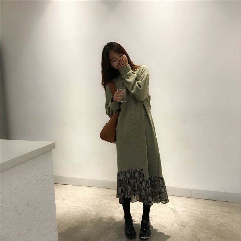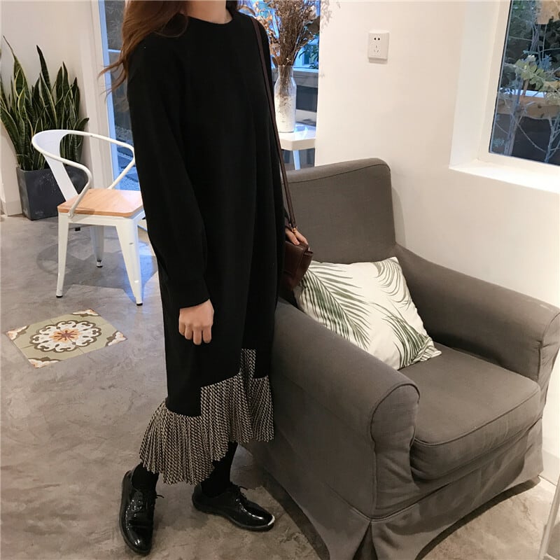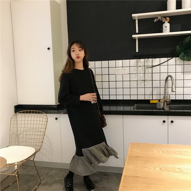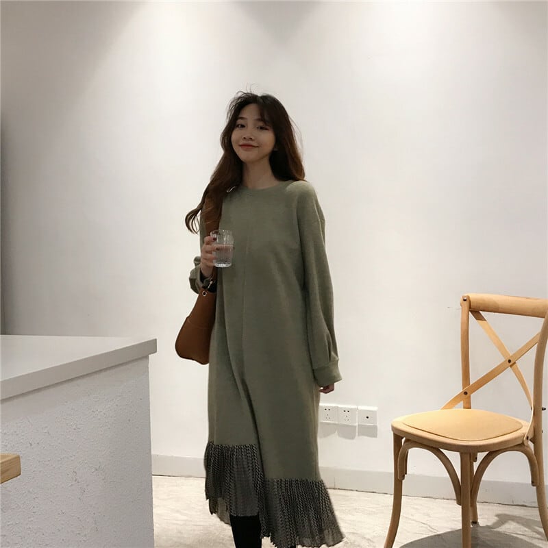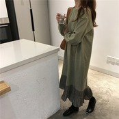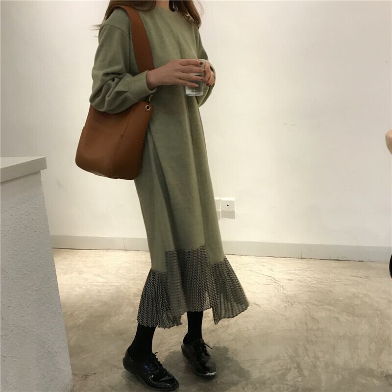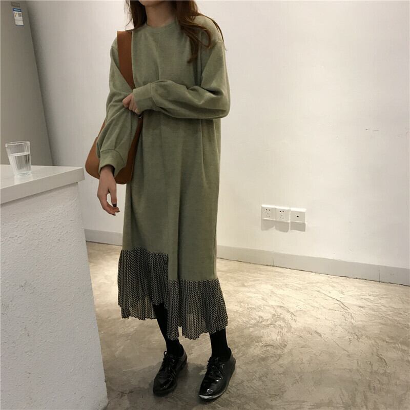 全2色 ロングドレス ワンピース プリーツ フリル ブラック グリーン 長袖 ドロップショルダー スウェット 大人カジュアル 韓国 オルチャン