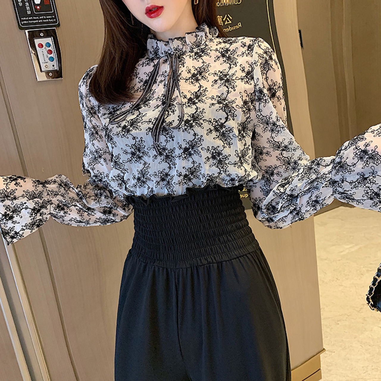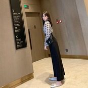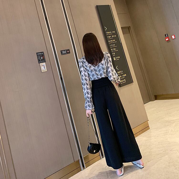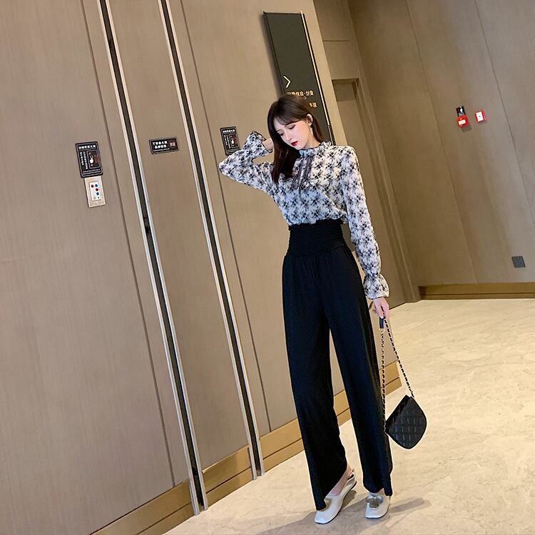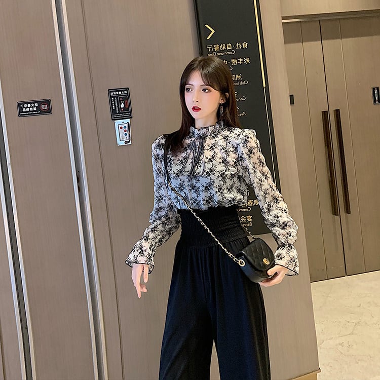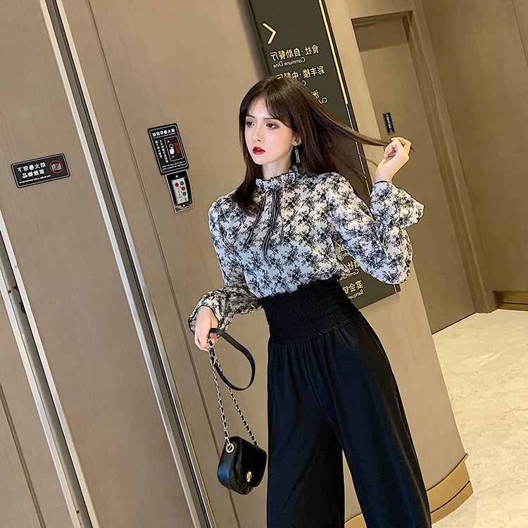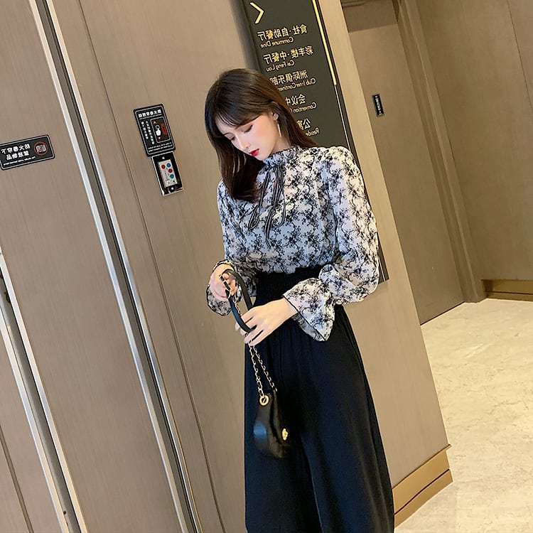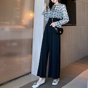 セットアップ ツーピース ブラック ボウタイブラウス ワイドパンツ ハイウエスト 長袖 秋 冬 オフィスカジュアル 韓国 オルチャン