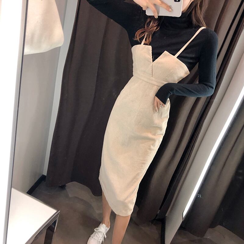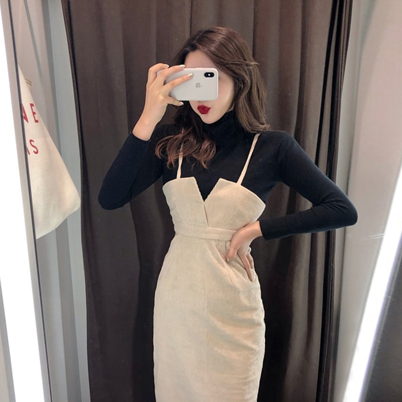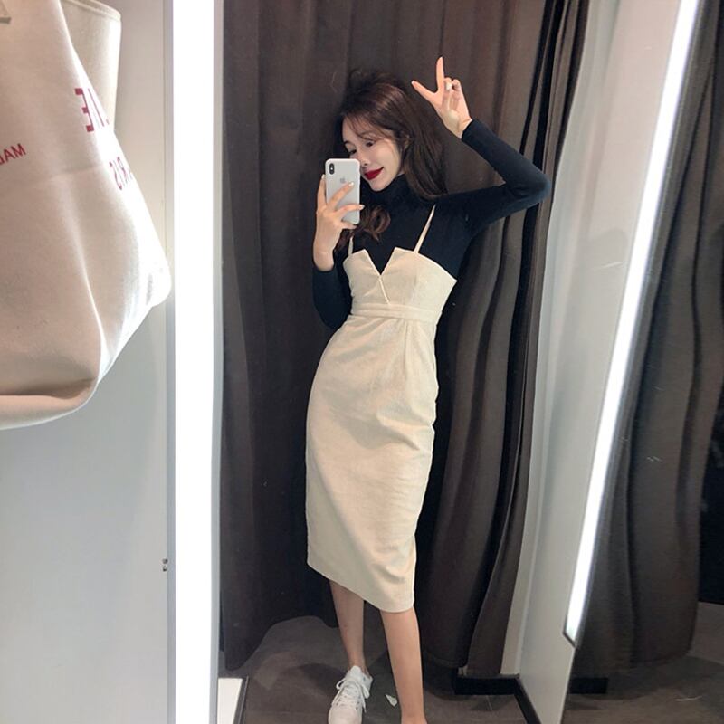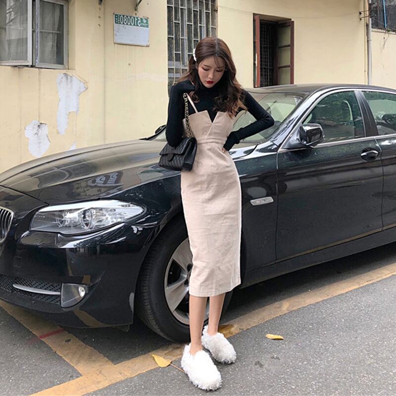 セットアップ ツーピース タートルネック ストラップワンピース ミモレ丈 長袖 ニット 秋 冬 大人可愛い 韓国 オルチャン