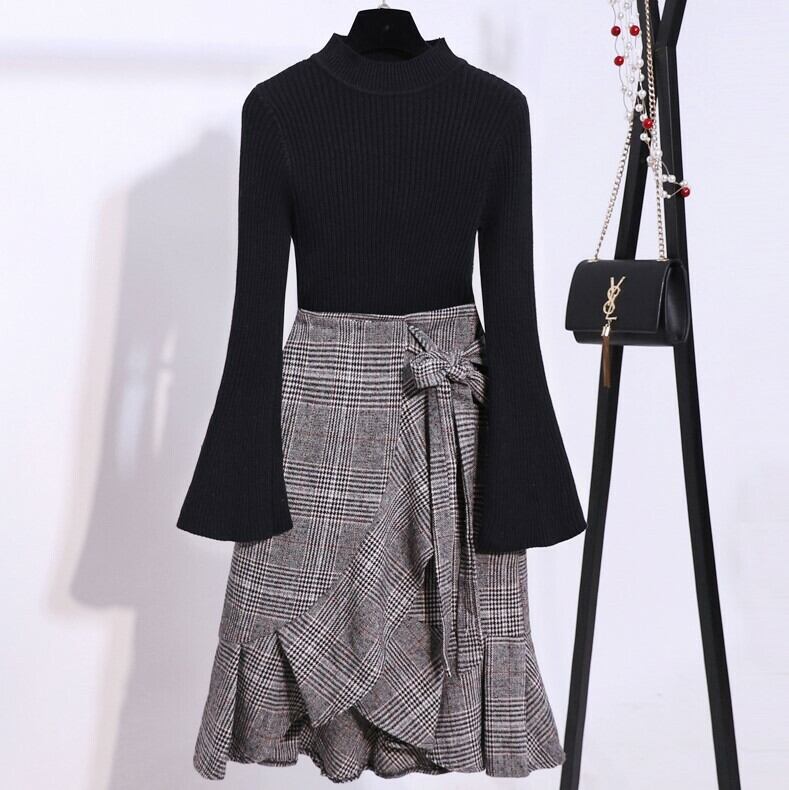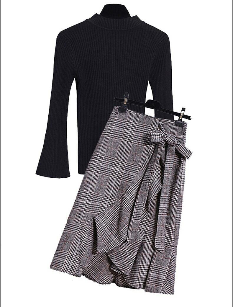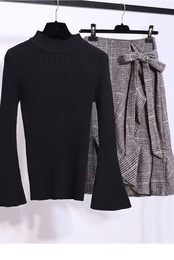 ハイネックニットとウエストリボン付きスカートの2点セットアイテム♪
