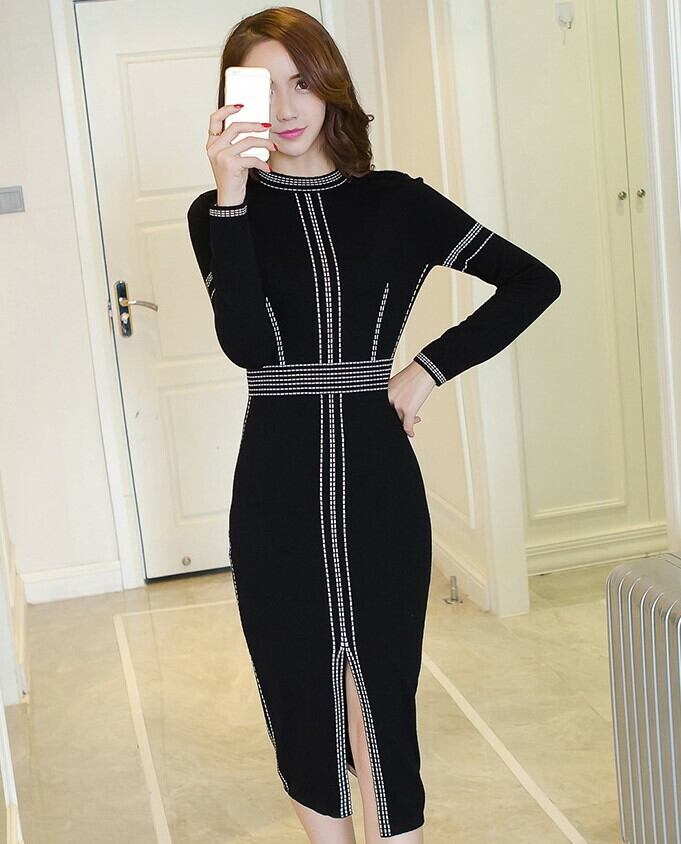 ハイネックワンピース ミモレ丈 タイト フィット スリム フロントスリット パイピング ブラック エレガント 上品 セクシー 韓国 オルチャン 秋 冬