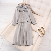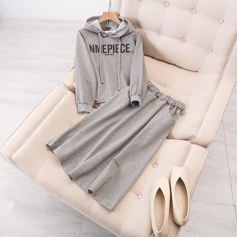 セットアップ ツーピース スウェット パーカー スカート ミモレ丈 プリントロゴ グレー 長袖 秋 冬 ウエストゴム スポーティ 大人カジュアル 韓国 オルチャン