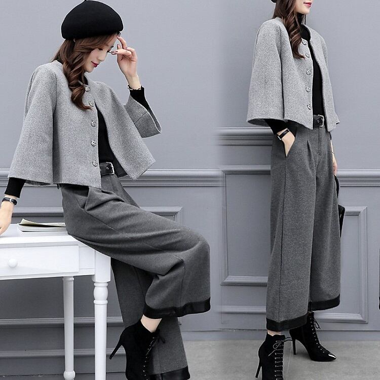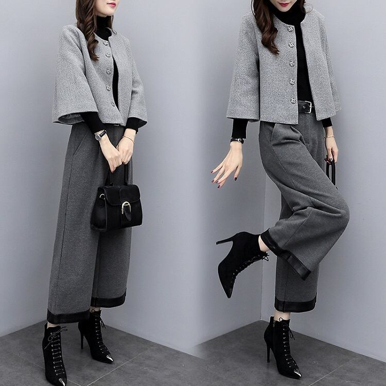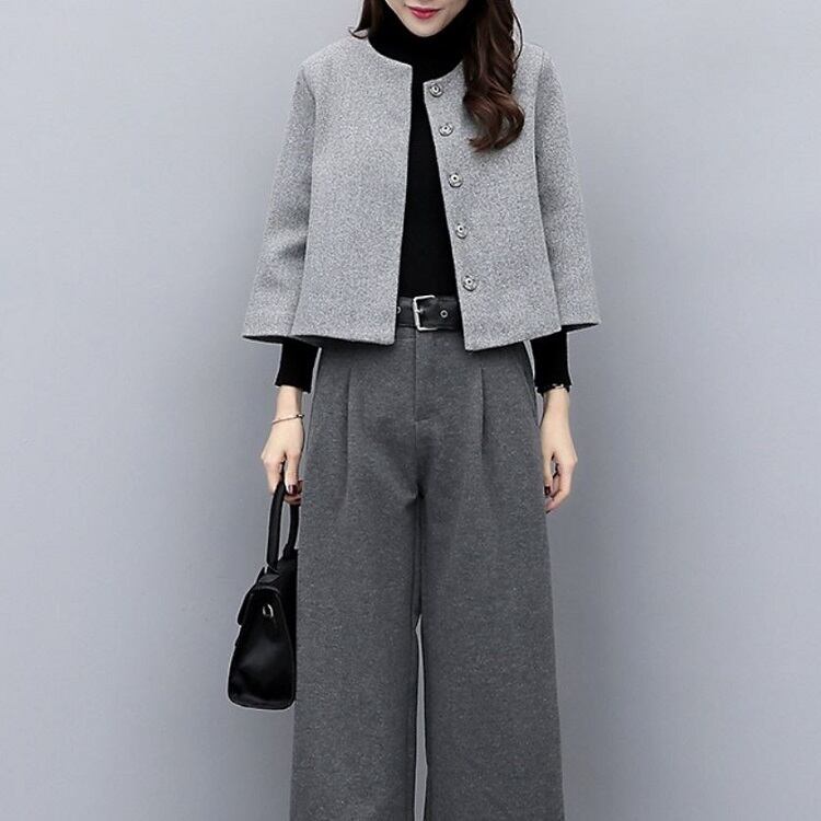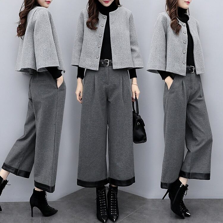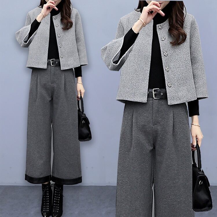 セットアップ ツーピース 上下セット パンツスーツ ノーカラージャケット ショート丈 ワイドパンツ ゆったり 体型カバー フェミニン フォーマル オフィス 秋冬 グレー