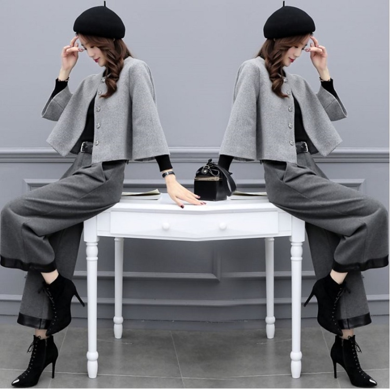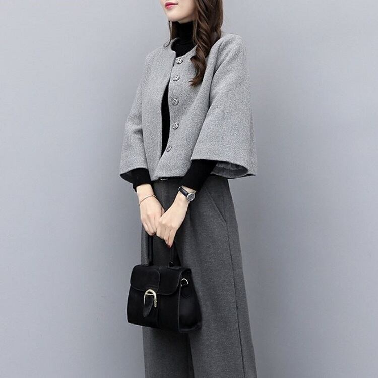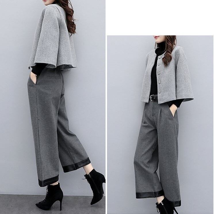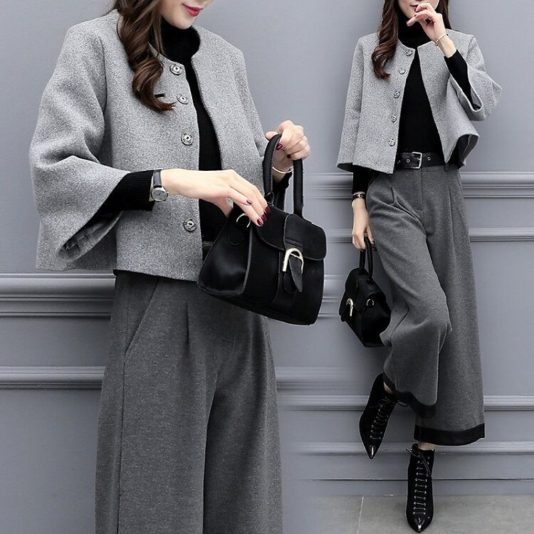 シックなグレーの色合いが上品な印象のショートジャケットとワイドパンツのセットアップです。