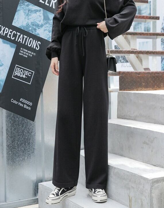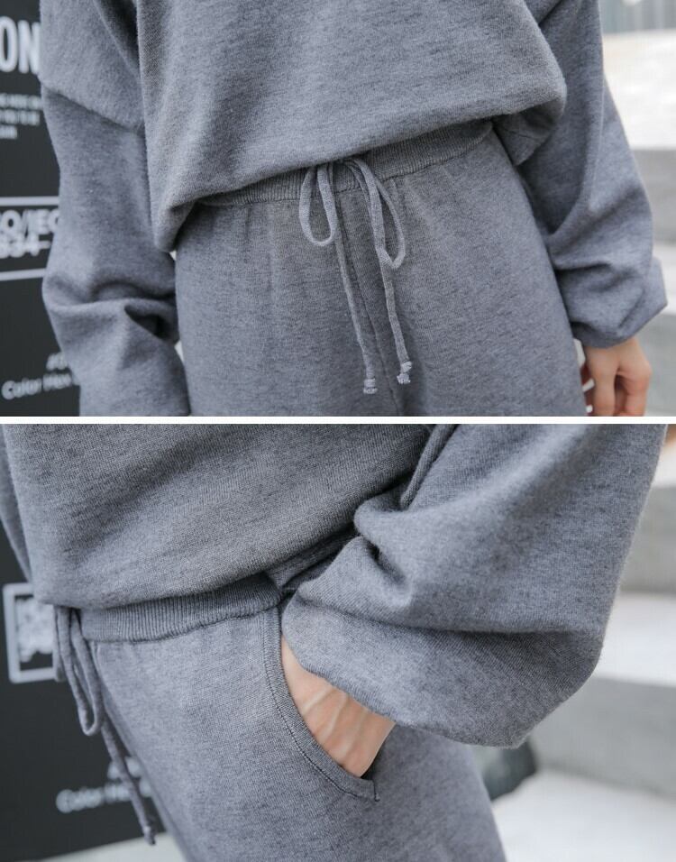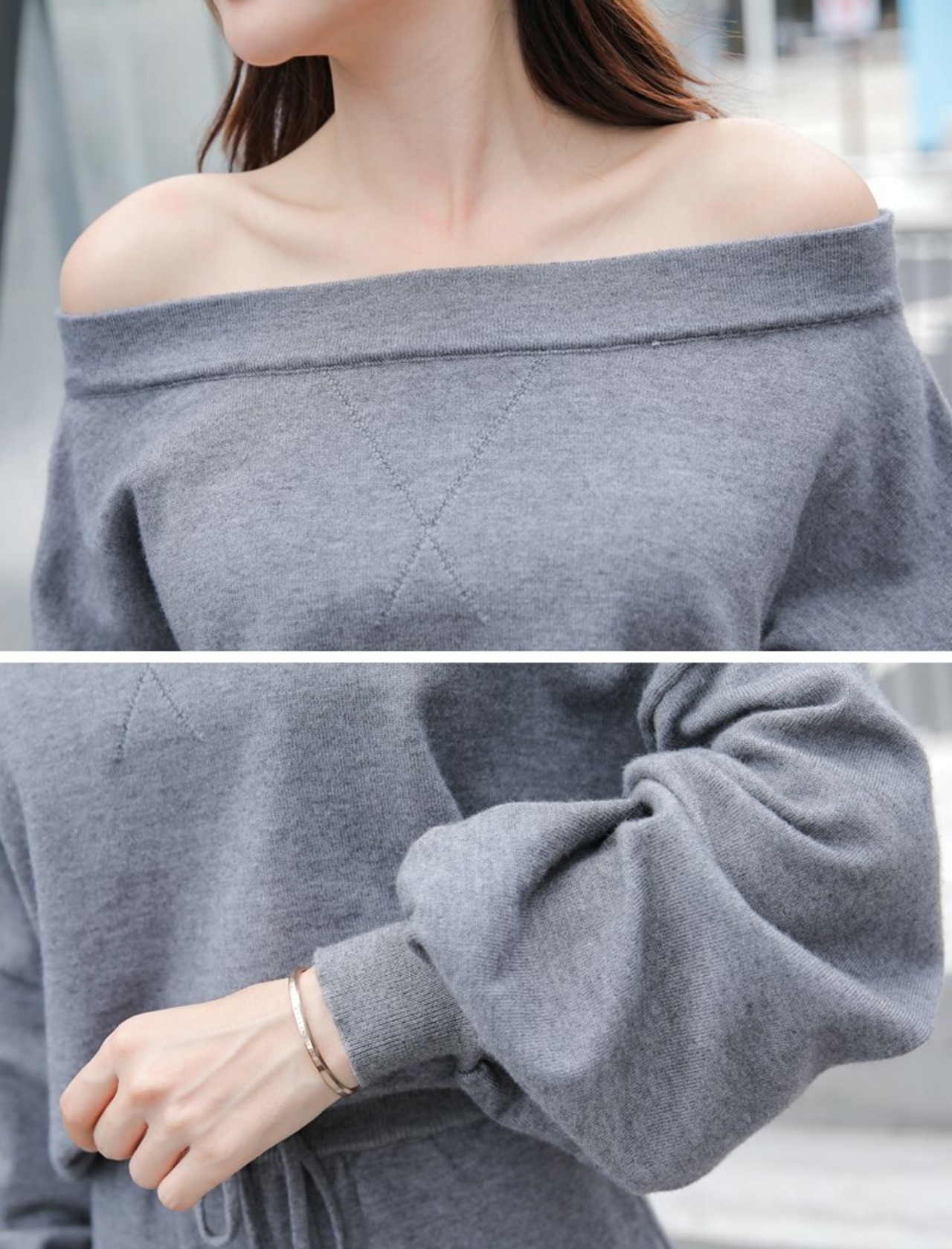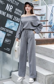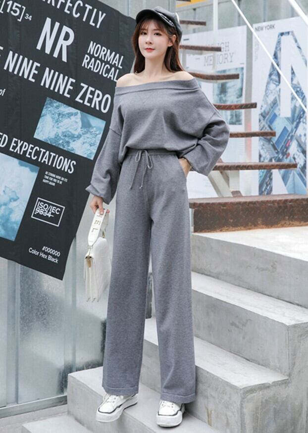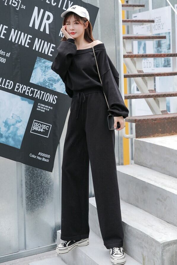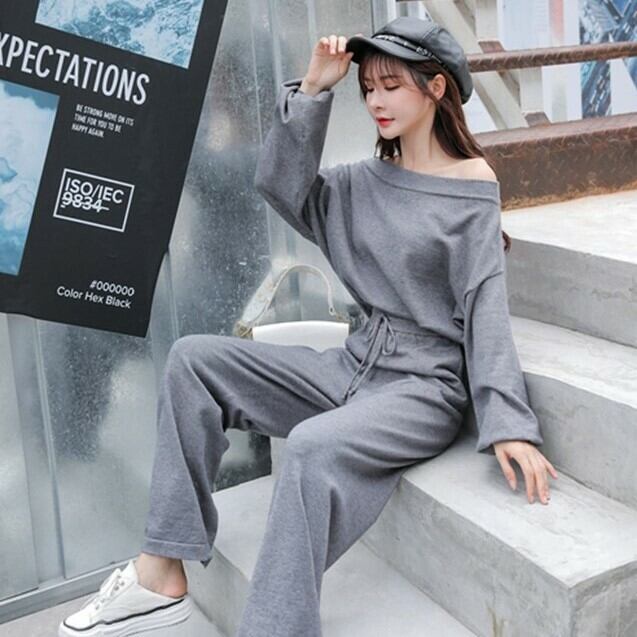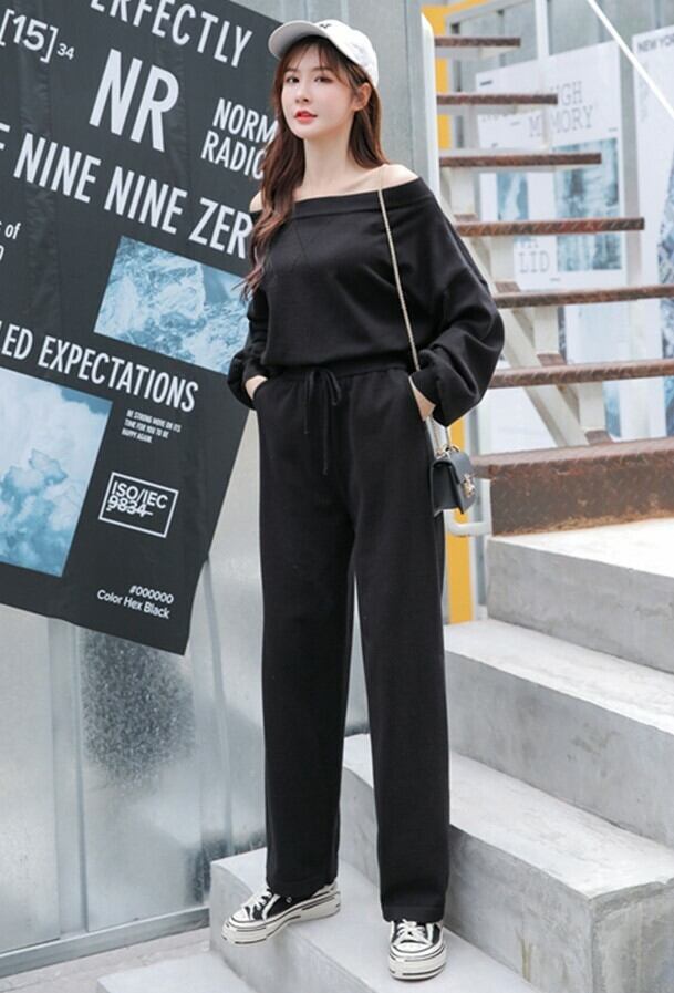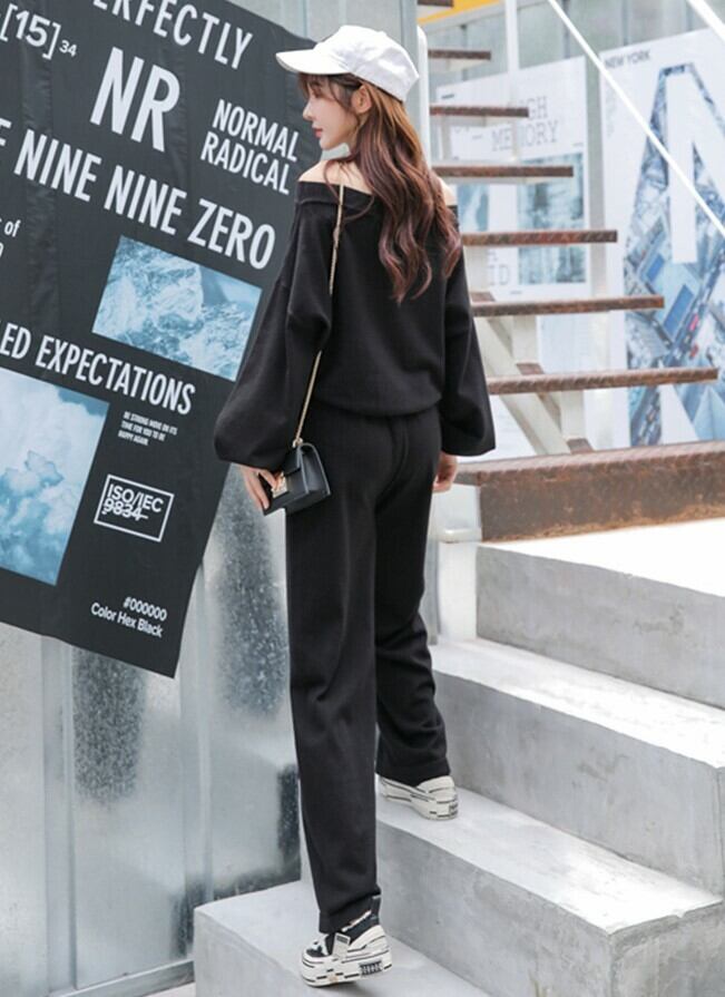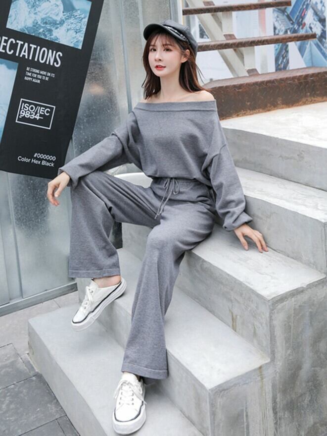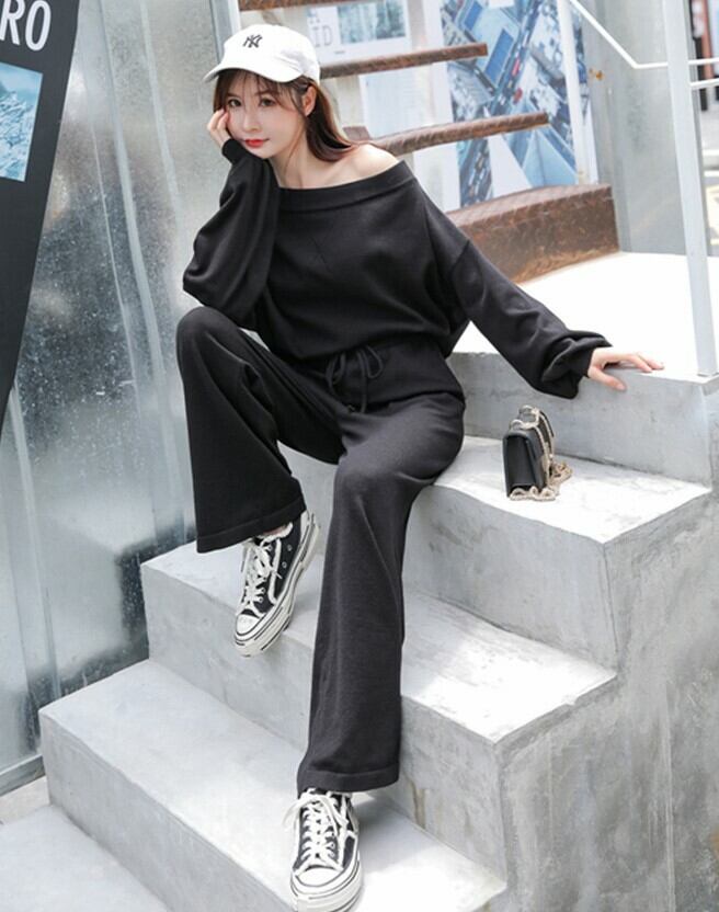 全2色 オフショルダー ニット セットアップ ストレートパンツ ドロップショルダー 長袖 秋 冬 グレー ブラック スポーティ 大人カジュアル 韓国 オルチャン 休日