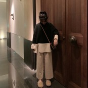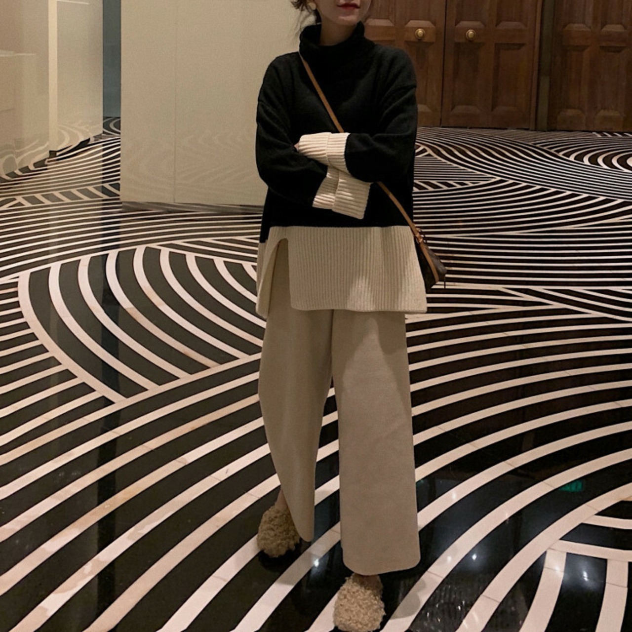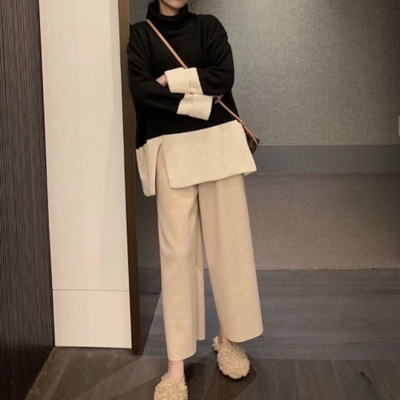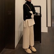 ゆったりシルエットのニットとワイドパンツのセットアップ。