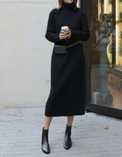 全2色 タイトニットワンピース ニットドレス リブニットワンピース タートルネック ロング丈 長袖 ドロップショルダー ベージュ ブラック 大人カジュアル エレガント 上品 韓国