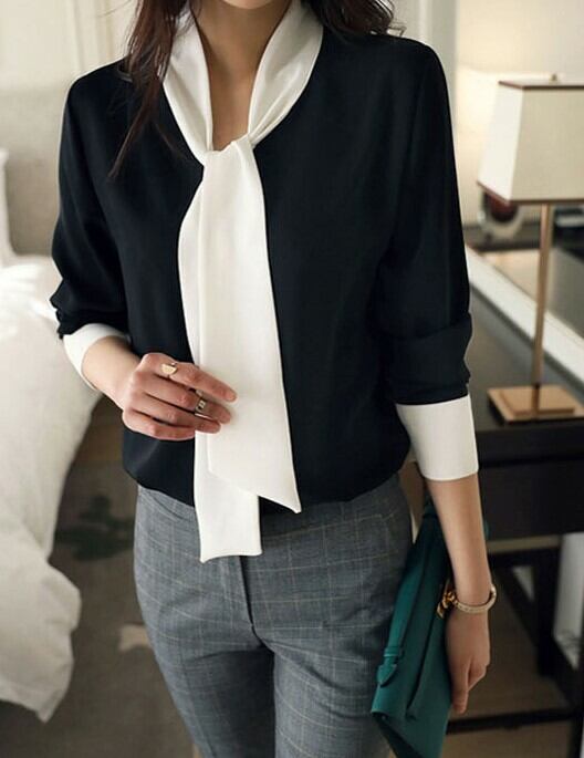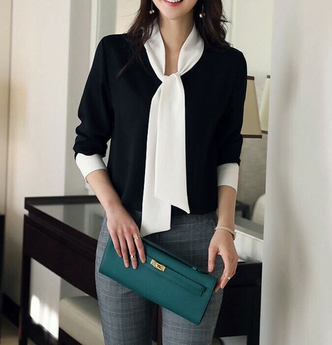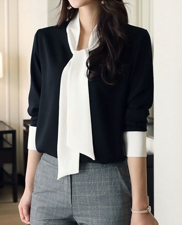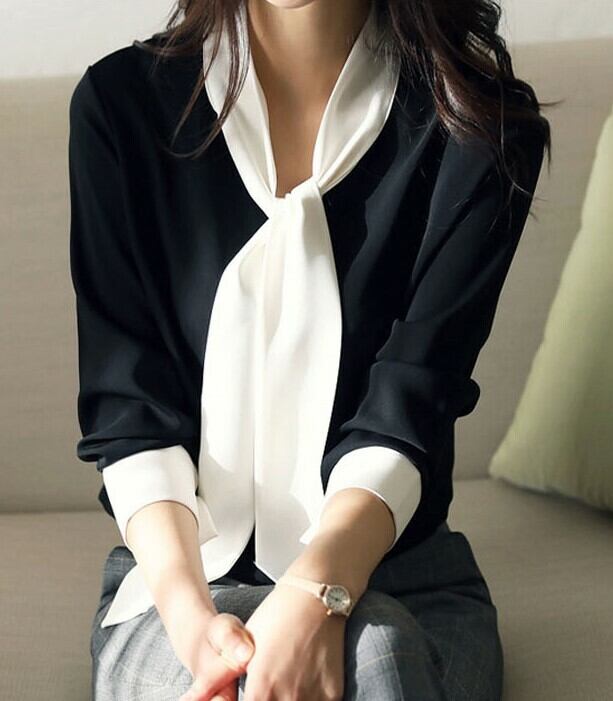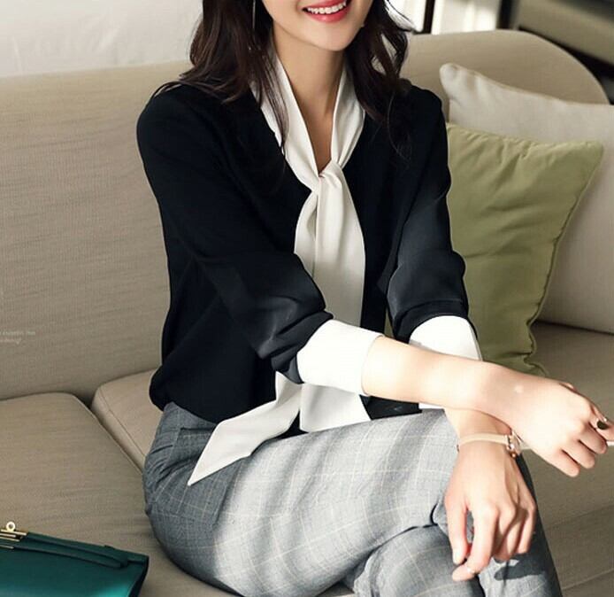 ボウタイブラウス リボン ブラック ホワイト 七分袖 Vネック オフィスカジュアル 通勤 通学 上品 エレガント 韓国 オルチャン クラシカル 大人かわいい