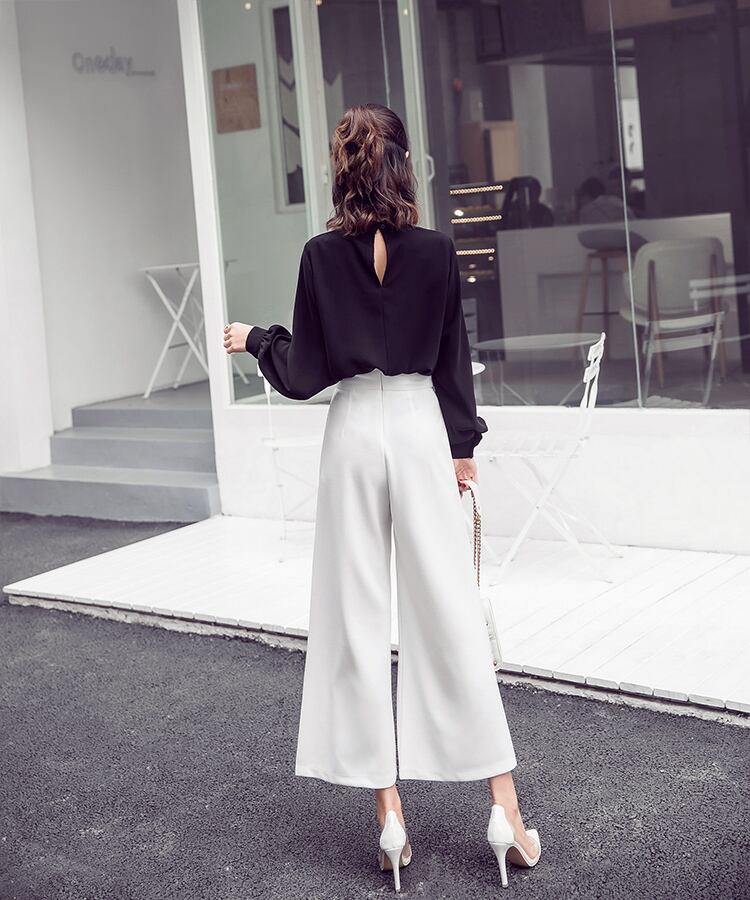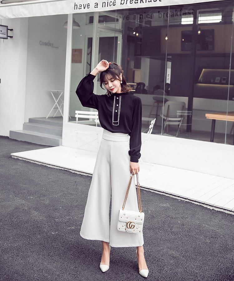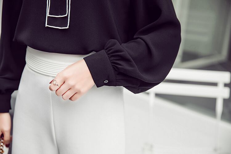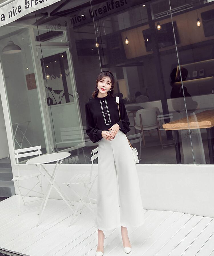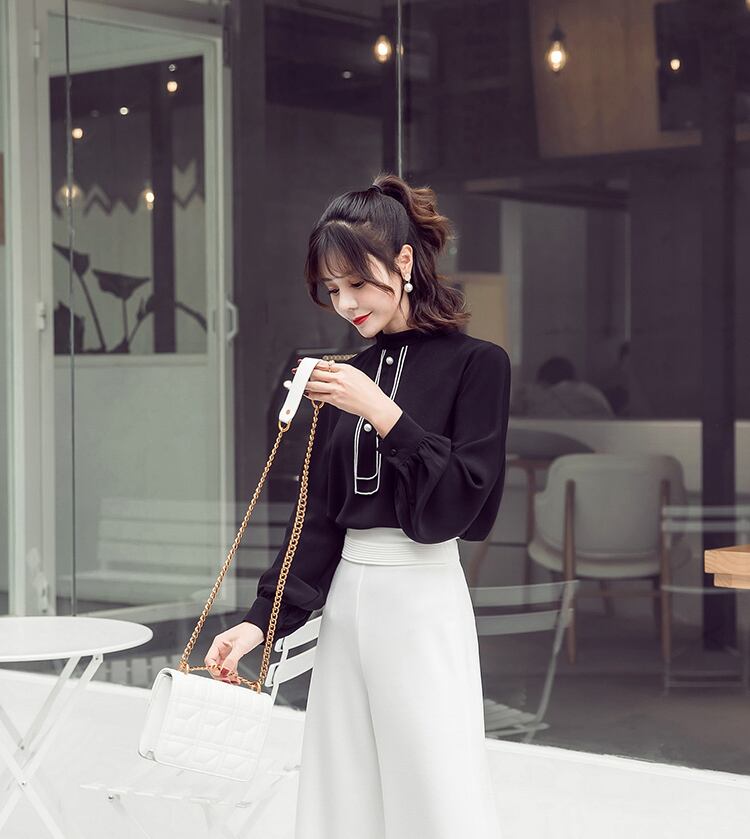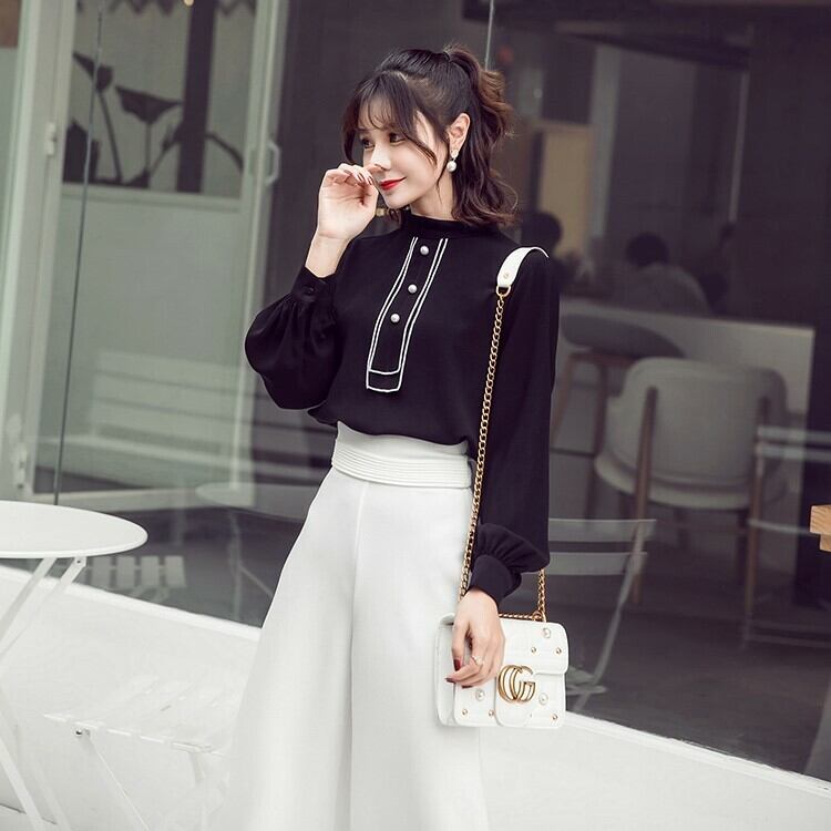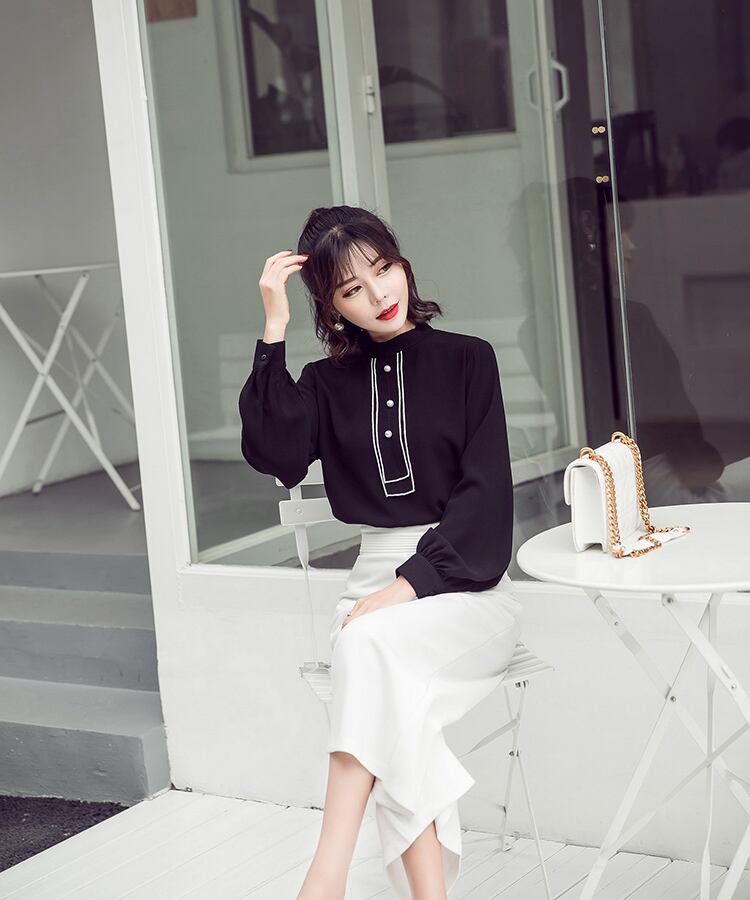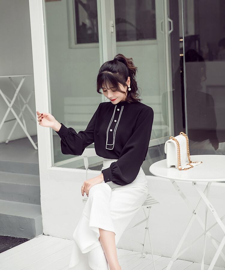 パールボタン付き ブラウス スタンドカラー 長袖 ランタンスリーブ ブラック オフィスカジュアル 通勤 お呼ばれ 食事会 エレガント 上品 クラシカル 韓国 オルチャン