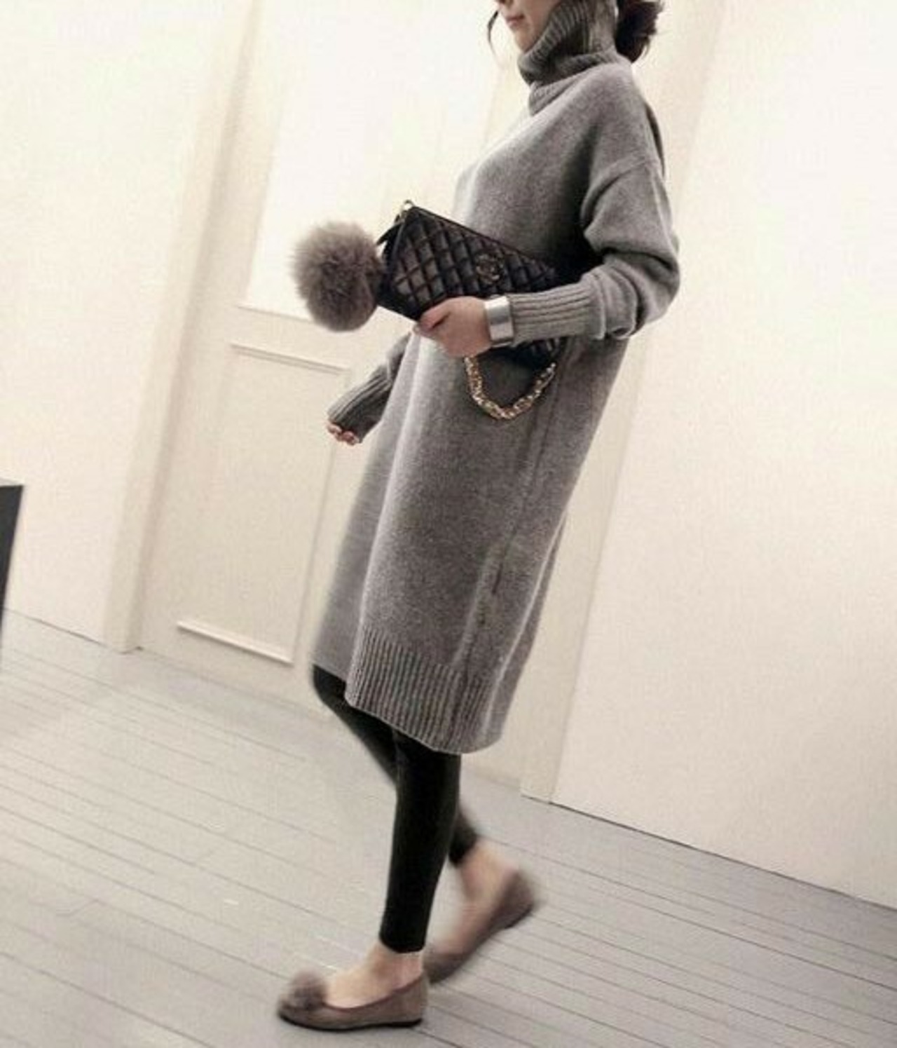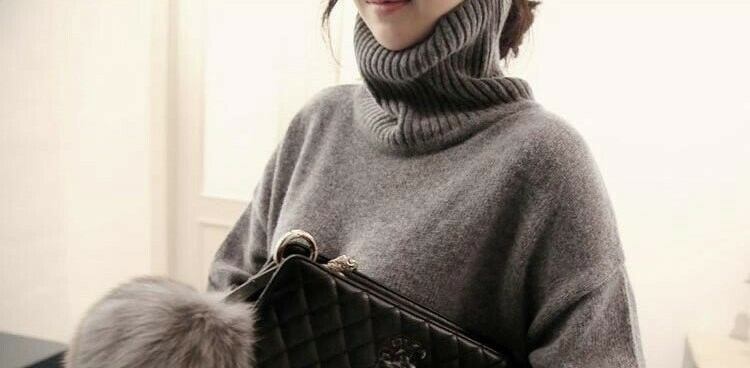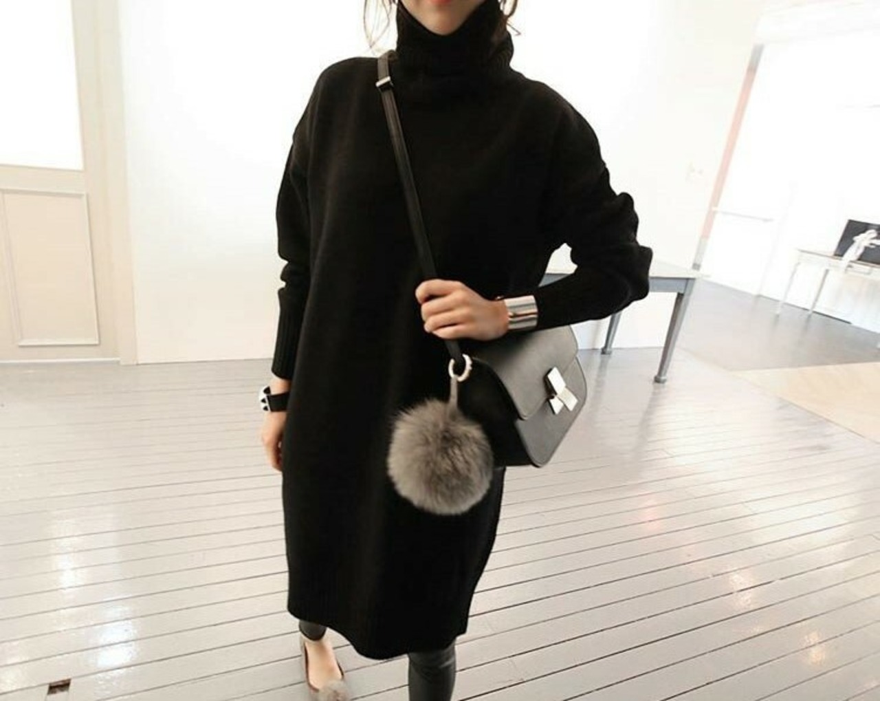 トレンドのタートルネックですっきりさせ、きれいめな着こなしに。