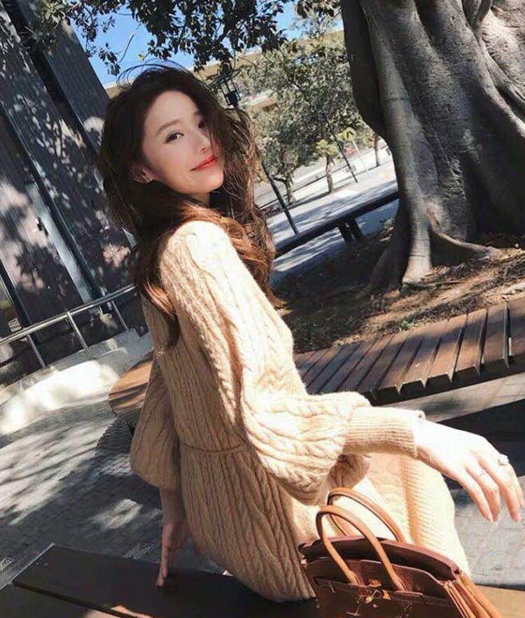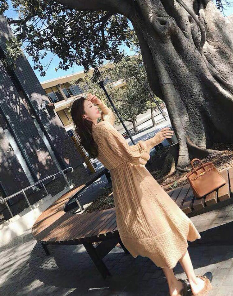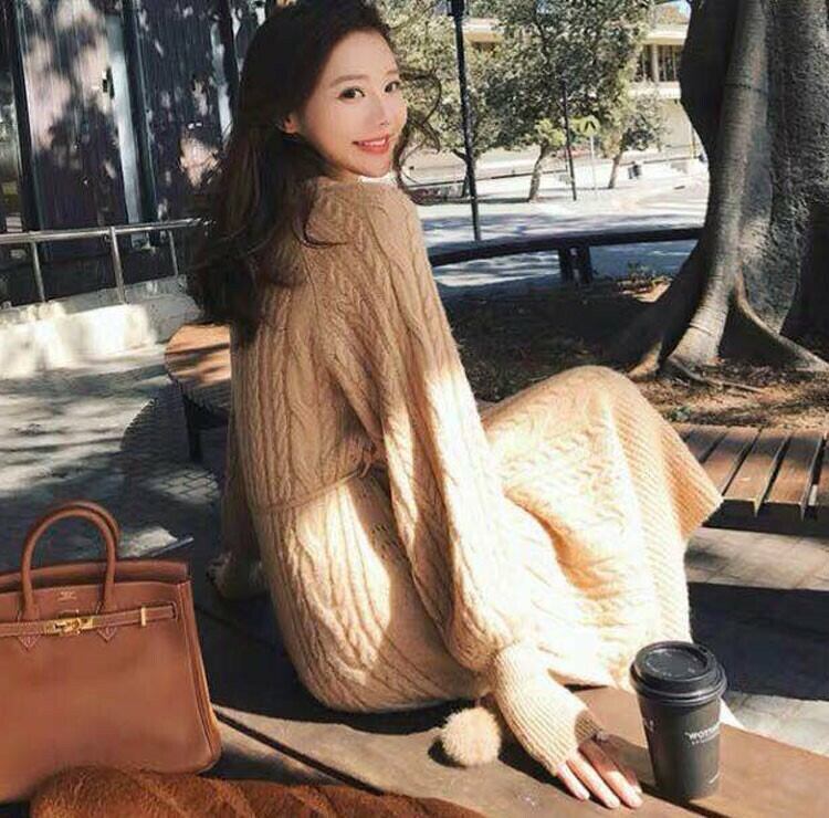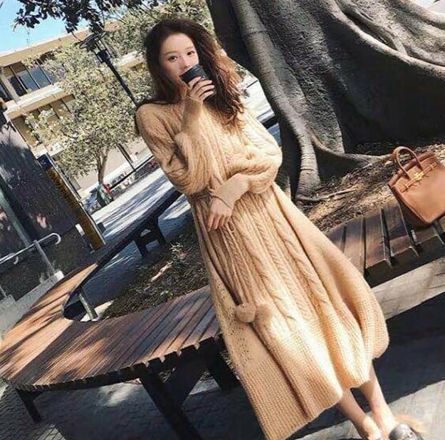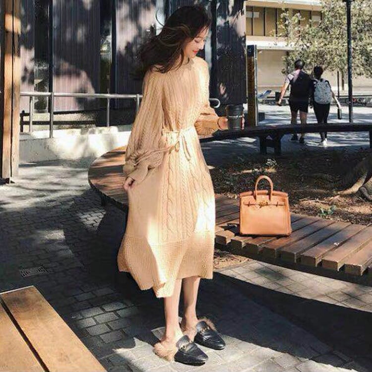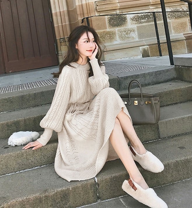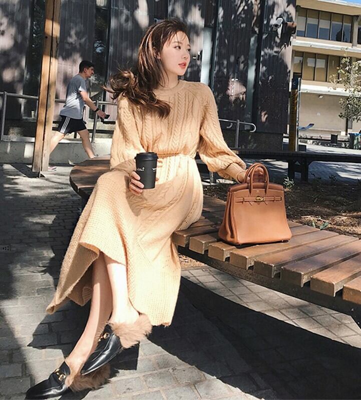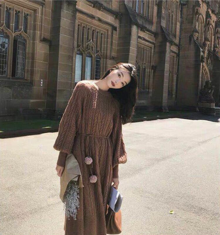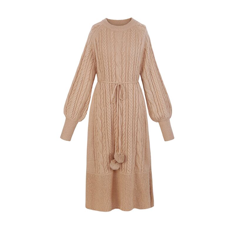 全3色 ニットワンピース ニットドレス ベージュ ホワイト ブラウン ウエストリボン ラウンドネック ケーブル編み 長袖 韓国 オルチャン 大人カジュアル エレガント フェミニン