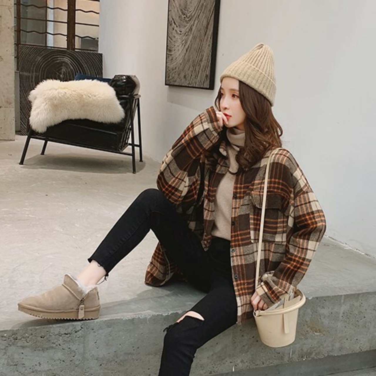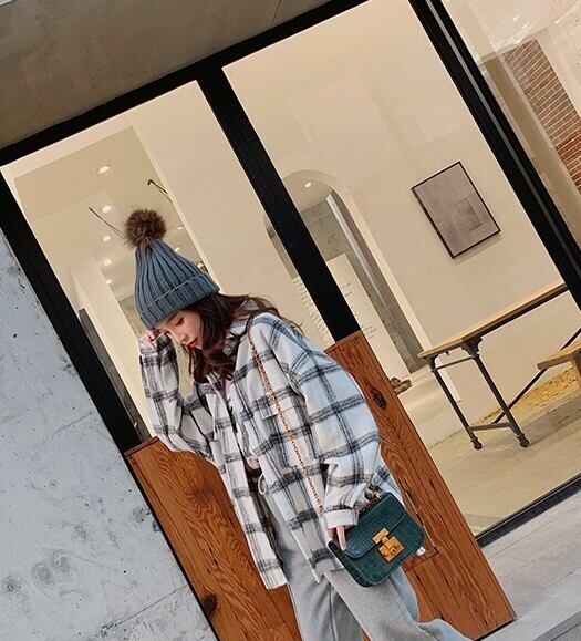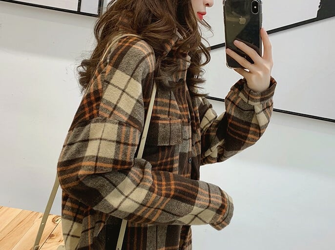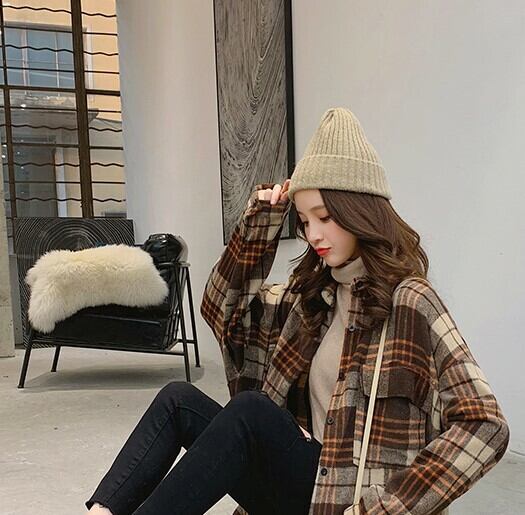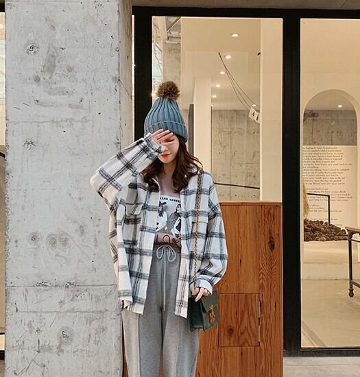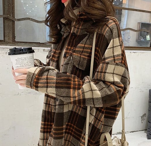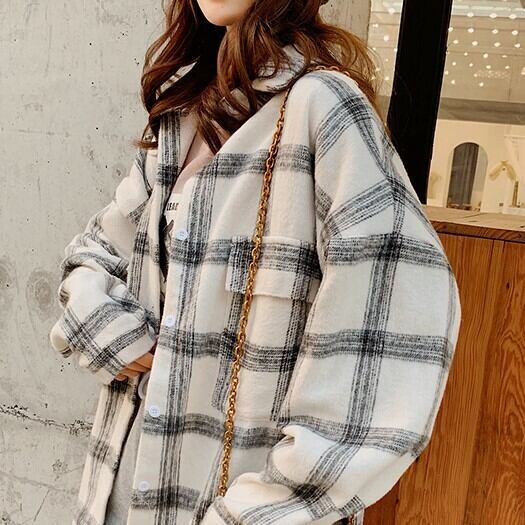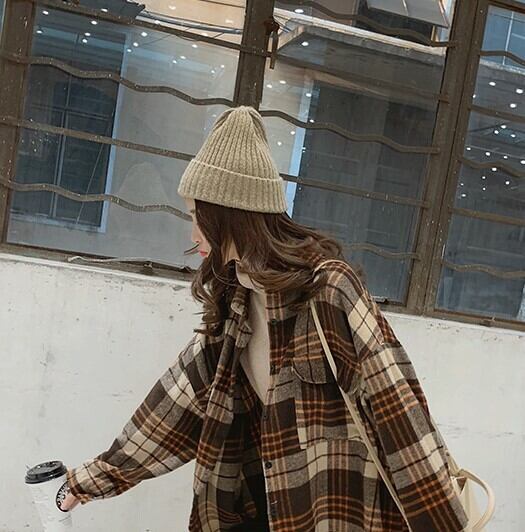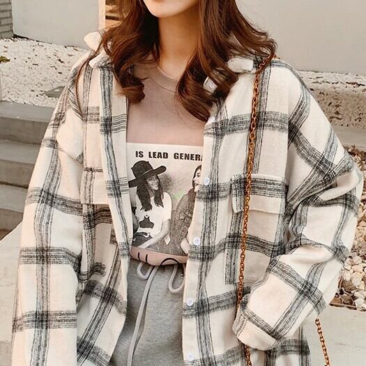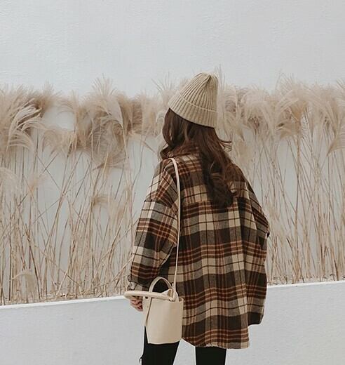 ネルシャツ ブラウス ブラウン グレー チェック柄 長袖 ドロップショルダー 秋 冬 大人カジュアル 大人かわいい レトロ ナチュラル 韓国 オルチャン