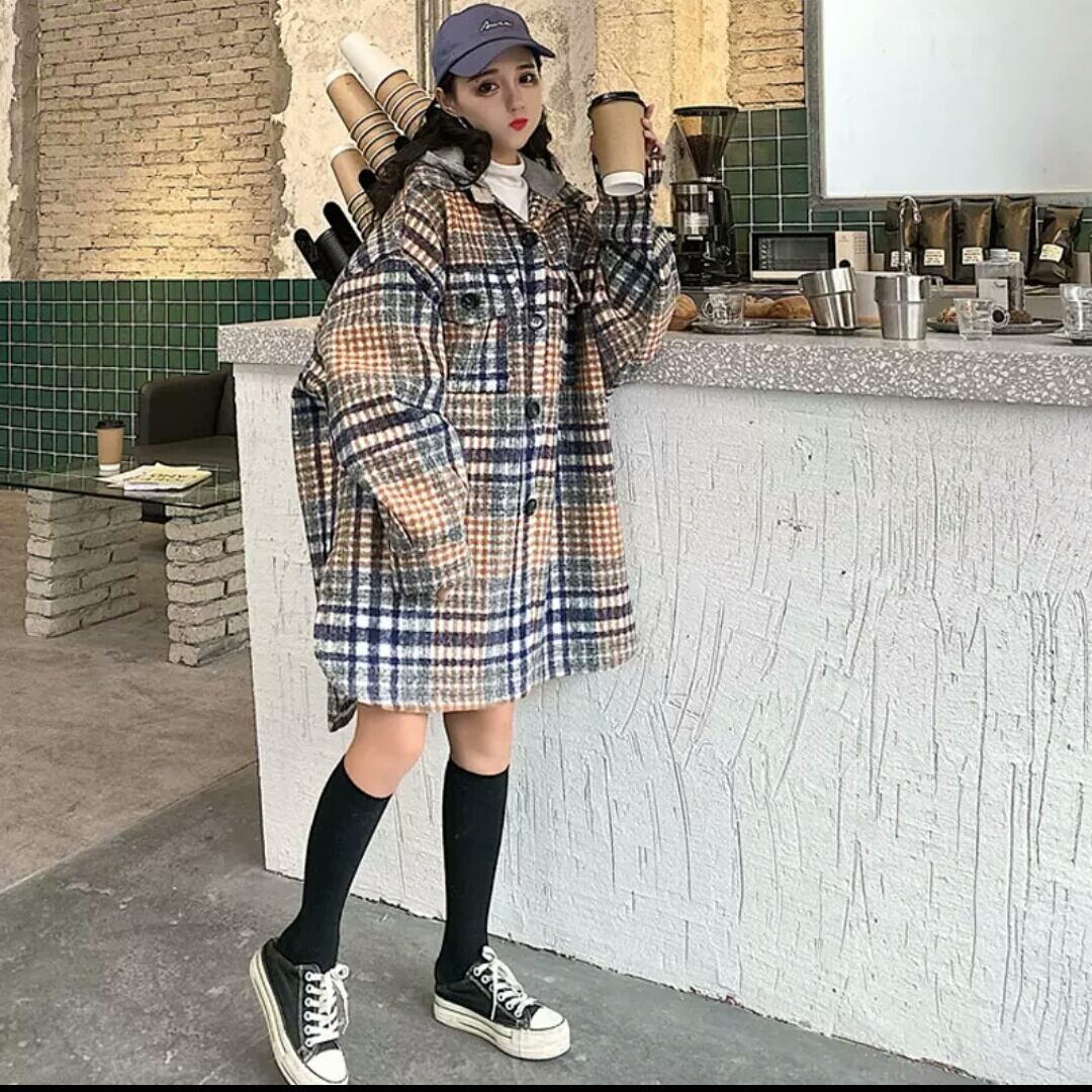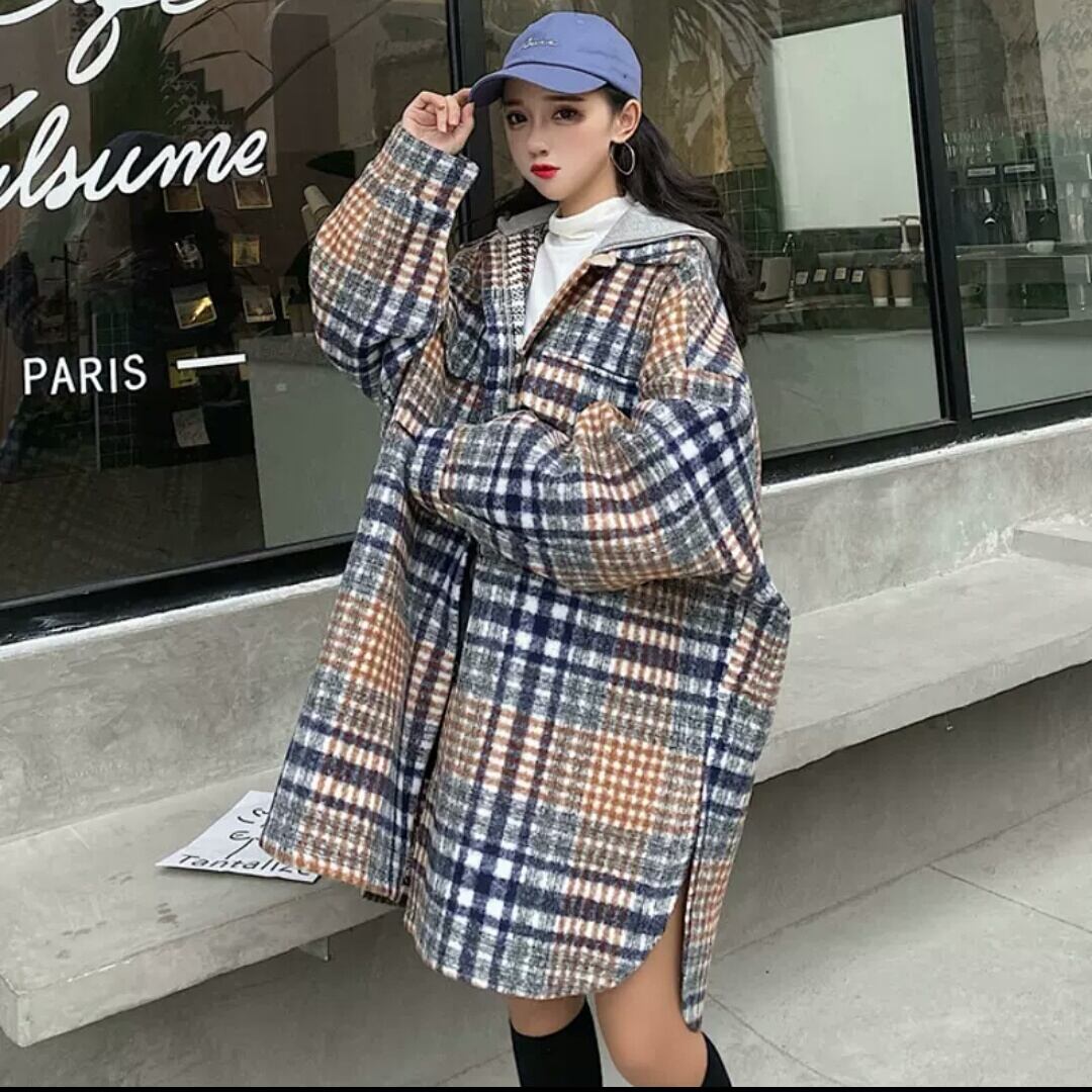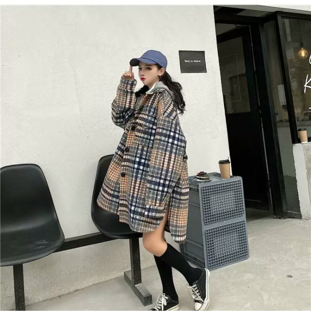 チェック柄 フードつき コート アウター オーバーサイズ 大きめ ゆったり フリーサイズ お出かけ お買い物 デート 女子会 秋冬 春 通学 通勤