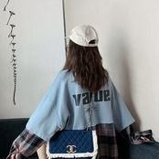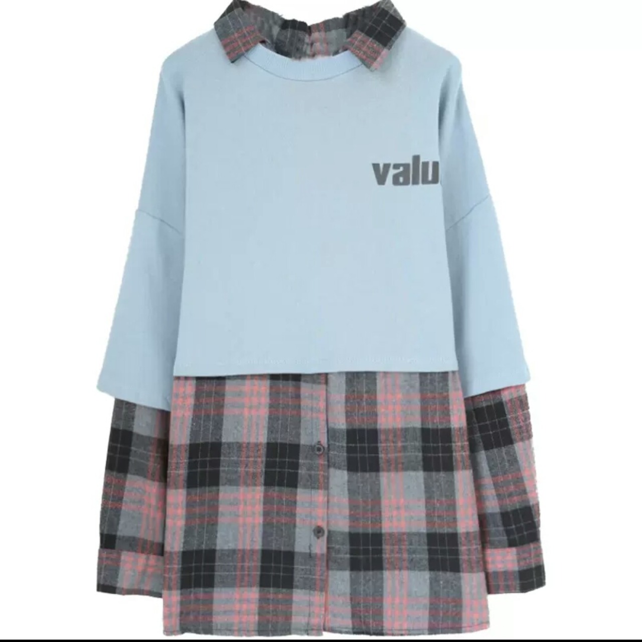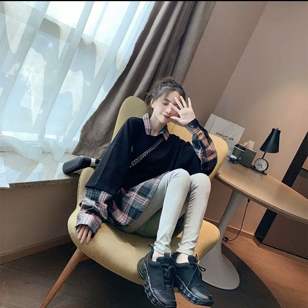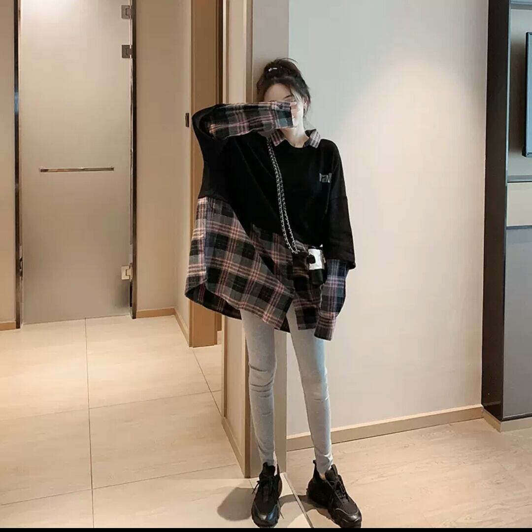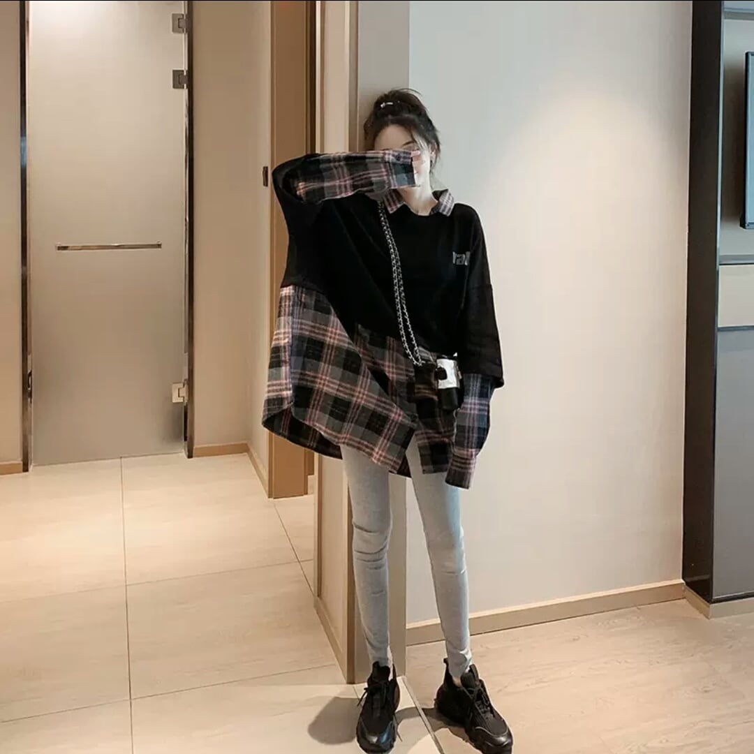 全2色 異素材 切り替え プルオーバー チェック柄 トップス 長袖 大人 カジュアル 可愛い お出かけ お買い物 デート 女子会 秋冬 春 学生