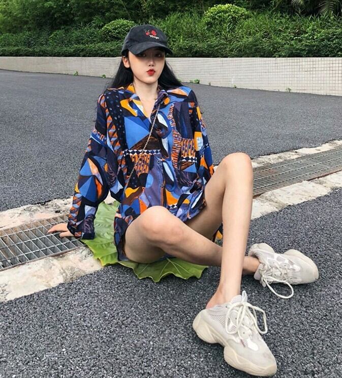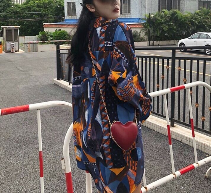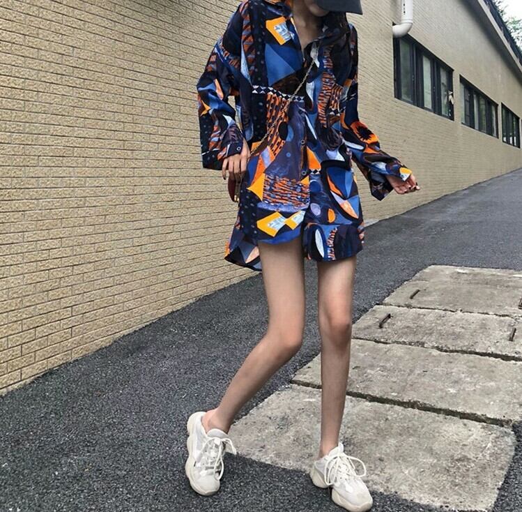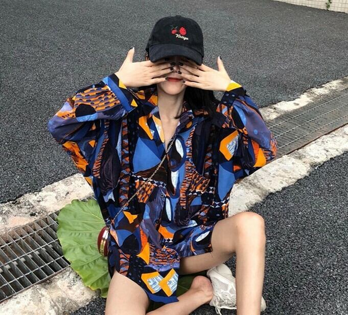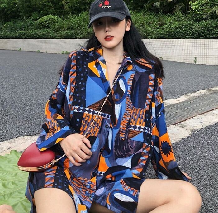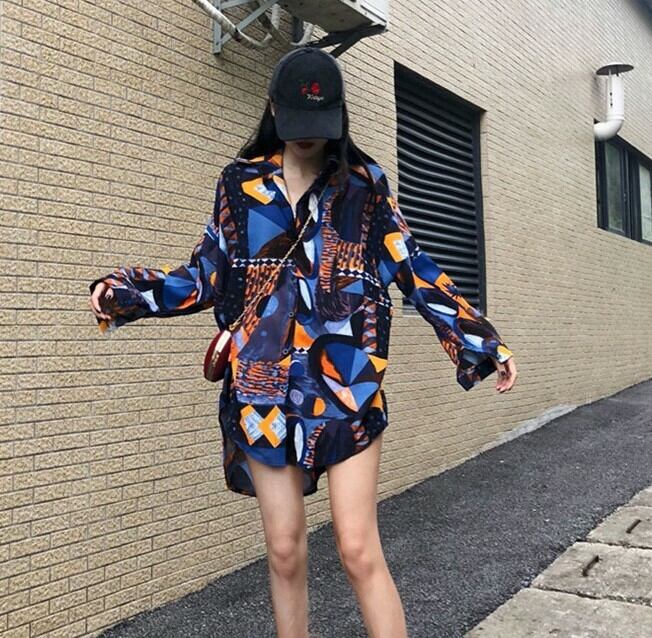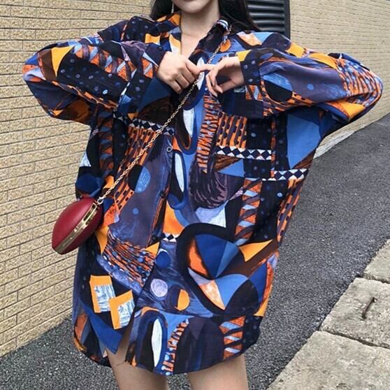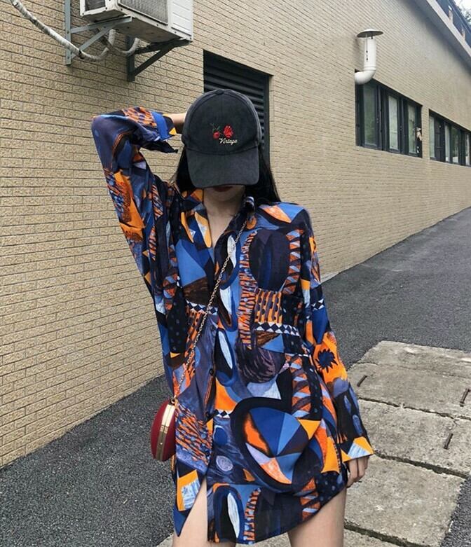 プリントブラウス シャツ 開襟 長袖 ドロップショルダー オーバーサイズ カジュアル スポーティ ヴィンテージ風 レトロ 韓国 オルチャン ストリート