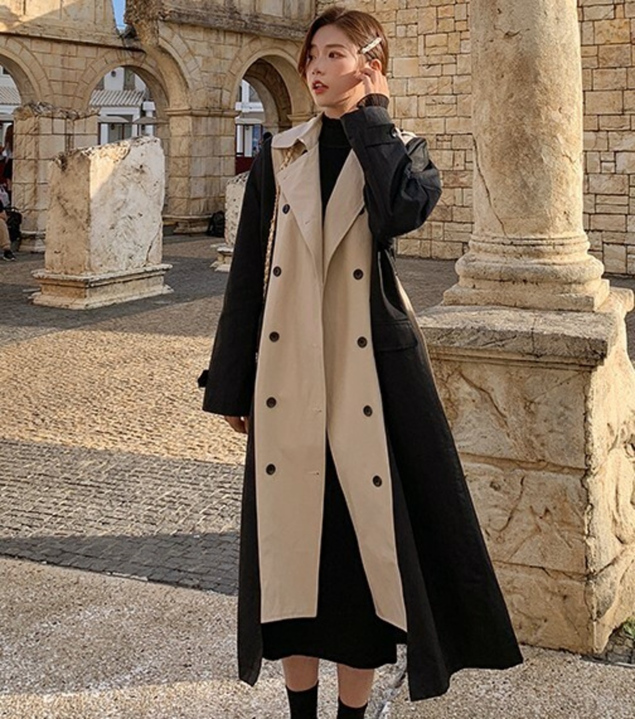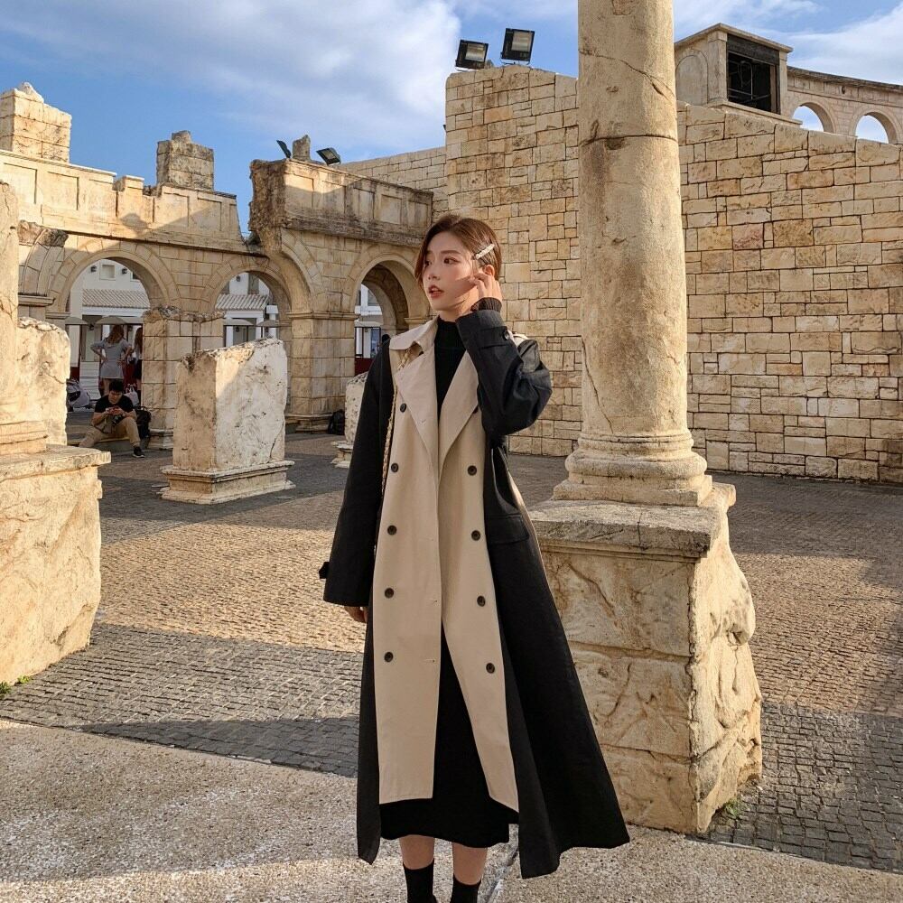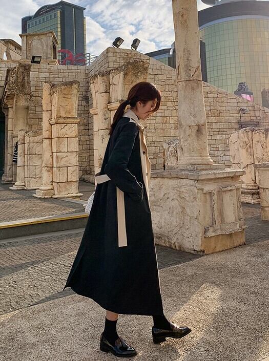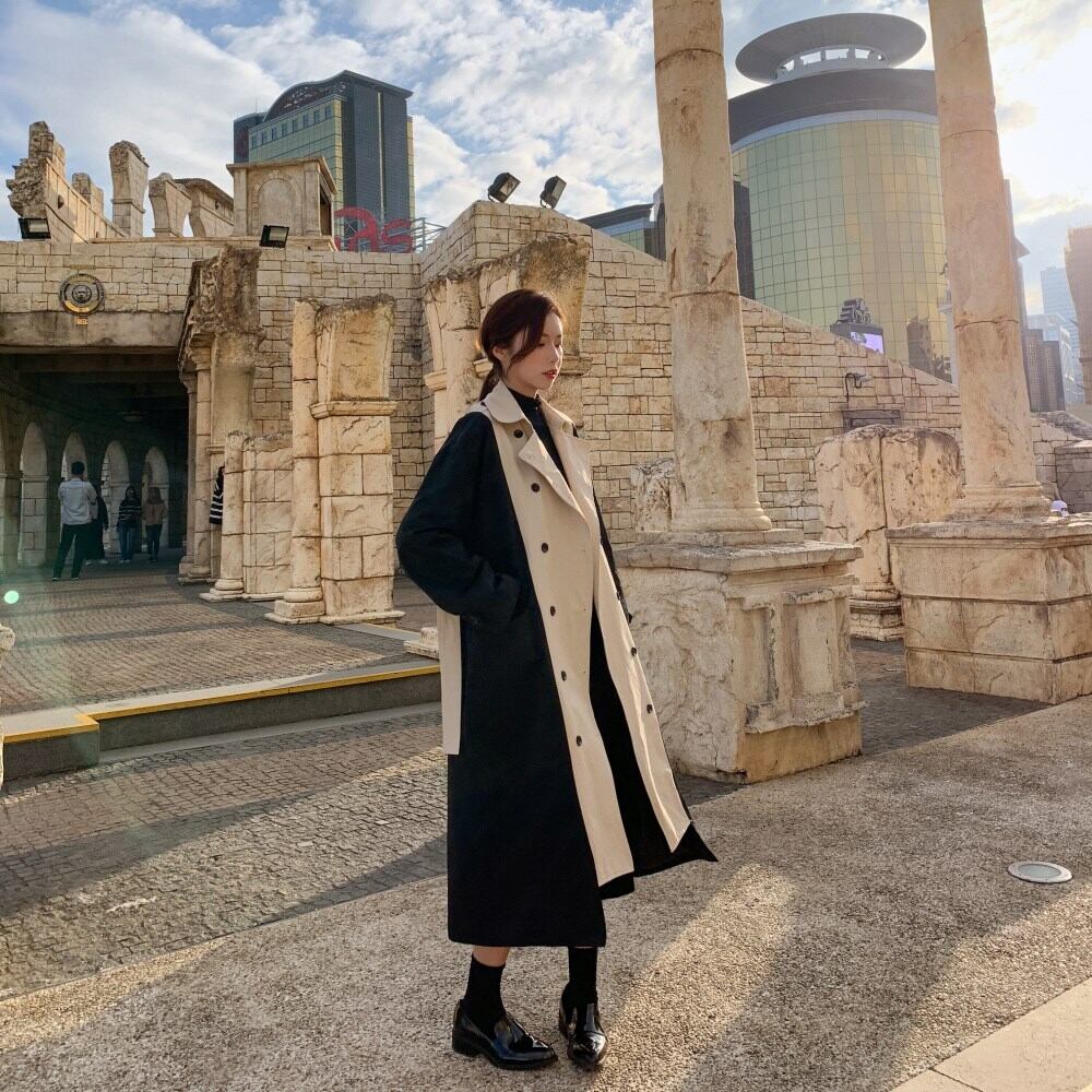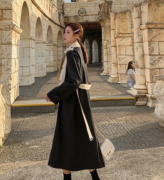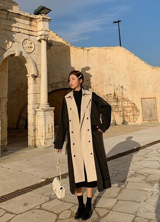 バイカラー トレンチコート ベージュ アウター ロング 羽織 ウエストベルト きれいめ カジュアル レトロ クラシカル 秋 韓国 オルチャン