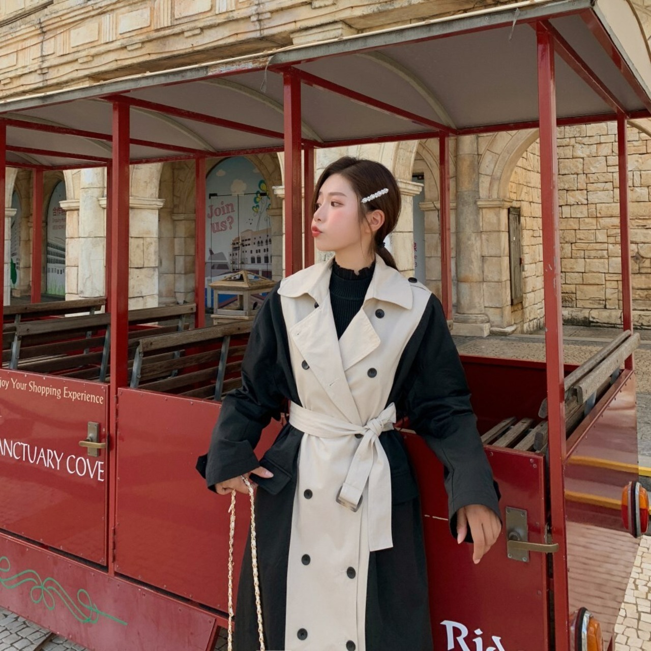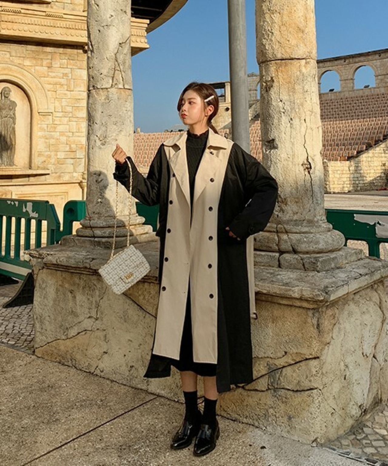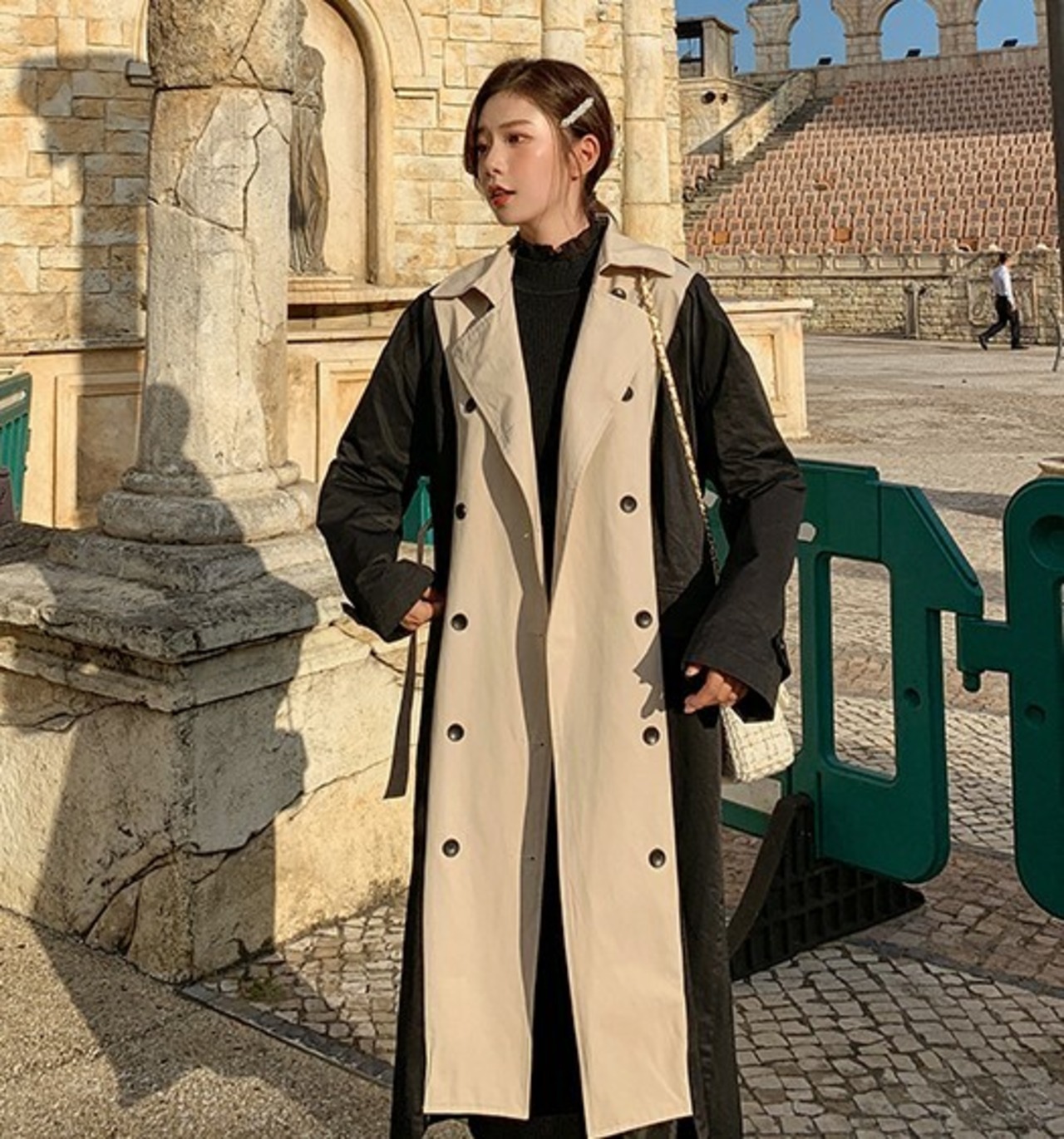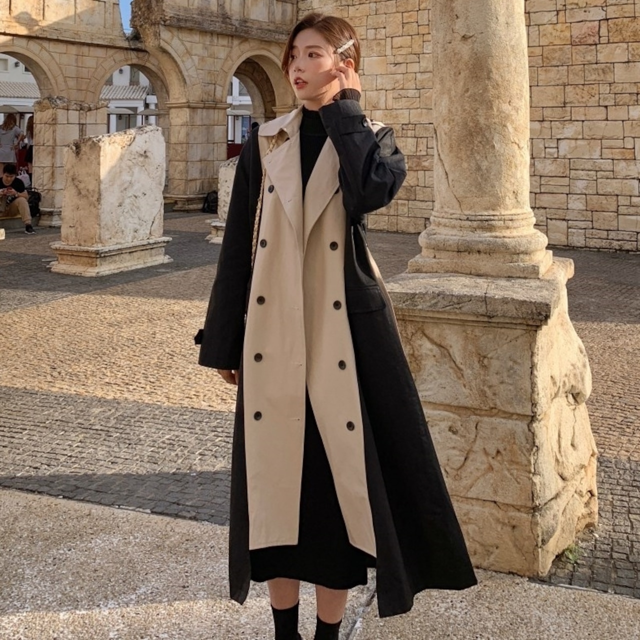 バイカラー トレンチコート ベージュ アウター ロング 羽織 ウエストベルト きれいめ カジュアル レトロ クラシカル 秋 韓国 オルチャン