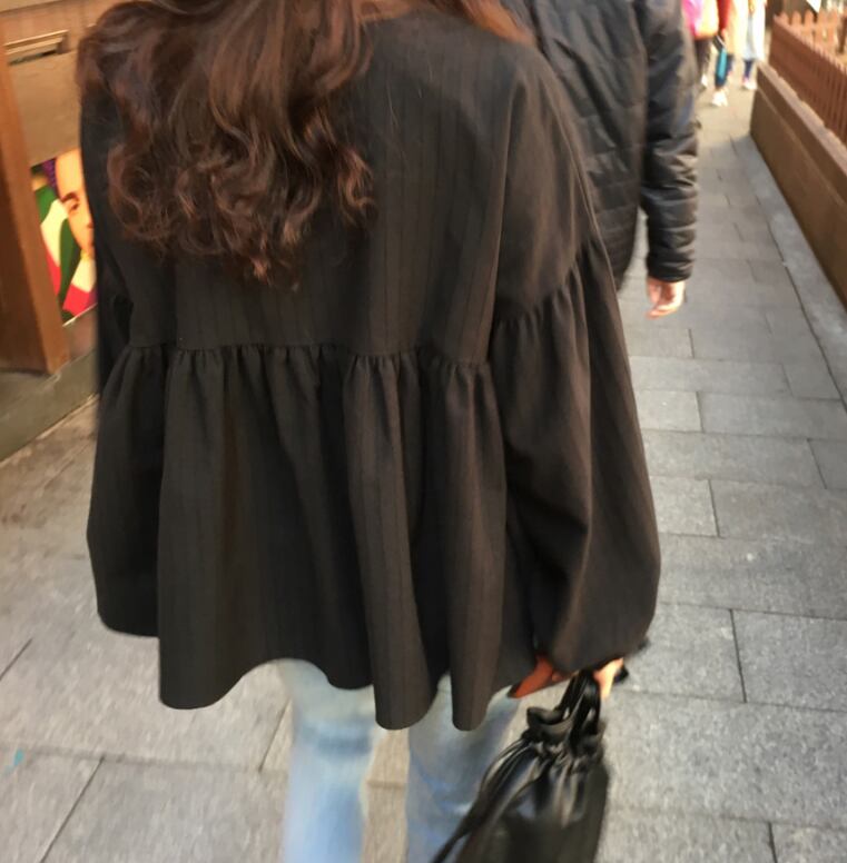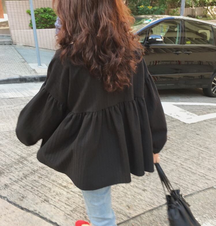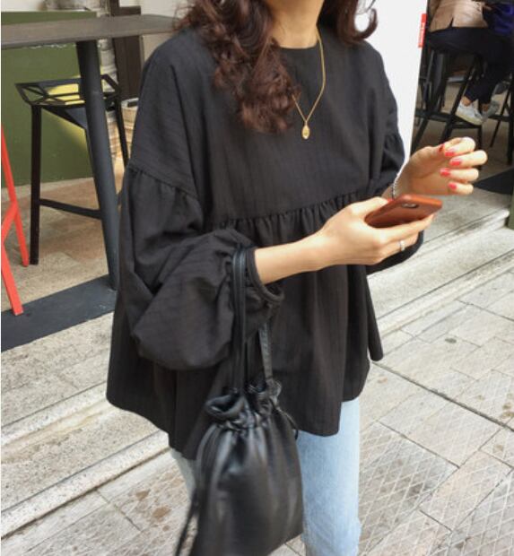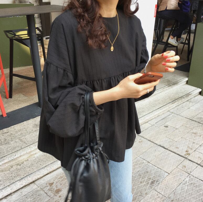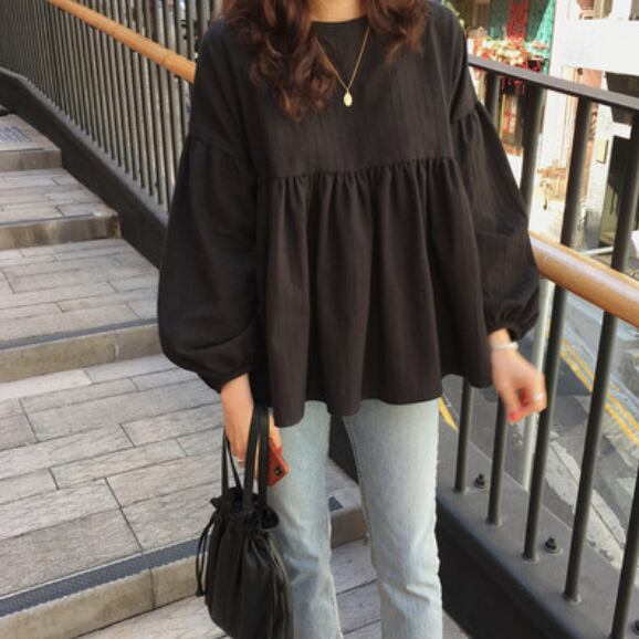 トップス ブラウス ハイウエスト ウエスト切り替え ギャザー ランタンスリーブ 袖切り替え ラウンドネック 長袖 ゆったり ブラック カジュアル 秋冬