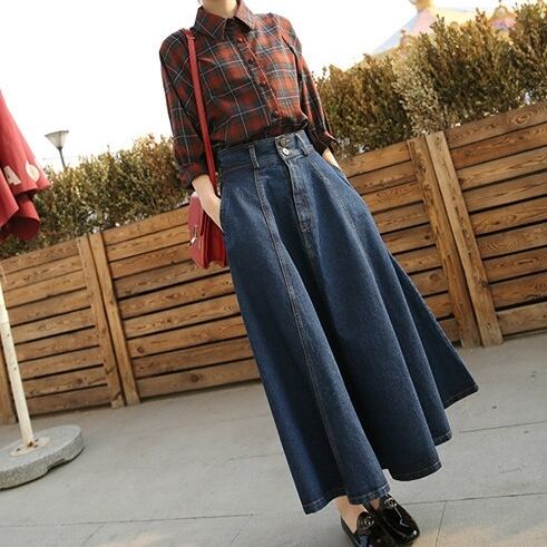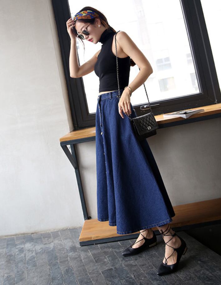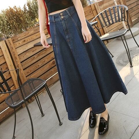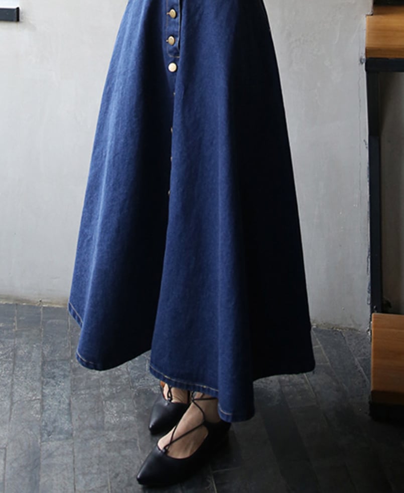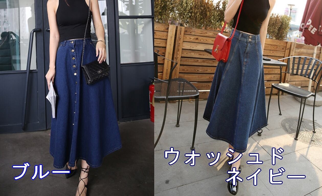 全2色 スカート フレア デニム ハイウエスト Aライン ロング丈 フロントボタン ポケット付き カジュアル お出かけ デート 秋冬
