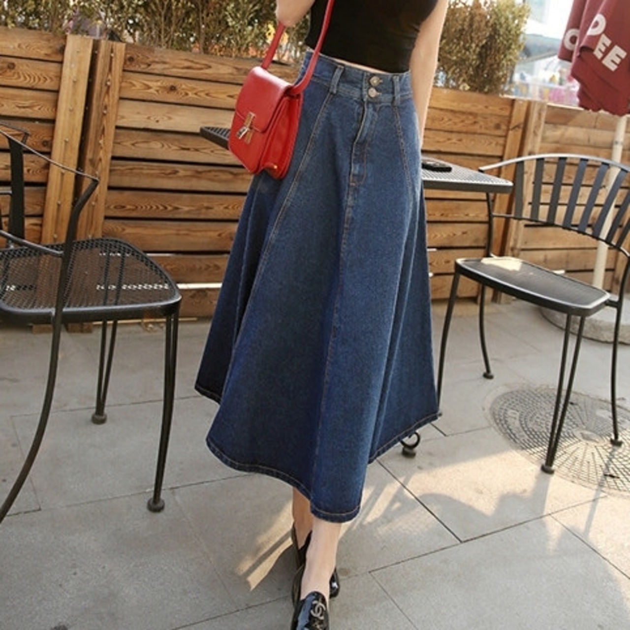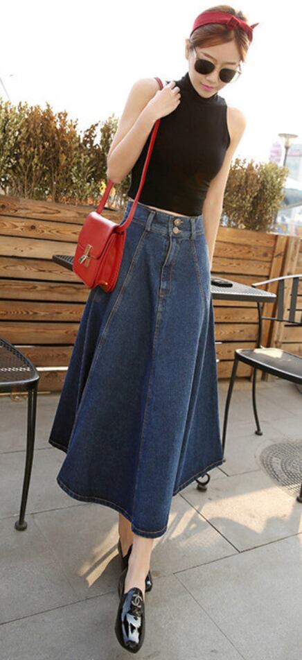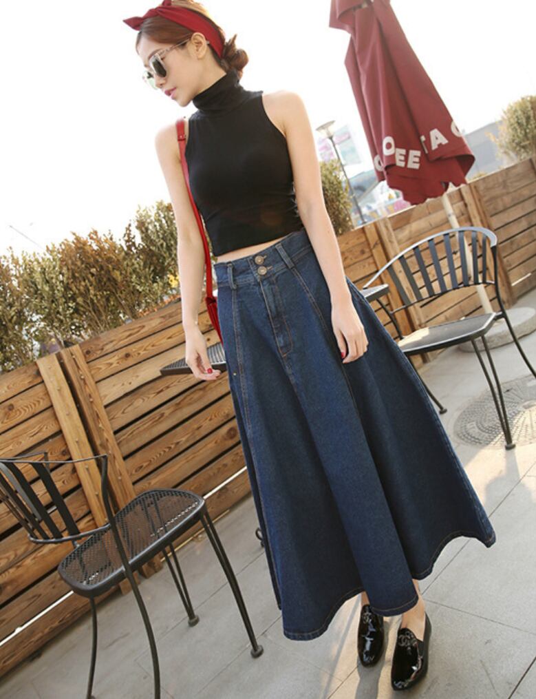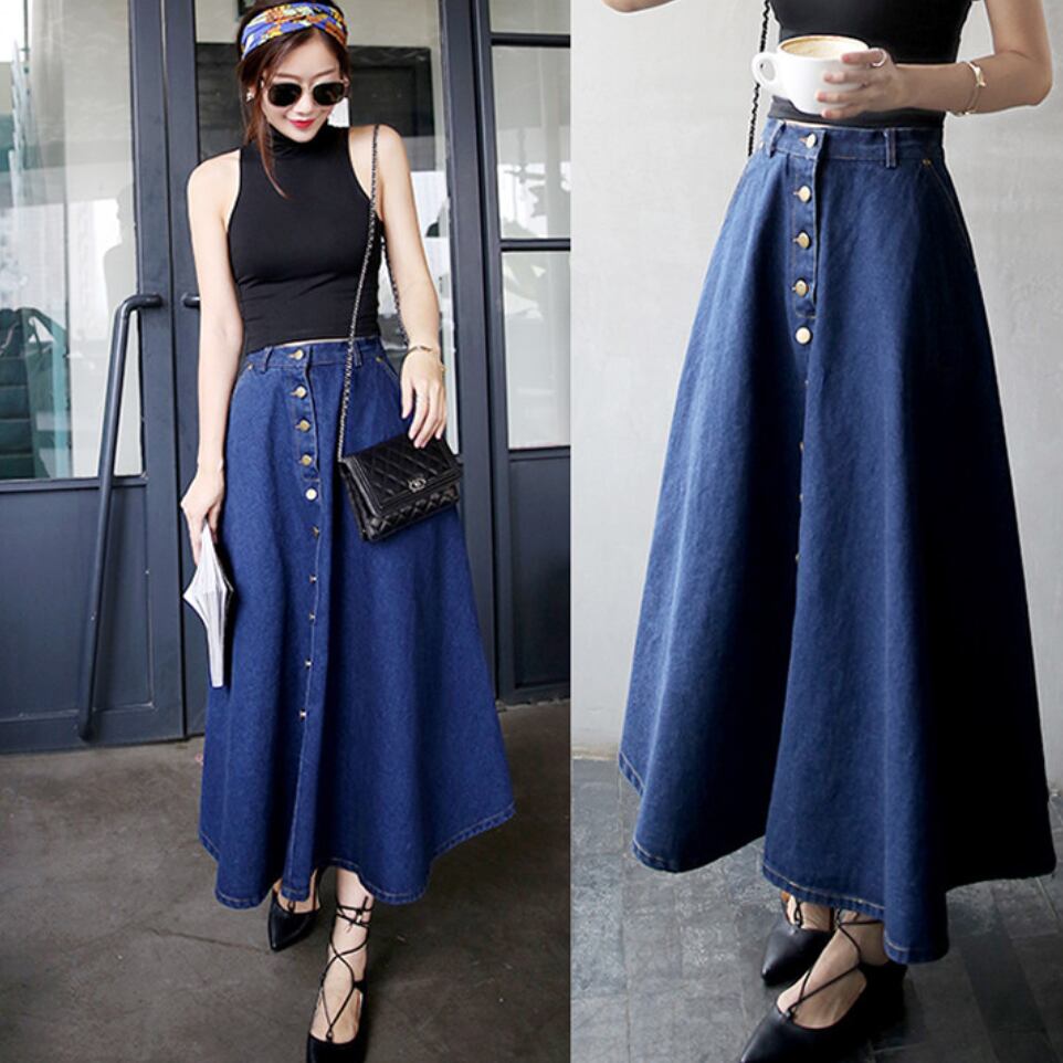 全2色 スカート フレア デニム ハイウエスト Aライン ロング丈 フロントボタン ポケット付き カジュアル お出かけ デート 秋冬