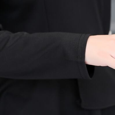 シンプルなデザインが上品なスーツ。お腹周りを隠してくれる長めのトップスはオフィス等でも活躍すること間違いなし!知的でカッコイイ女性になれるスーツです。