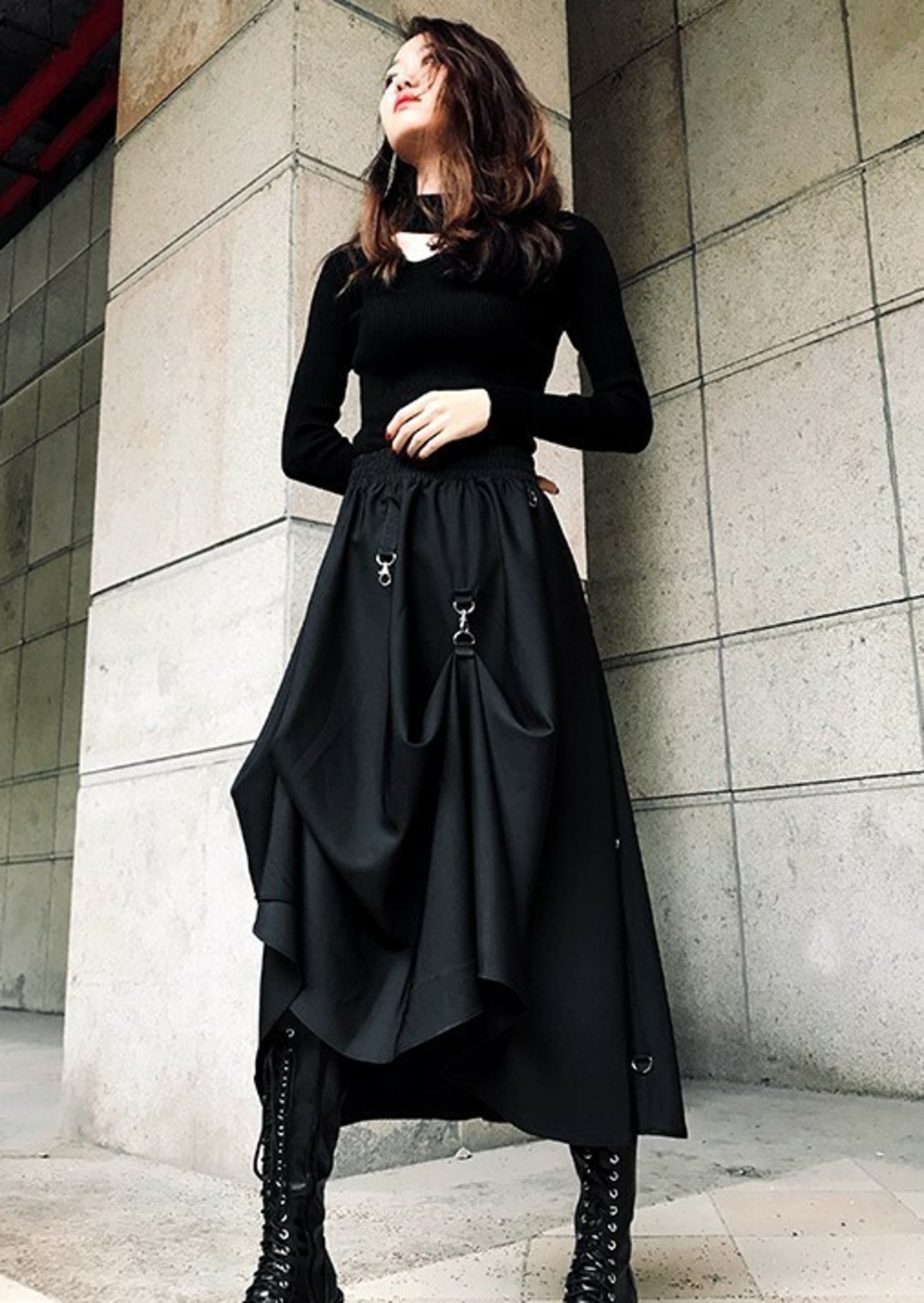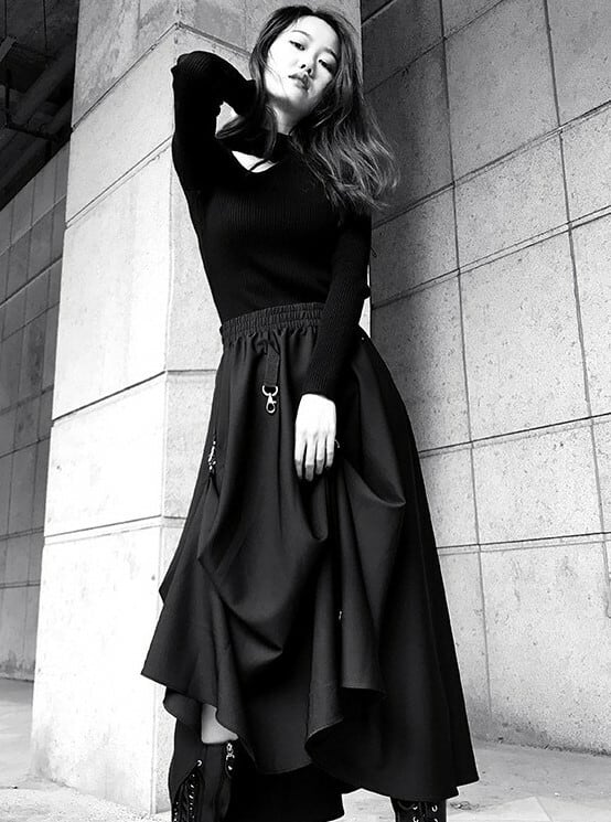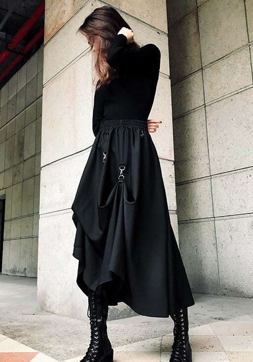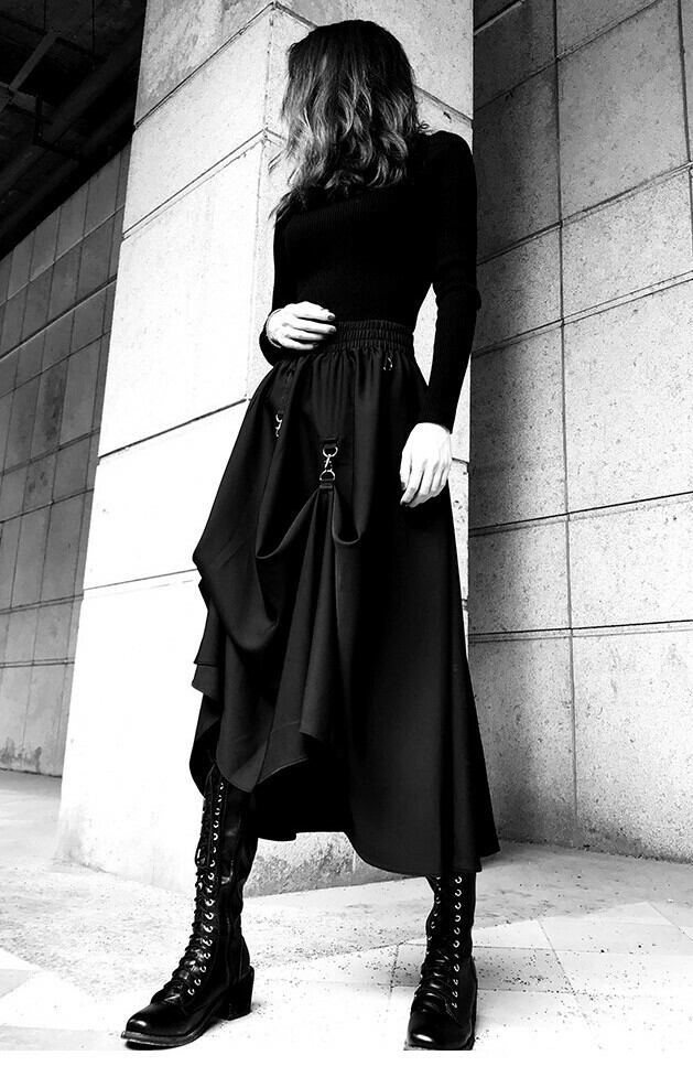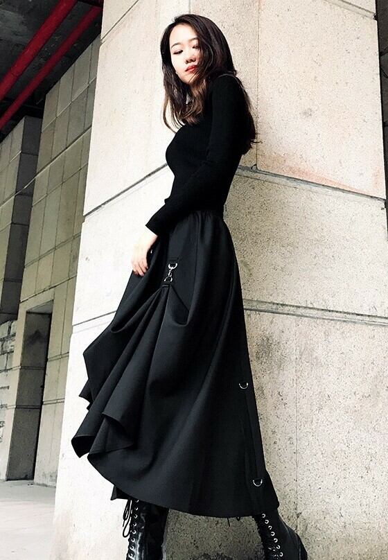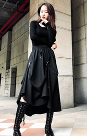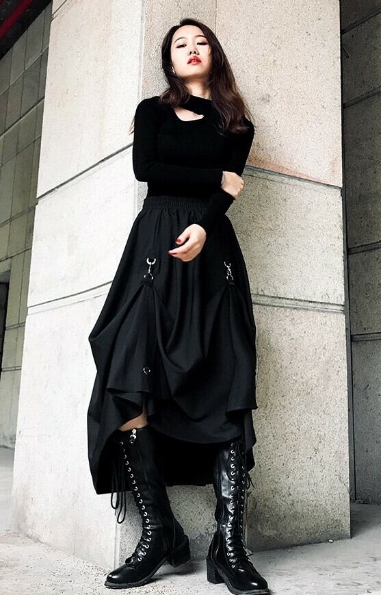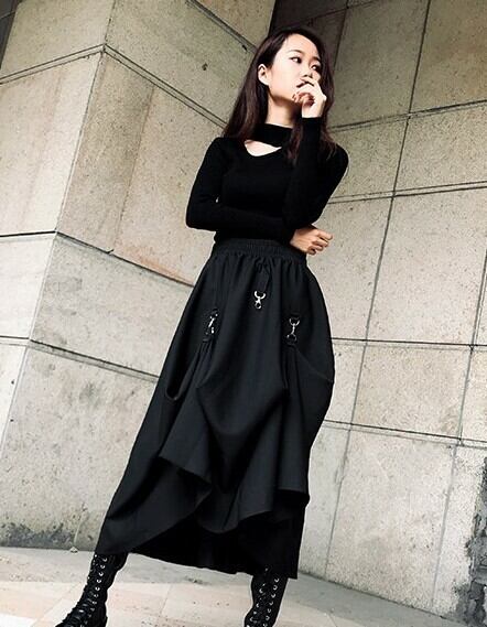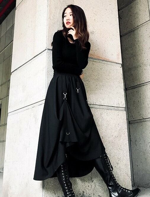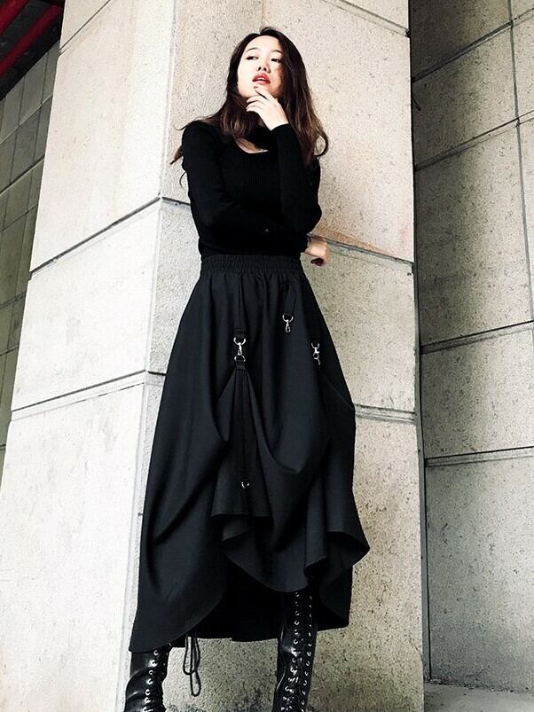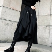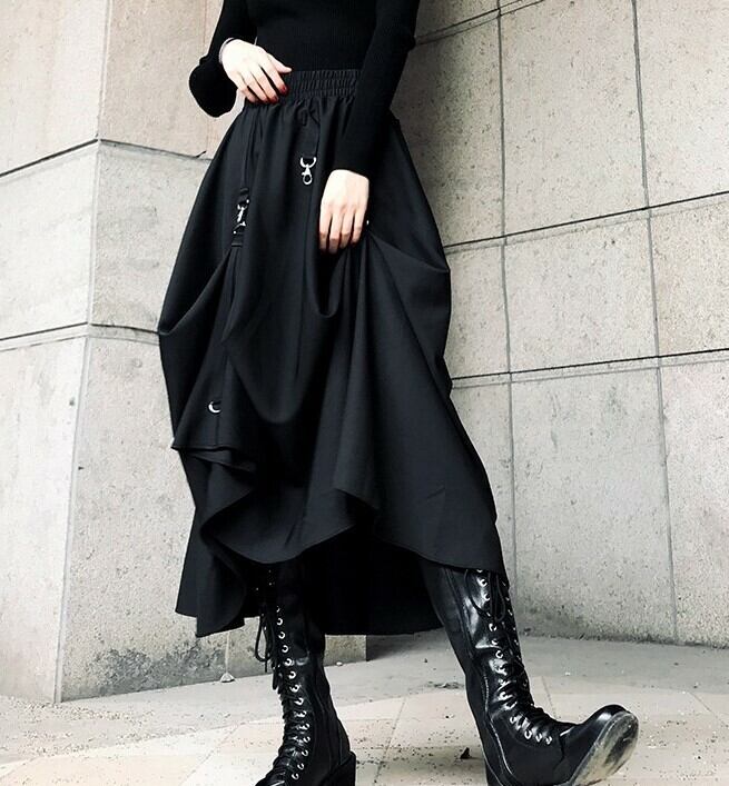ロング丈スカート ヘムスカート アシンメトリースカート ウエストゴム ボトムス 秋 冬 ブラック ハイウエスト 大人カジュアル デート 休日 通学 学生 韓国 オルチャン ハード パンク ゴスロリ