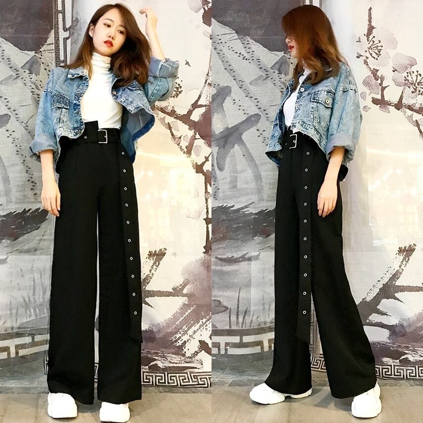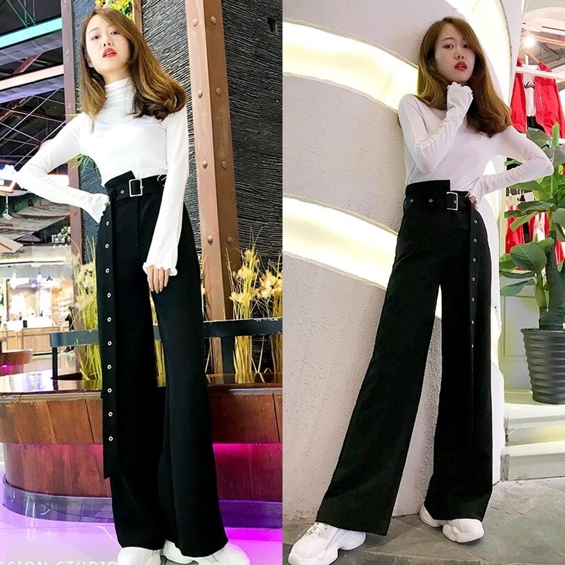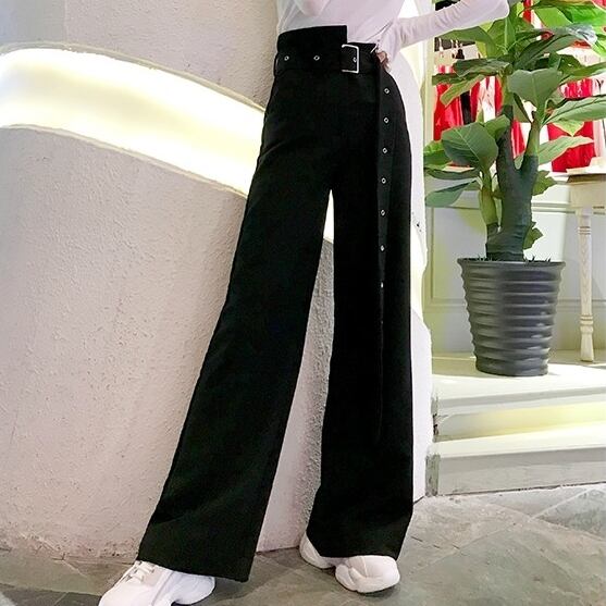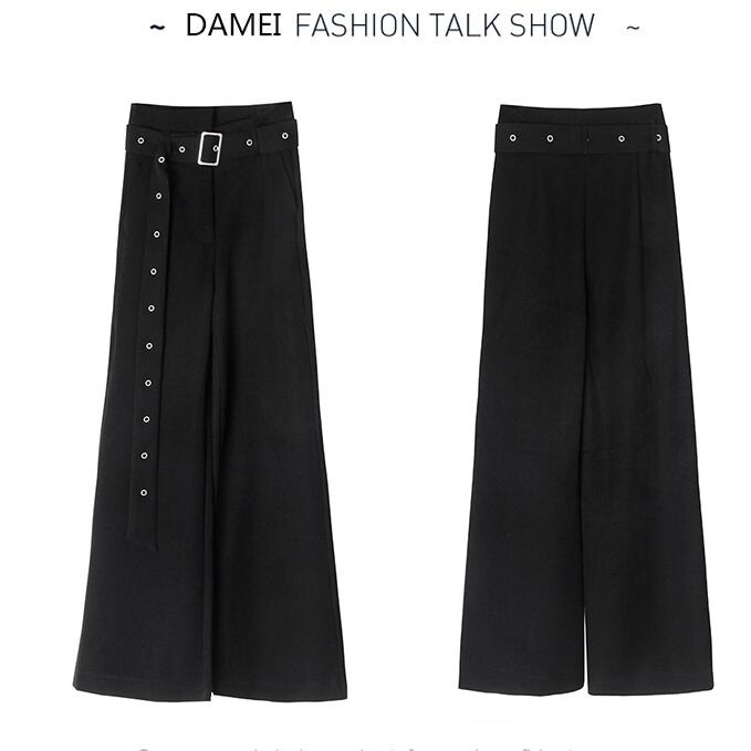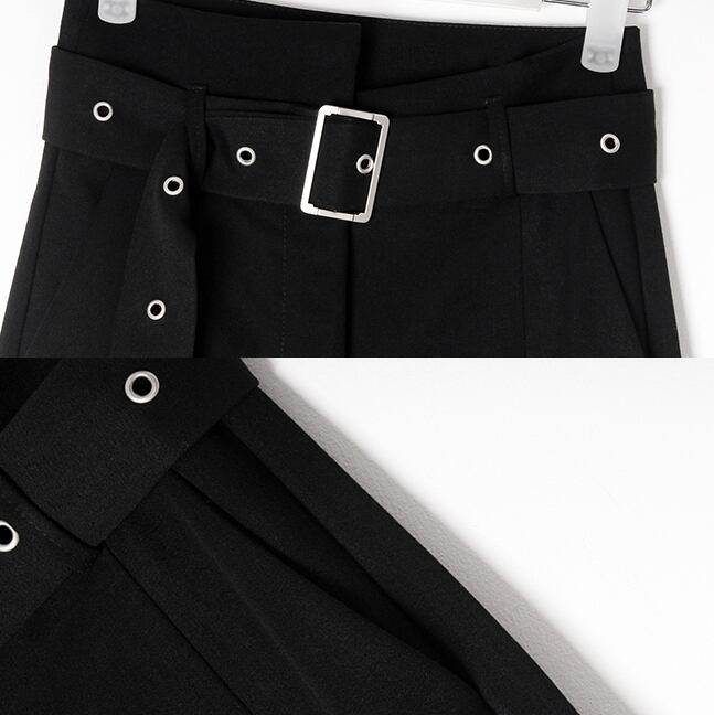 ブラック ボトム ベルト付き ハイウエスト アシンメトリー ポケット有り ワイド ゆったり BLACK かっこいい 秋冬 おしゃれ レディース アパレル