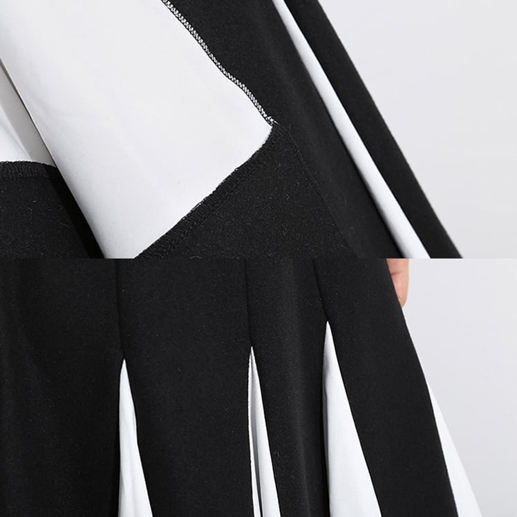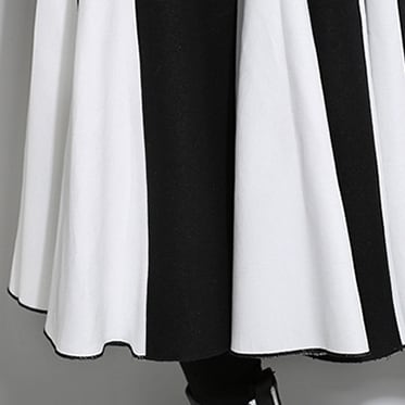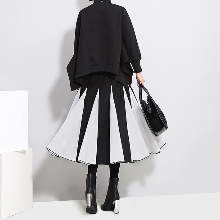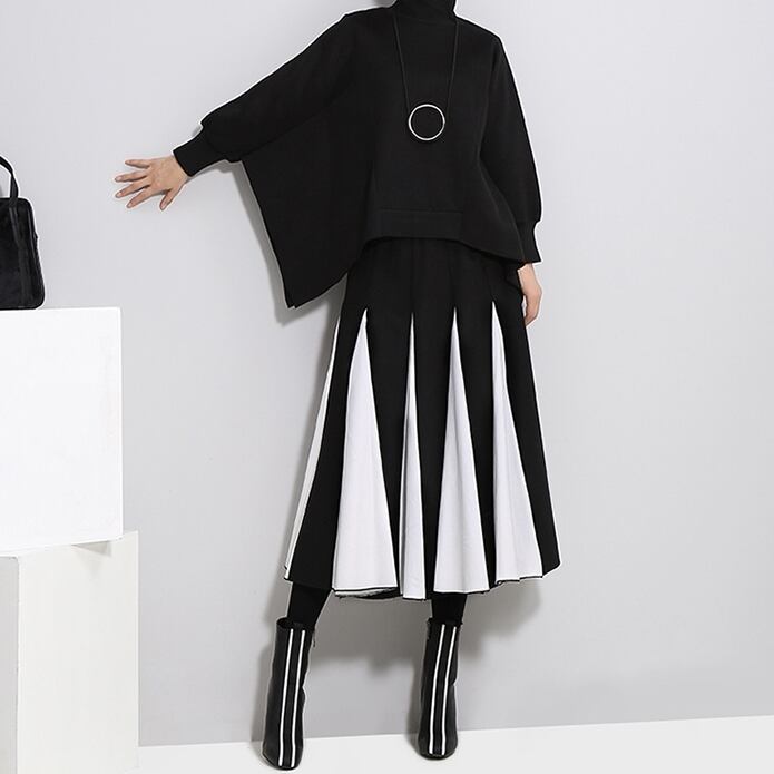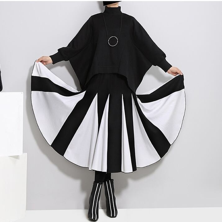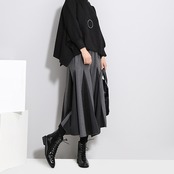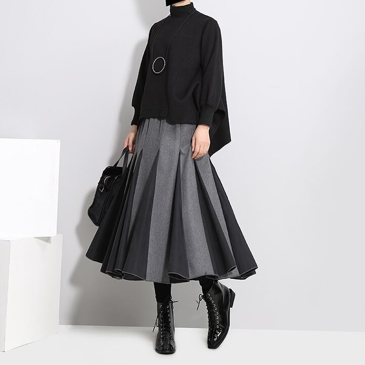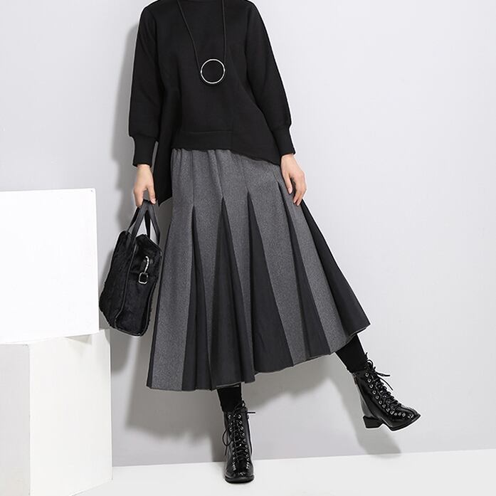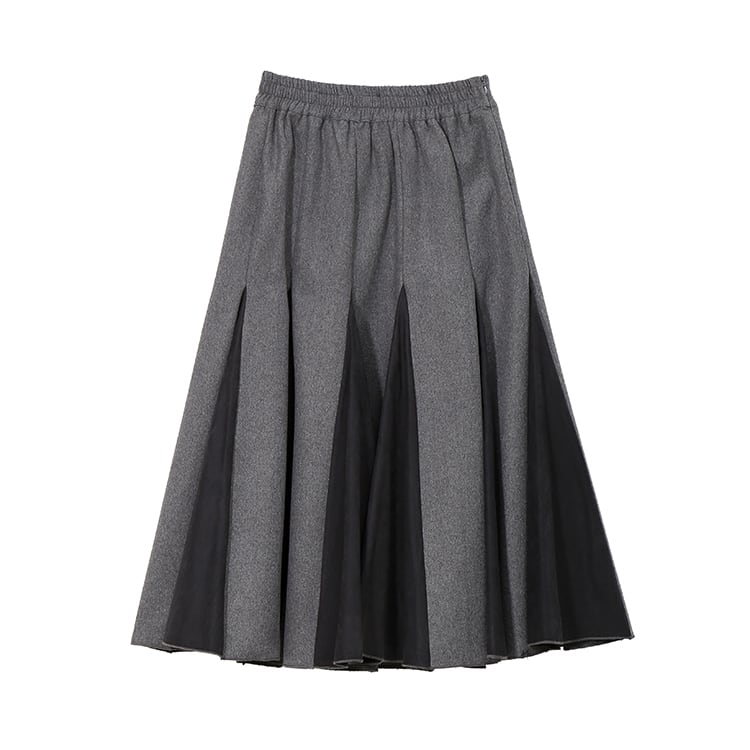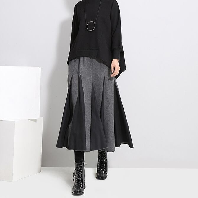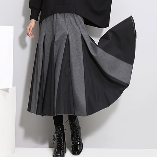 全2色 バイカラー スカート ハイウエスト サイドジッパー ウエストゴム ワイドスカート ひざ下 秋冬