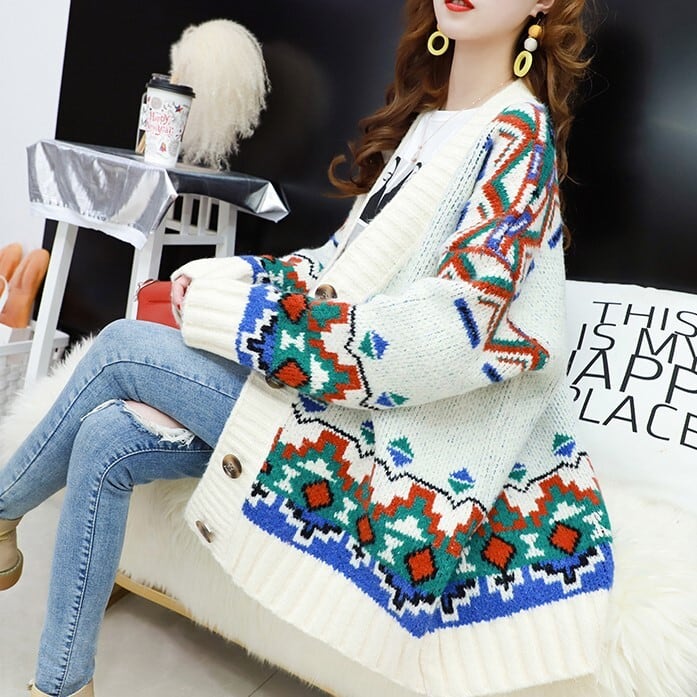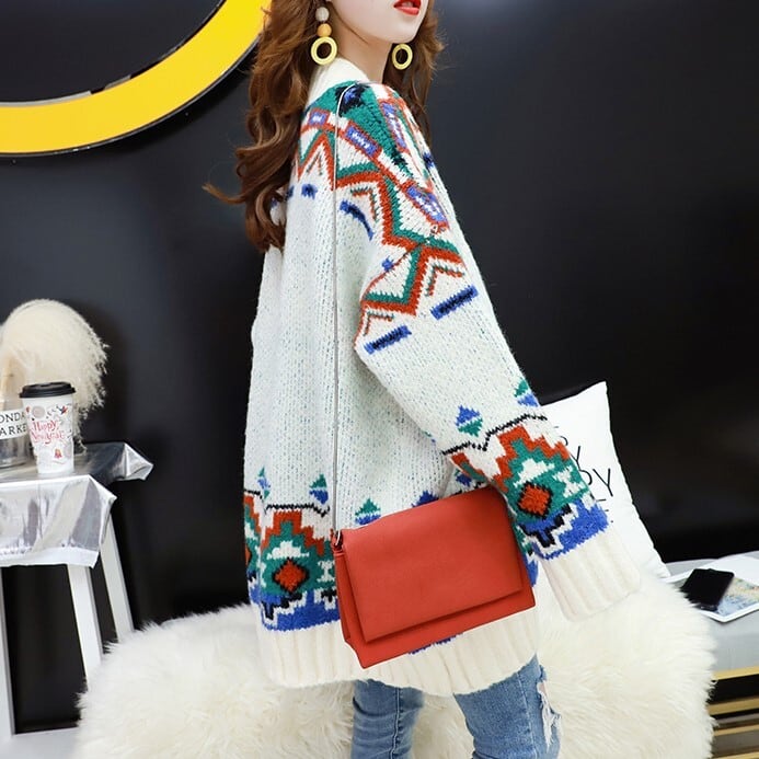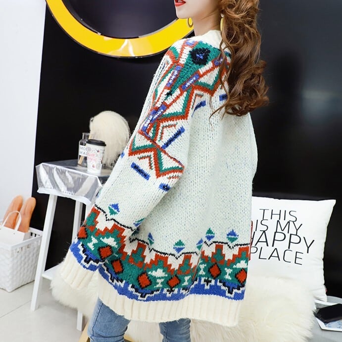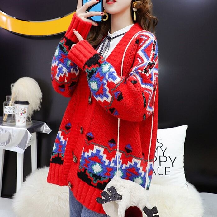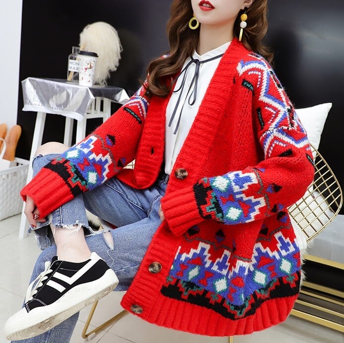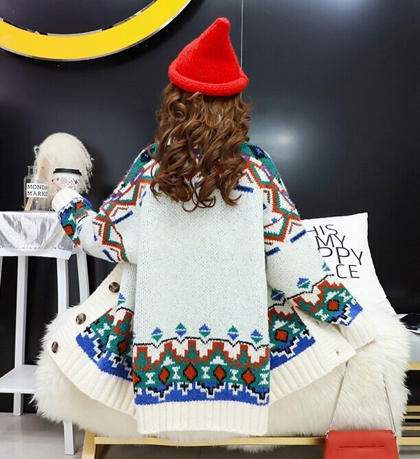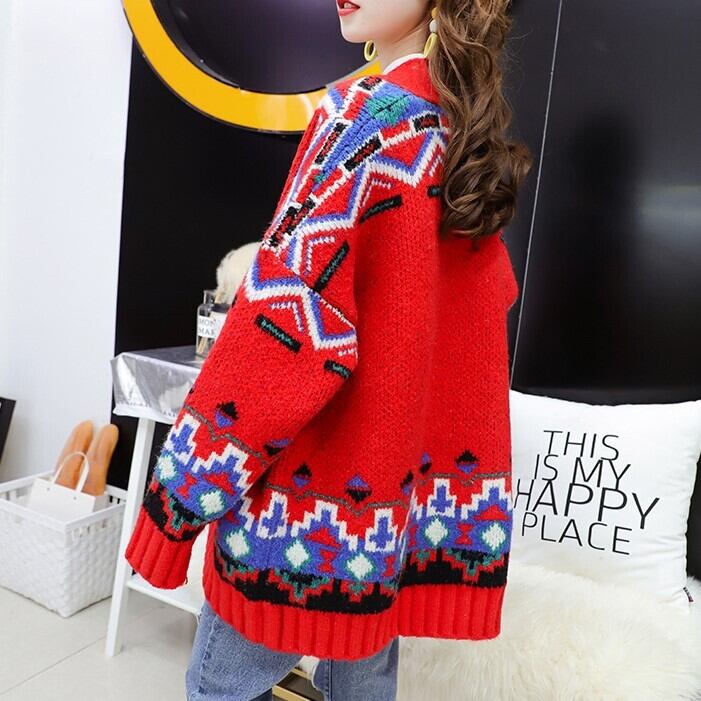 全3色 カーディガン ざっくり オーバーサイズ ノルディック ドロップショルダー 長袖 ミドル丈 レッド ホワイト ブルー 大人かわいい カジュアル 韓国 オルチャン