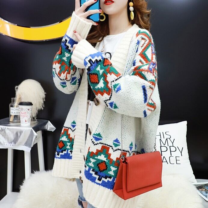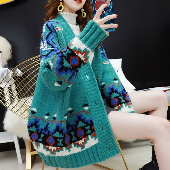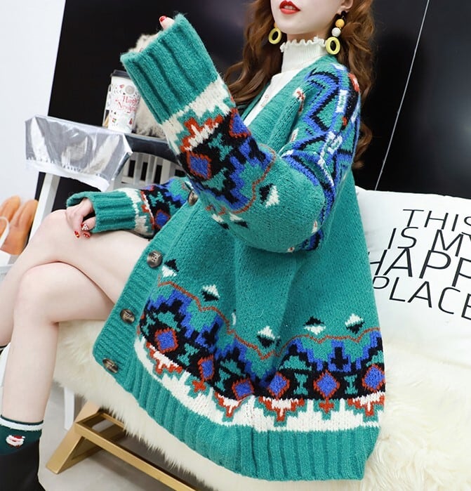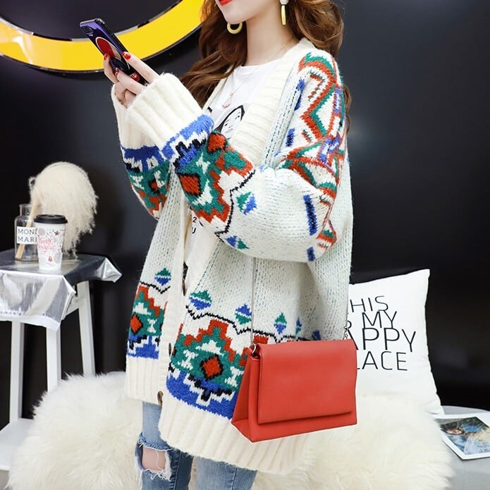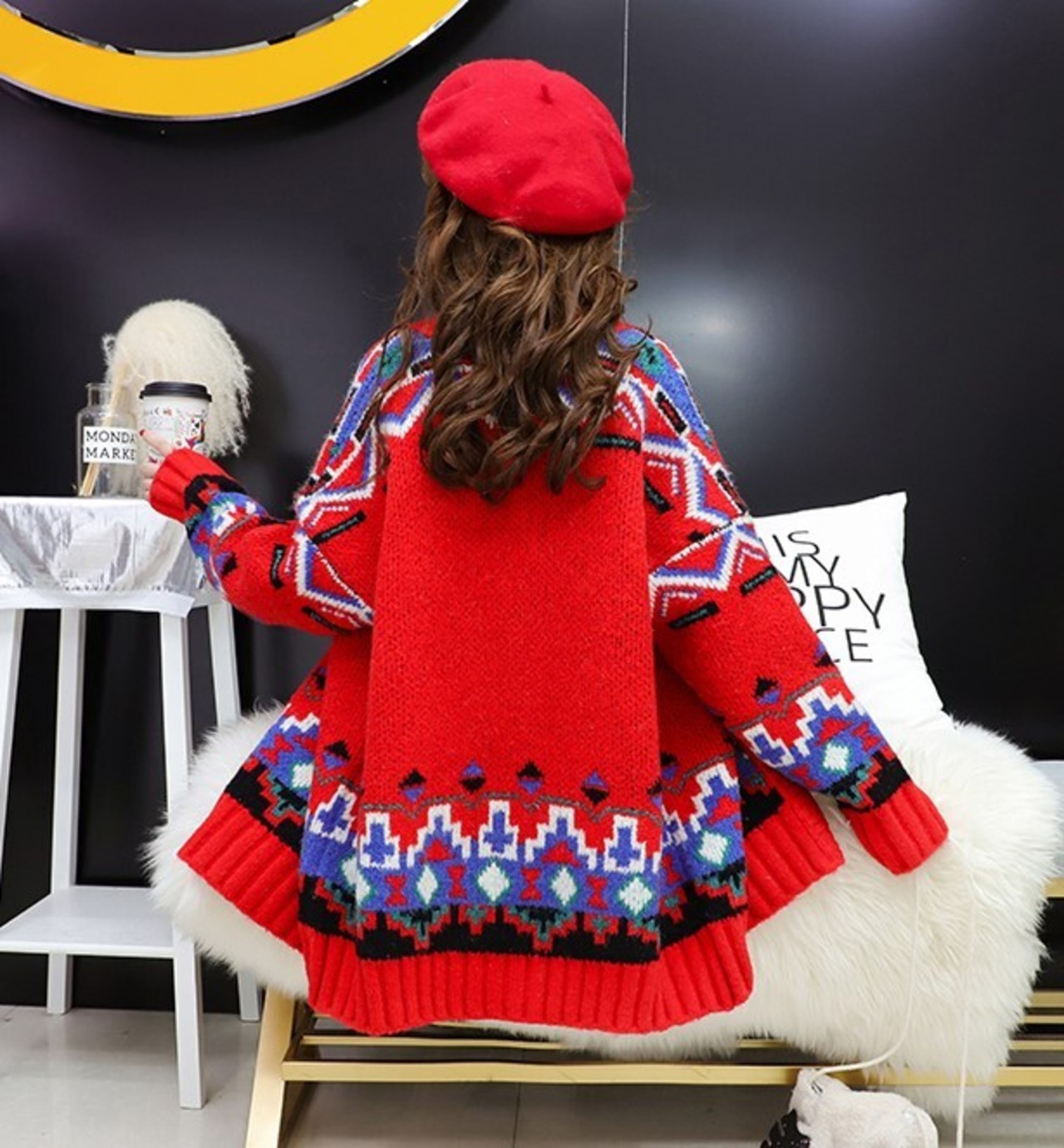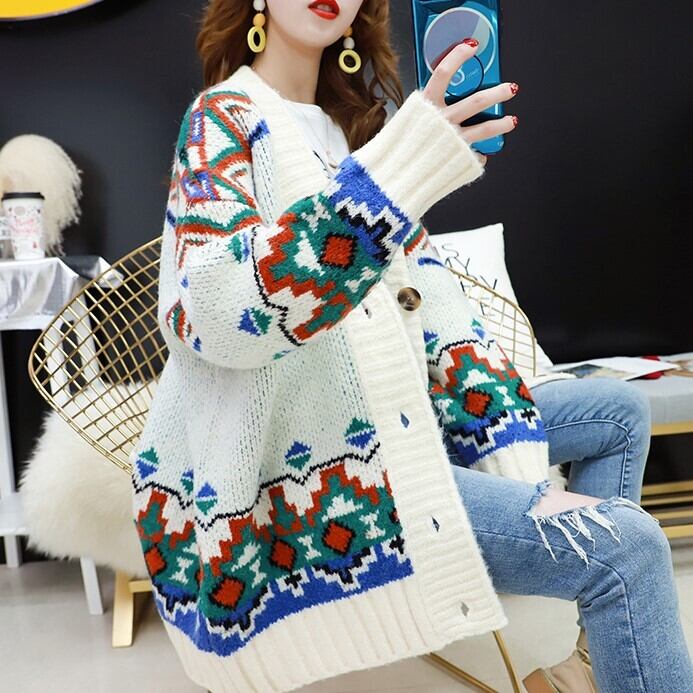全3色 カーディガン ざっくり オーバーサイズ ノルディック ドロップショルダー 長袖 ミドル丈 レッド ホワイト ブルー 大人かわいい カジュアル 韓国 オルチャン