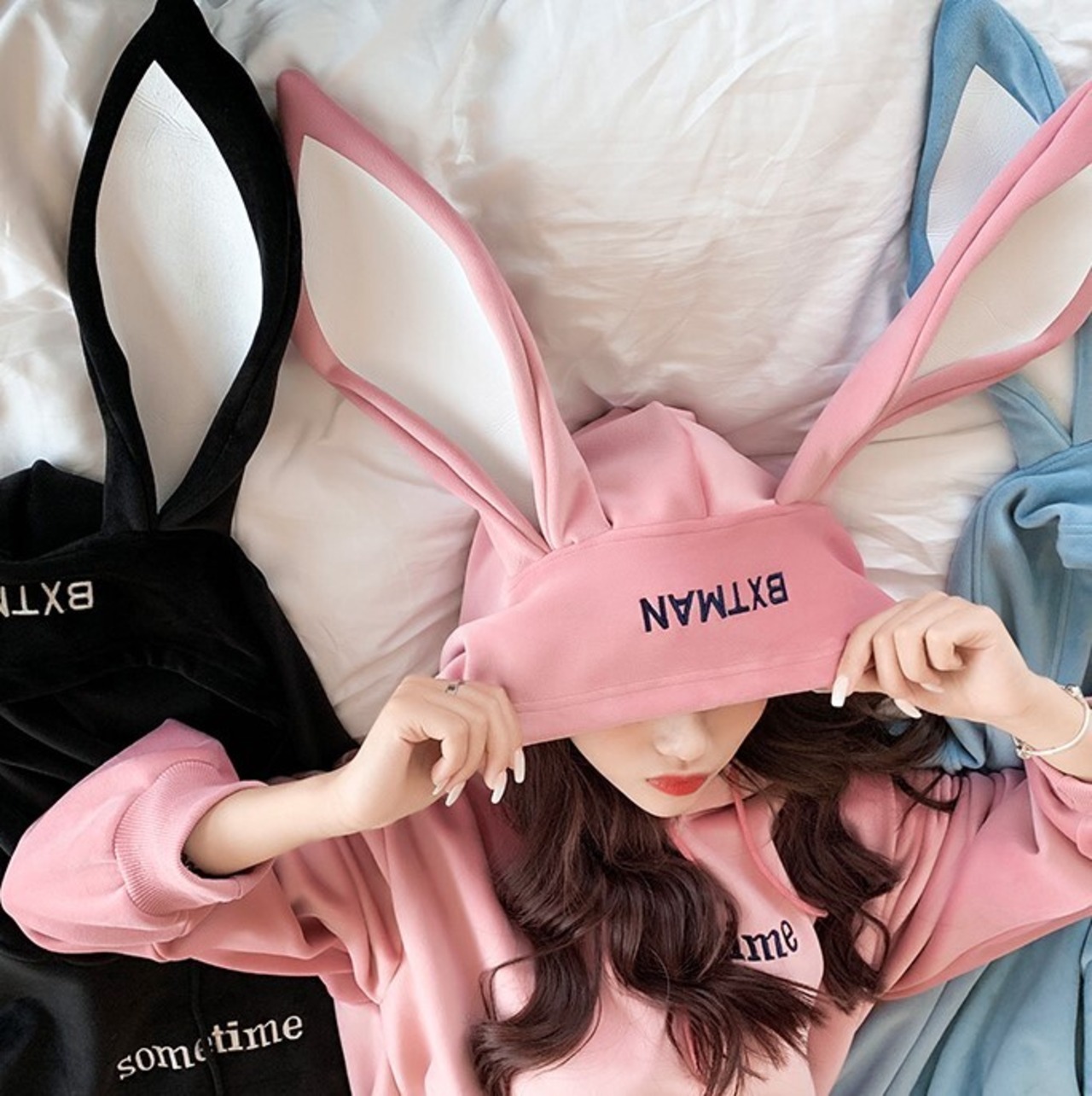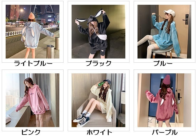 全6色 ウサ耳スウェット パーカー 長袖 ドロップショルダー ホワイト ピンク ブルー ブラック パープル ライトブルー 大人かわいい カジュアル 学生 通学 休日コーデ オーバーサイズ 韓国 オルチャン