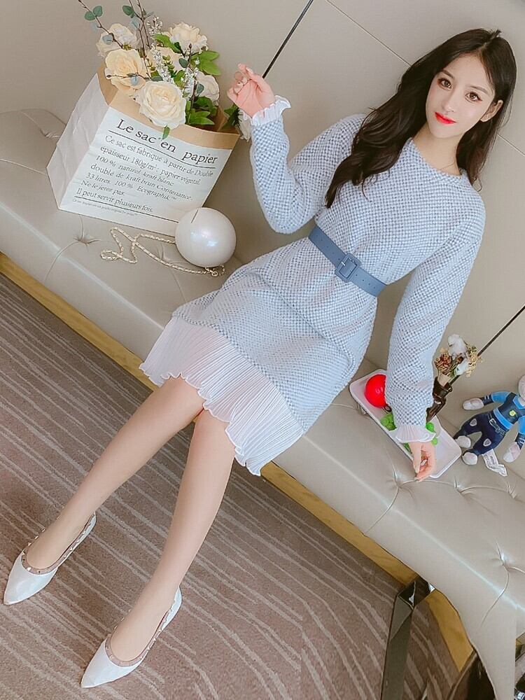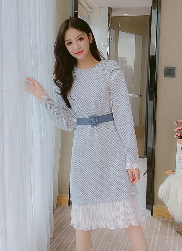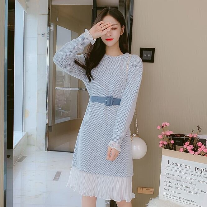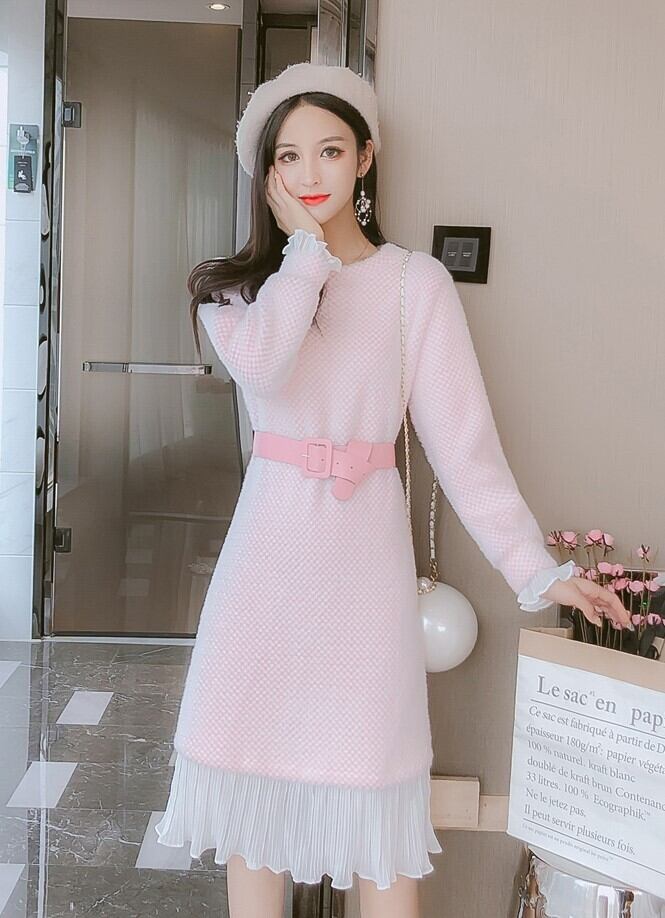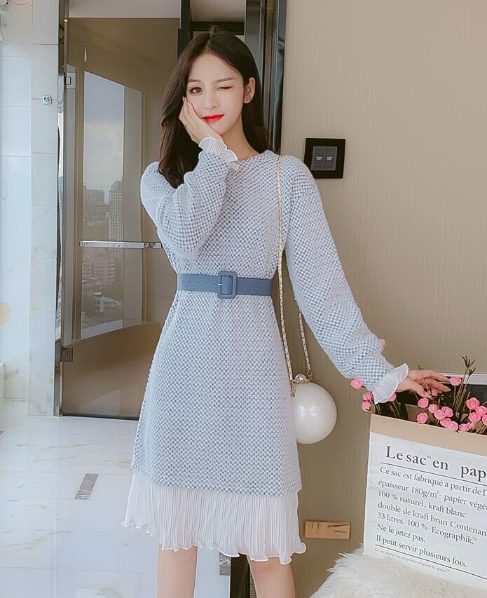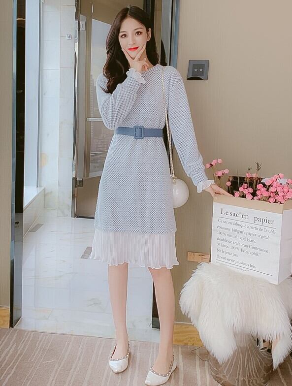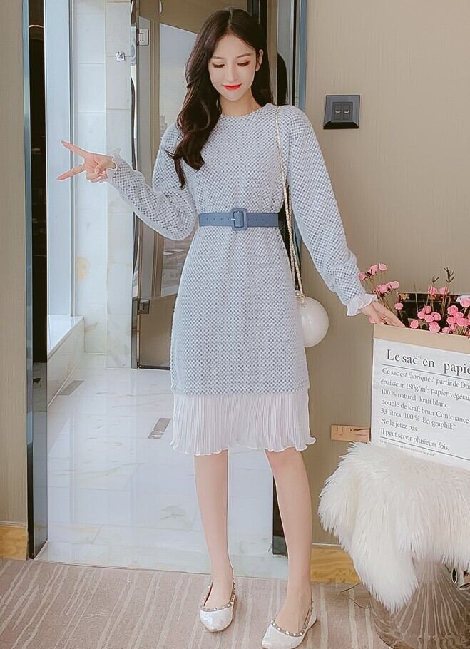 全2色 ニットワンピース ニットドレス ドッキングワンピース プリーツ フリル ラウンドネック 長袖 ブルー ピンク 大人かわいい フェミニン 韓国 オルチャン