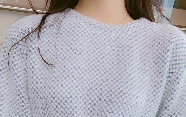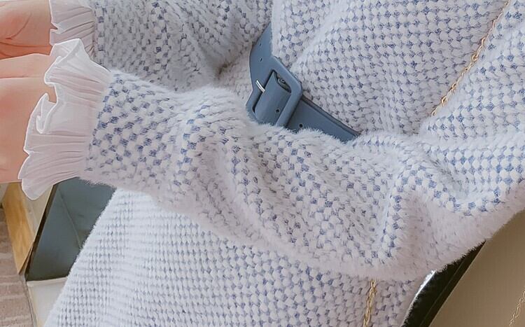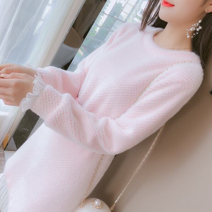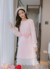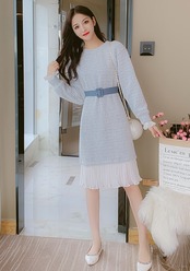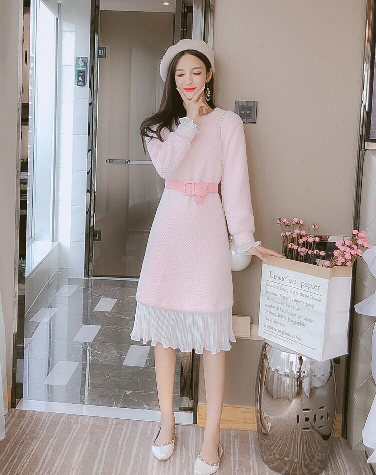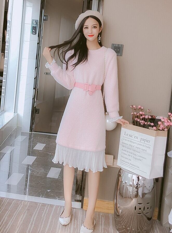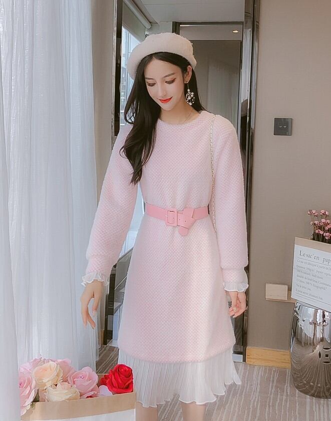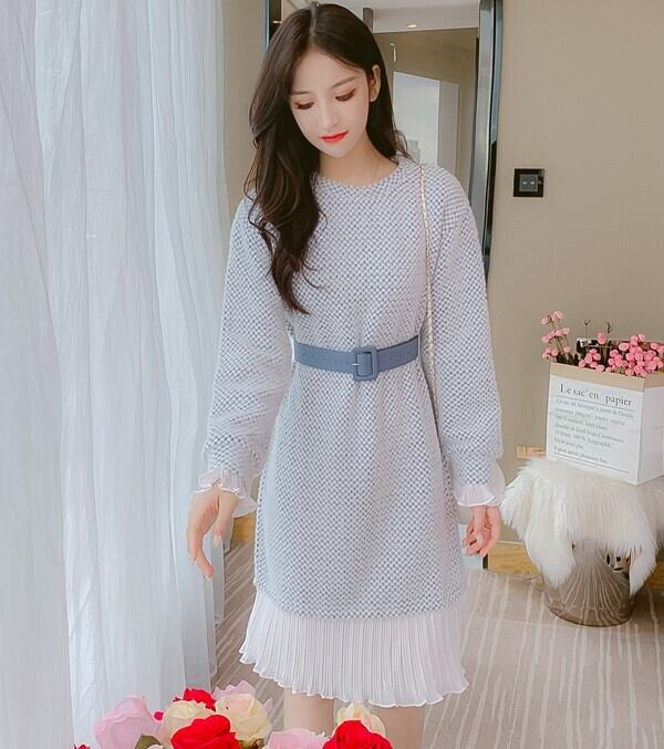 全2色 ニットワンピース ニットドレス ドッキングワンピース プリーツ フリル ラウンドネック 長袖 ブルー ピンク 大人かわいい フェミニン 韓国 オルチャン