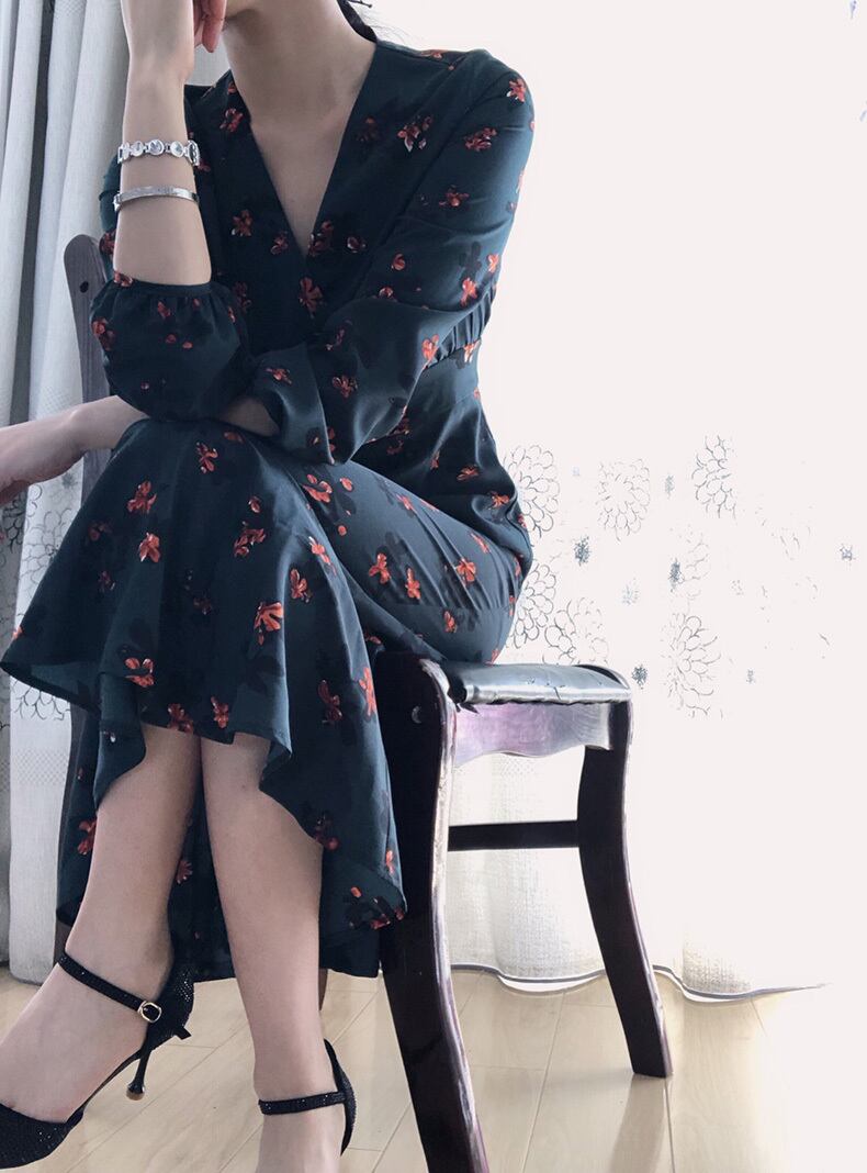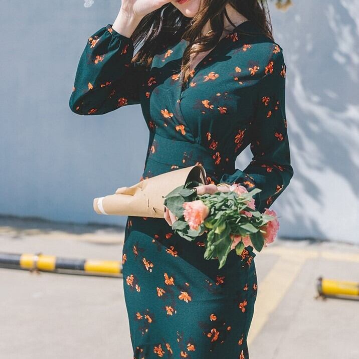 マーメードワンピース カシュクール Vネック 長袖 フィッシュテール 選べる裏起毛 ハイウエスト 上品 エレガント 韓国 オルチャン