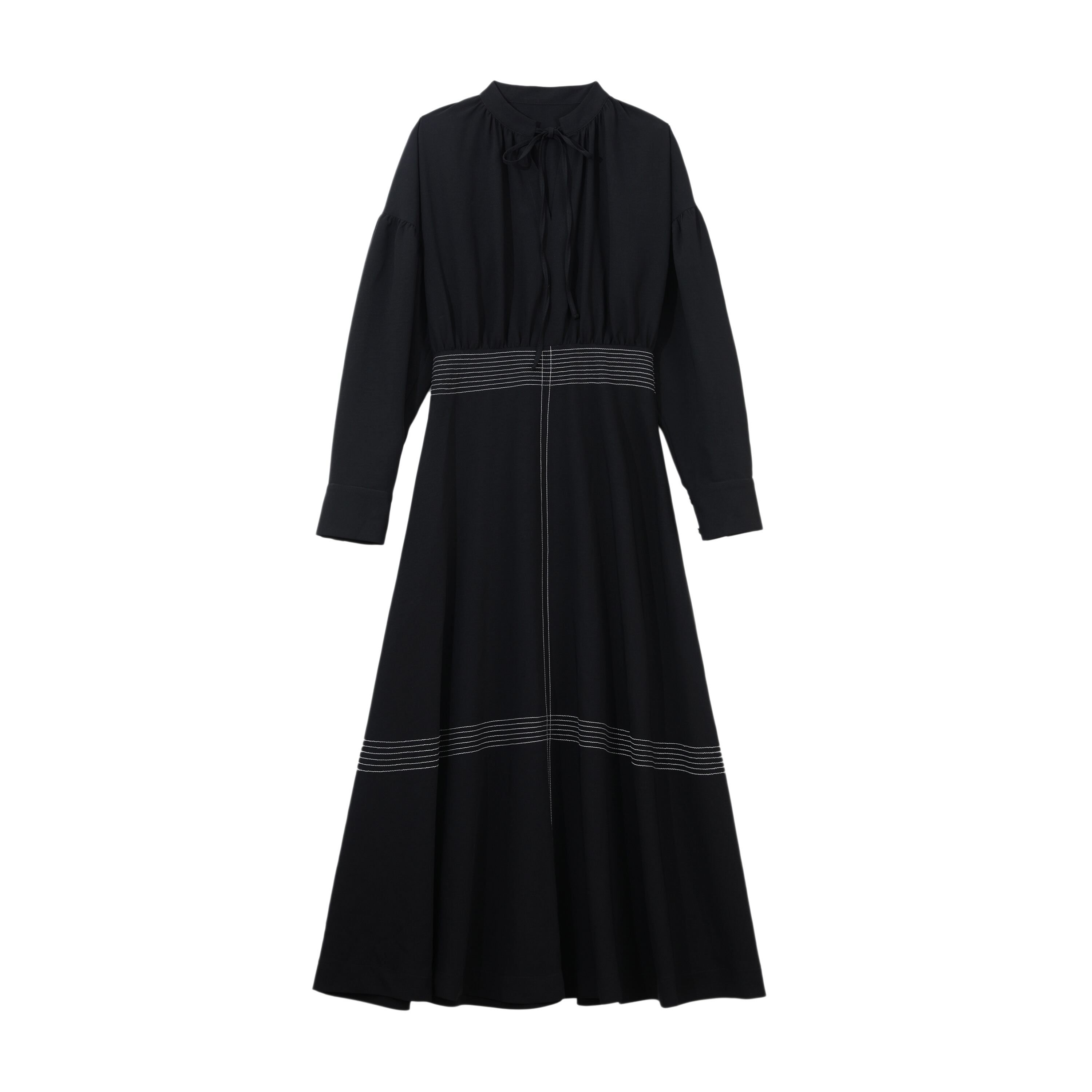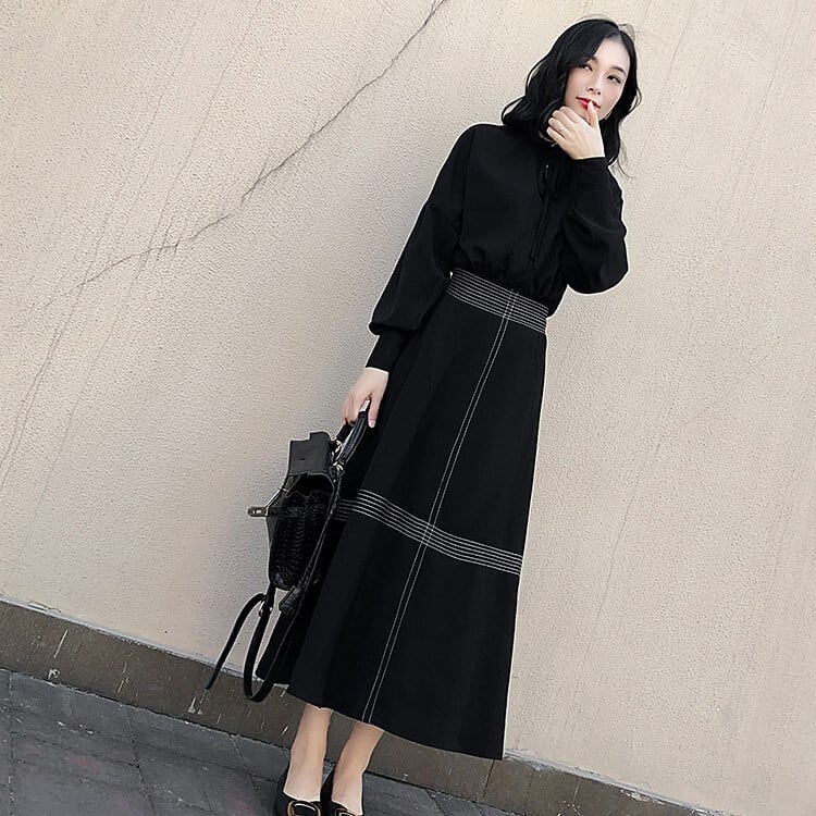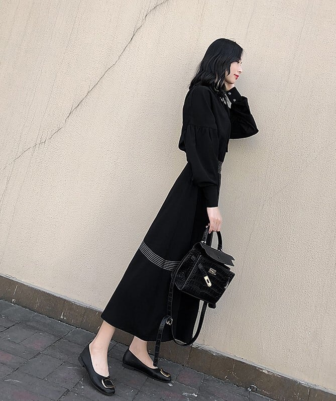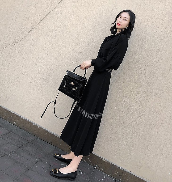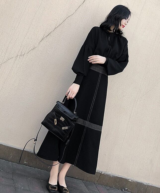 ロングワンピース ブラック ドレス ハイネック 長袖 バルーン袖 エレガント 上品 大人カジュアル 休日コーデ 韓国 オルチャン