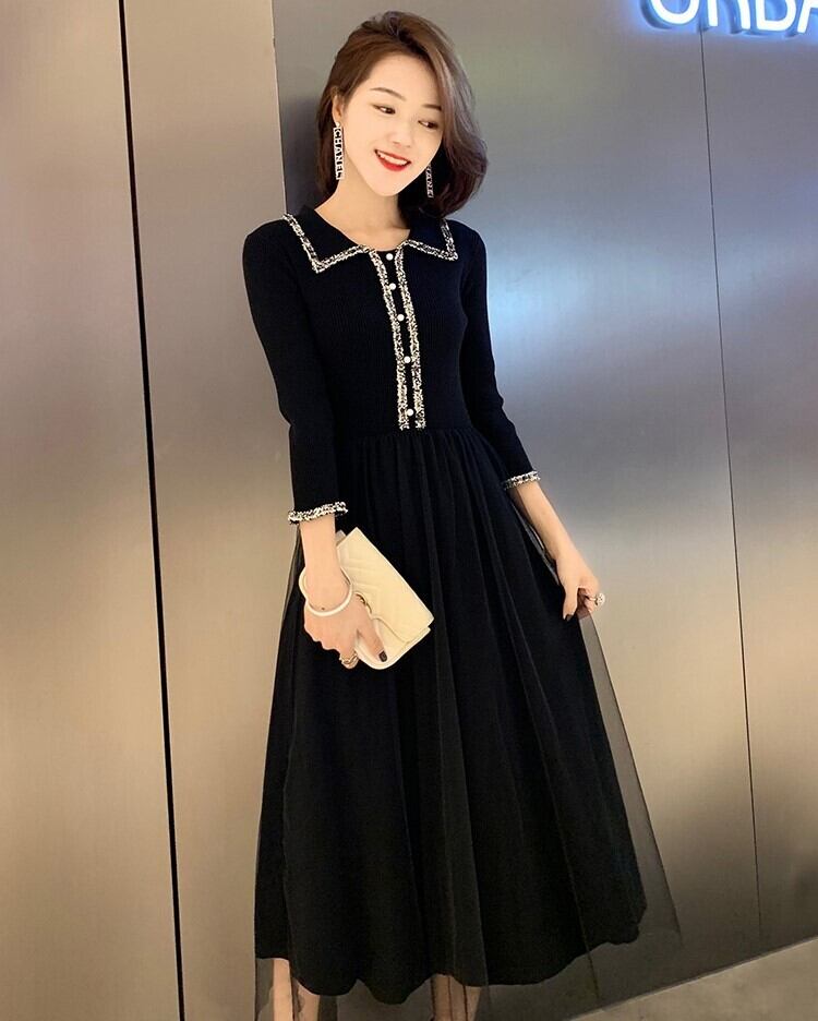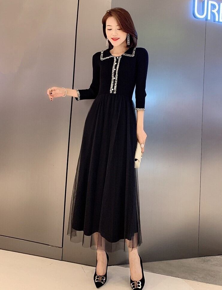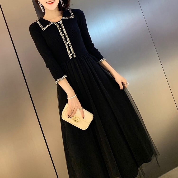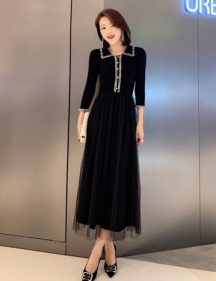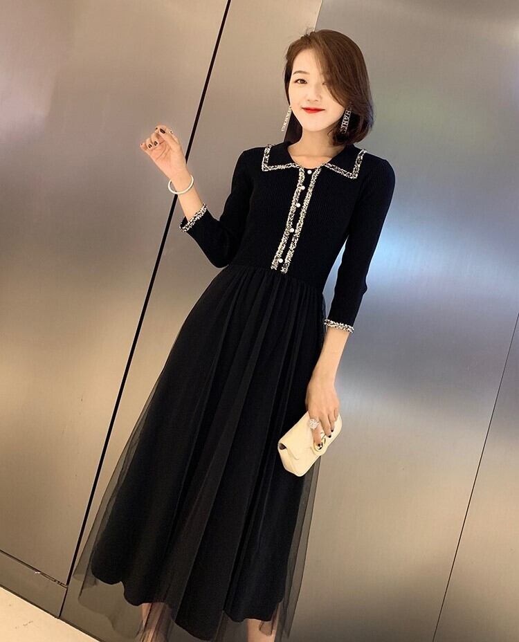 エレガントワンピース ニットドレス ブラックチュール 七分袖 開襟 フロントボタン Aライン 上品 華やか お呼ばれ お出かけ 韓国 オルチャン 秋 冬